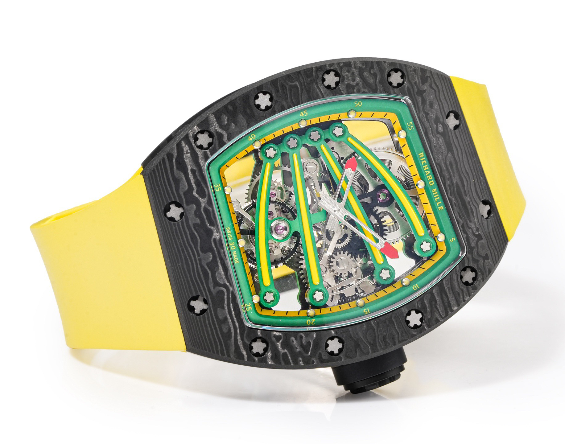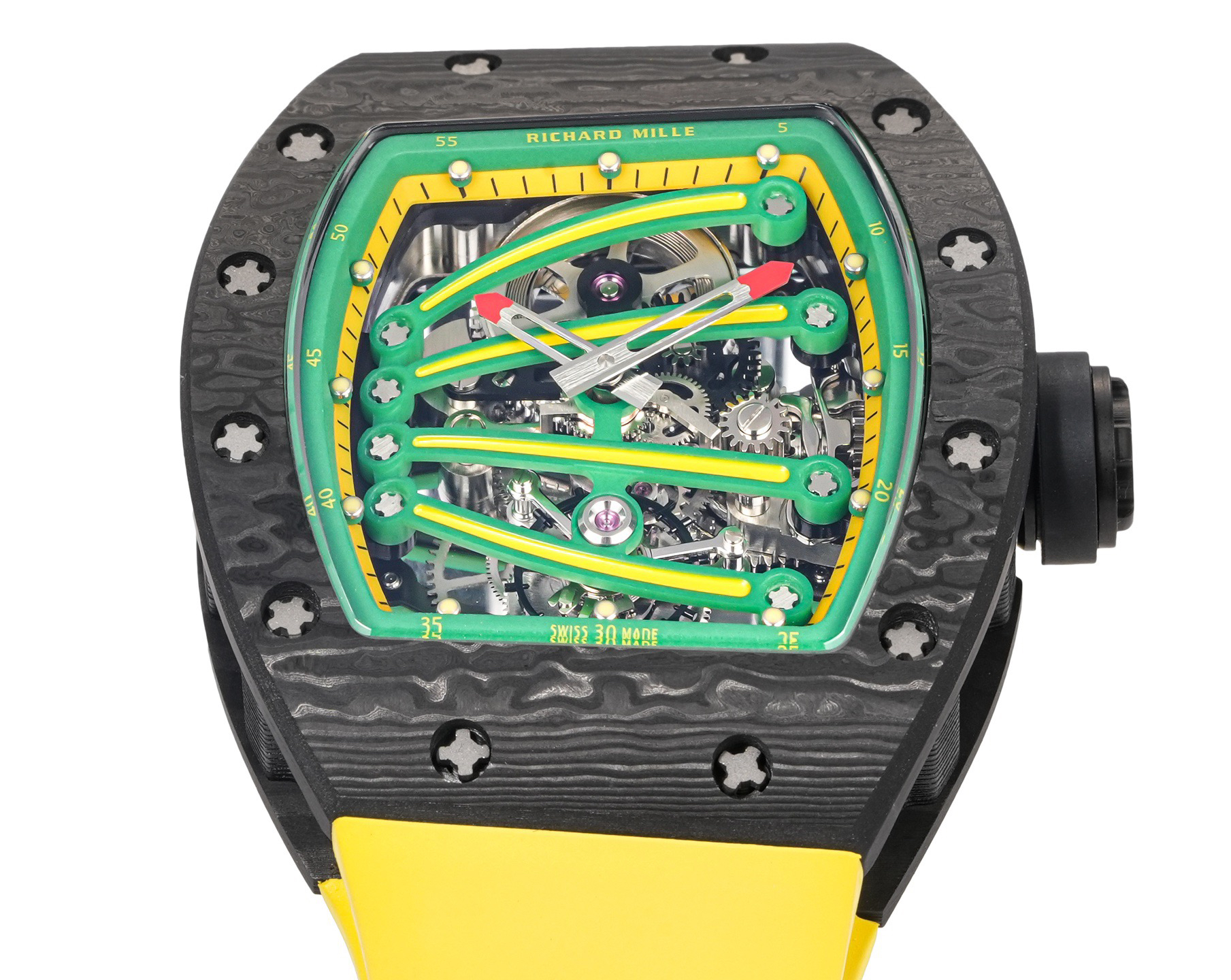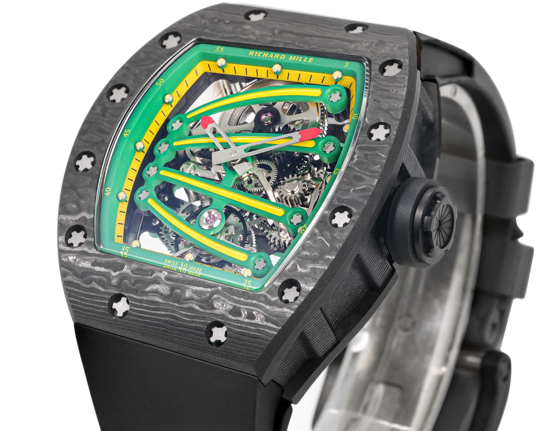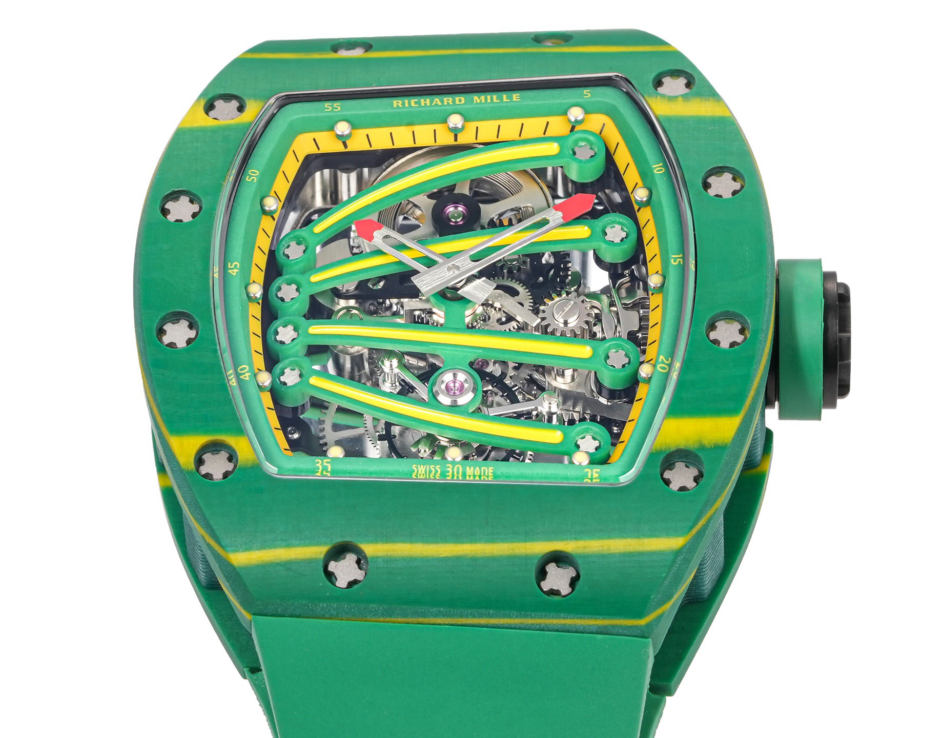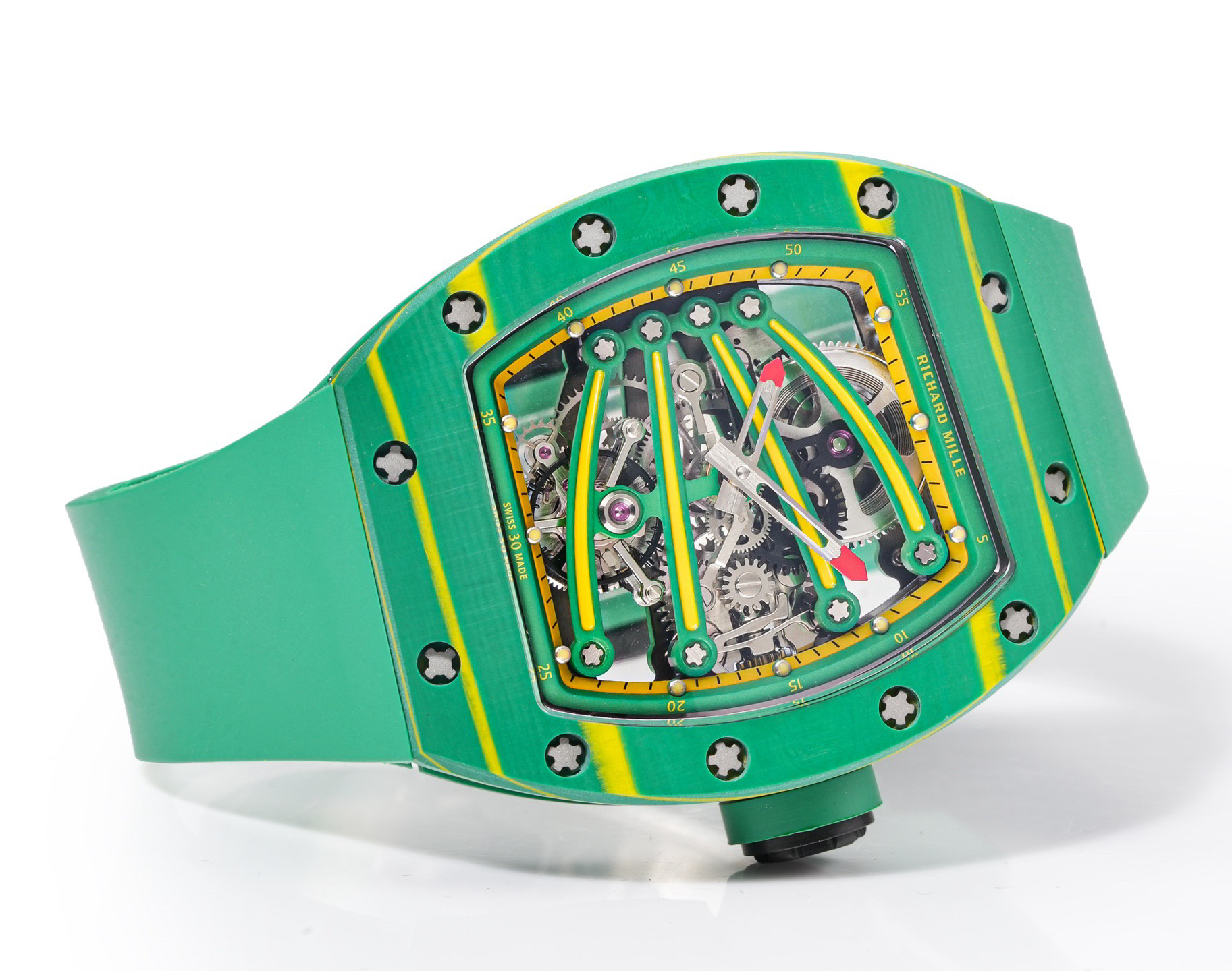 ➕Noob official➕理查德米勒RM59-01陀飞轮 绿蜥蜴 🦎充满独特的标记,以傲人之姿屹立在品牌腕表之间,打造专为运动竞技设计的腕表 1⃣️腕表的表壳,是对Richard Mille钟爱的酒桶型表壳的全新诠释,亦是创新的演绎。表壳2点和5点之间拉长的造型令人惊艳,而这一来避免了表冠与手腕摩擦,且保留了配戴的绝佳舒适感。直径为51.10x 43.10 x 15.20毫米,材质为TPT碳纤维合成物制成,这种材质强度高且轻盈又耐用。2⃣️相信很多人看到这款腕表最先映入眼帘的就是表盘上鲜亮的标志性四爪板桥,板桥具有极佳的柔韧度,将整个机芯紧紧擒住,为减轻外界震动为腕表带来的伤害。3⃣️腕表搭载手动上链陀飞轮机芯,动力储存大约48小时,振频每小时28800次,加上优化的齿轮体系以及可变惯性摆轮,使得这款腕表的性能、规律性以 及动力储存的比例关係达到顶尖的平衡状态。4⃣️腕表采用蓝宝石水晶玻璃设计的表镜,两面防眩处理,厚度为中间1.2毫米,边有1.95毫米。5⃣️腕表胶带为进口材料氟橡胶表带,拥有耐磨性和抗腐蚀性,且配戴起来柔软舒适。Noob official ➕ Richard Miller RM59-01 Tourbillon Green Lizard 🦎 Filled with unique markings, standing proudly among the brand's watches, creating a watch specifically designed for sports competitions ⃣ The watch case is a new interpretation and innovative interpretation of Richard Mille's beloved barrel shaped case. The elongated shape between the 2-point and 5-point of the watch case is stunning, while avoiding friction between the crown and wrist and retaining excellent comfort during wear. The diameter is 51.10 x 43.10 x 15.20 millimeters, made of TPT carbon fiber composite material, which has high strength, lightweight and durability. two ⃣ I believe that the first thing that catches the eye of many people when they see this watch is the bright and iconic four claw bridge on the dial. The bridge has excellent flexibility, tightly grasping the entire movement to reduce the damage caused by external vibrations to the watch. three ⃣ The watch is equipped with a manually wound tourbillon movement, with a power reserve of approximately 48 hours and a frequency of 28800 vibrations per hour. Coupled with an optimized gear system and variable inertia balance wheel, the performance, regularity, and power reserve ratio of this watch reach a top-notch balance state. four ⃣ The watch features a sapphire crystal glass design with anti glare treatment on both sides, with a thickness of 1.2 millimeters in the middle and 1.95 millimeters on the edges. five ⃣ The watch tape is made of imported fluororubber strap, which has wear resistance and corrosion resistance, and is soft and comfortable to wear.