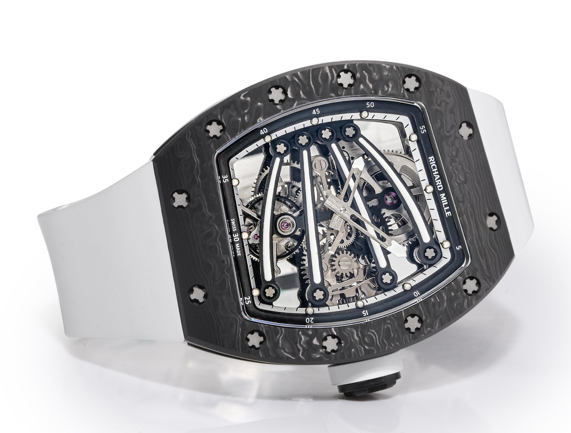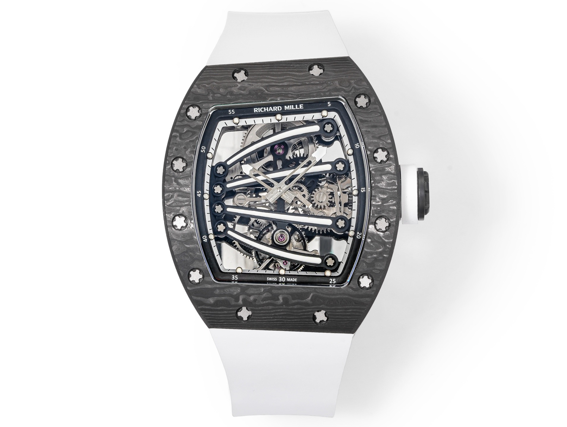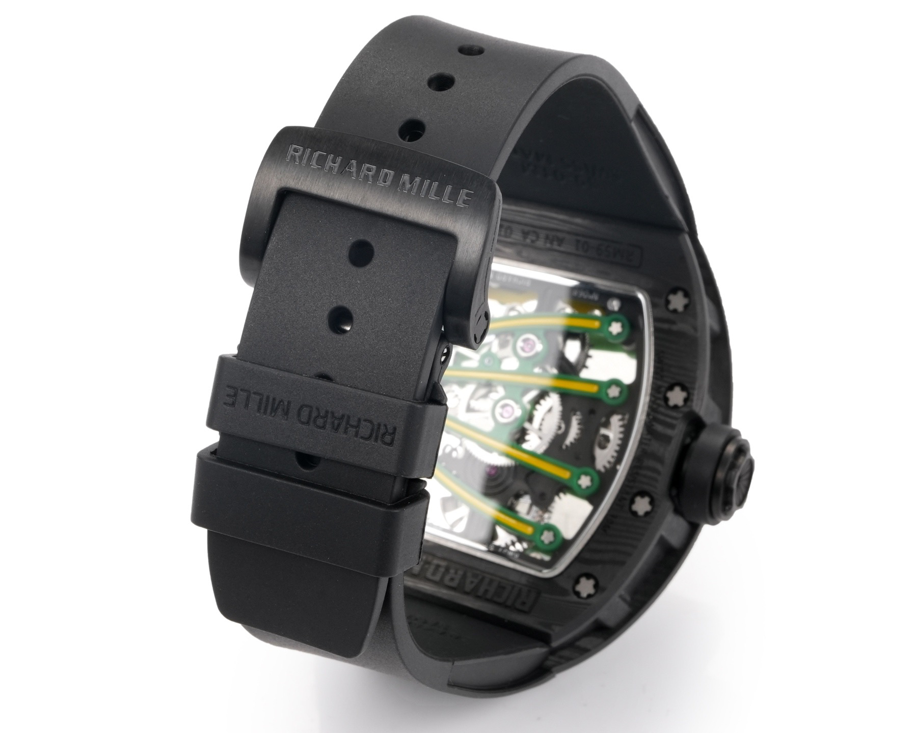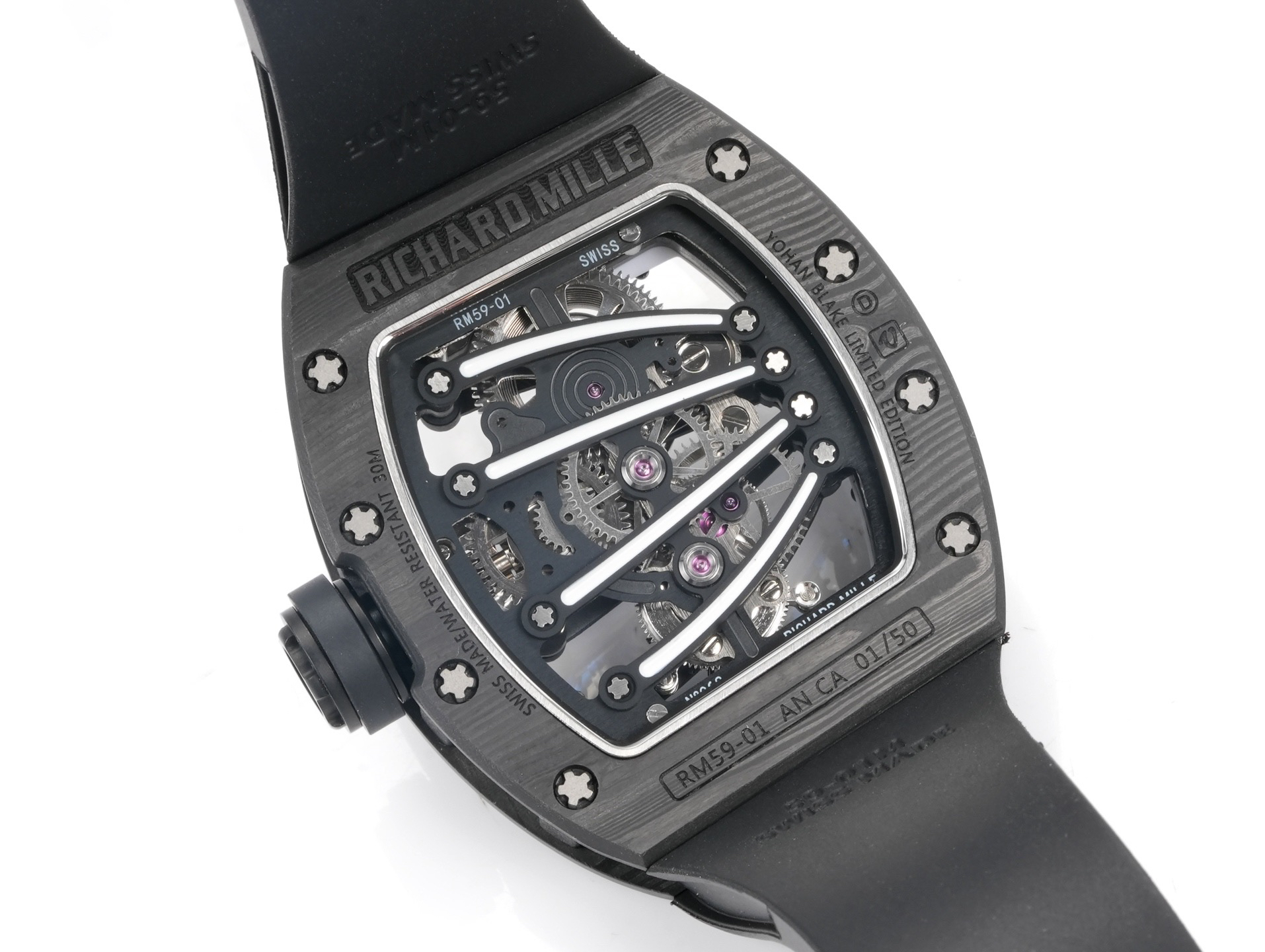 ➕Noob official➕理查德米勒RM59-01陀飞轮 绿蜥蜴 🦎充满独特的标记,以傲人之姿屹立在品牌腕表之间,打造专为运动竞技设计的腕表 1⃣️腕表的表壳,是对Richard Mille钟爱的酒桶型表壳的全新诠释,亦是创新的演绎。表壳2点和5点之间拉长的造型令人惊艳,而这一来避免了表冠与手腕摩擦,且保留了配戴的绝佳舒适感。直径为51.10x 43.10 x 15.20毫米,材质为TPT碳纤维合成物制成,这种材质强度高且轻盈又耐用。2⃣️相信很多人看到这款腕表最先映入眼帘的就是表盘上鲜亮的标志性四爪板桥,板桥具有极佳的柔韧度,将整个机芯紧紧擒住,为减轻外界震动为腕表带来的伤害。3⃣️腕表搭载手动上链陀飞轮机芯,动力储存大约48小时,振频每小时28800次,加上优化的齿轮体系以及可变惯性摆轮,使得这款腕表的性能、规律性以 及动力储存的比例关係达到顶尖的平衡状态。4⃣️腕表采用蓝宝石水晶玻璃设计的表镜,两面防眩处理,厚度为中间1.2毫米,边有1.95毫米。5⃣️腕表胶带为进口材料氟橡胶表带,拥有耐磨性和抗腐蚀性,且配戴起来柔软舒适。Noob official ➕ Richard Miller RM59-01 Tourbillon Green Lizard 🦎 Filled with unique markings, standing proudly among the brand's watches, creating a watch specifically designed for sports competitions ⃣ The watch case is a new interpretation and innovative interpretation of Richard Mille's beloved barrel shaped case. The elongated shape between the 2-point and 5-point of the watch case is stunning, while avoiding friction between the crown and wrist and retaining excellent comfort during wear. The diameter is 51.10 x 43.10 x 15.20 millimeters, made of TPT carbon fiber composite material, which has high strength, lightweight and durability. two ⃣ I believe that the first thing that catches the eye of many people when they see this watch is the bright and iconic four claw bridge on the dial. The bridge has excellent flexibility, tightly grasping the entire movement to reduce the damage caused by external vibrations to the watch. three ⃣ The watch is equipped with a manually wound tourbillon movement, with a power reserve of approximately 48 hours and a frequency of 28800 vibrations per hour. Coupled with an optimized gear system and variable inertia balance wheel, the performance, regularity, and power reserve ratio of this watch reach a top-notch balance state. four ⃣ The watch features a sapphire crystal glass design with anti glare treatment on both sides, with a thickness of 1.2 millimeters in the middle and 1.95 millimeters on the edges. five ⃣ The watch tape is made of imported fluororubber strap, which has wear resistance and corrosion resistance, and is soft and comfortable to wear.