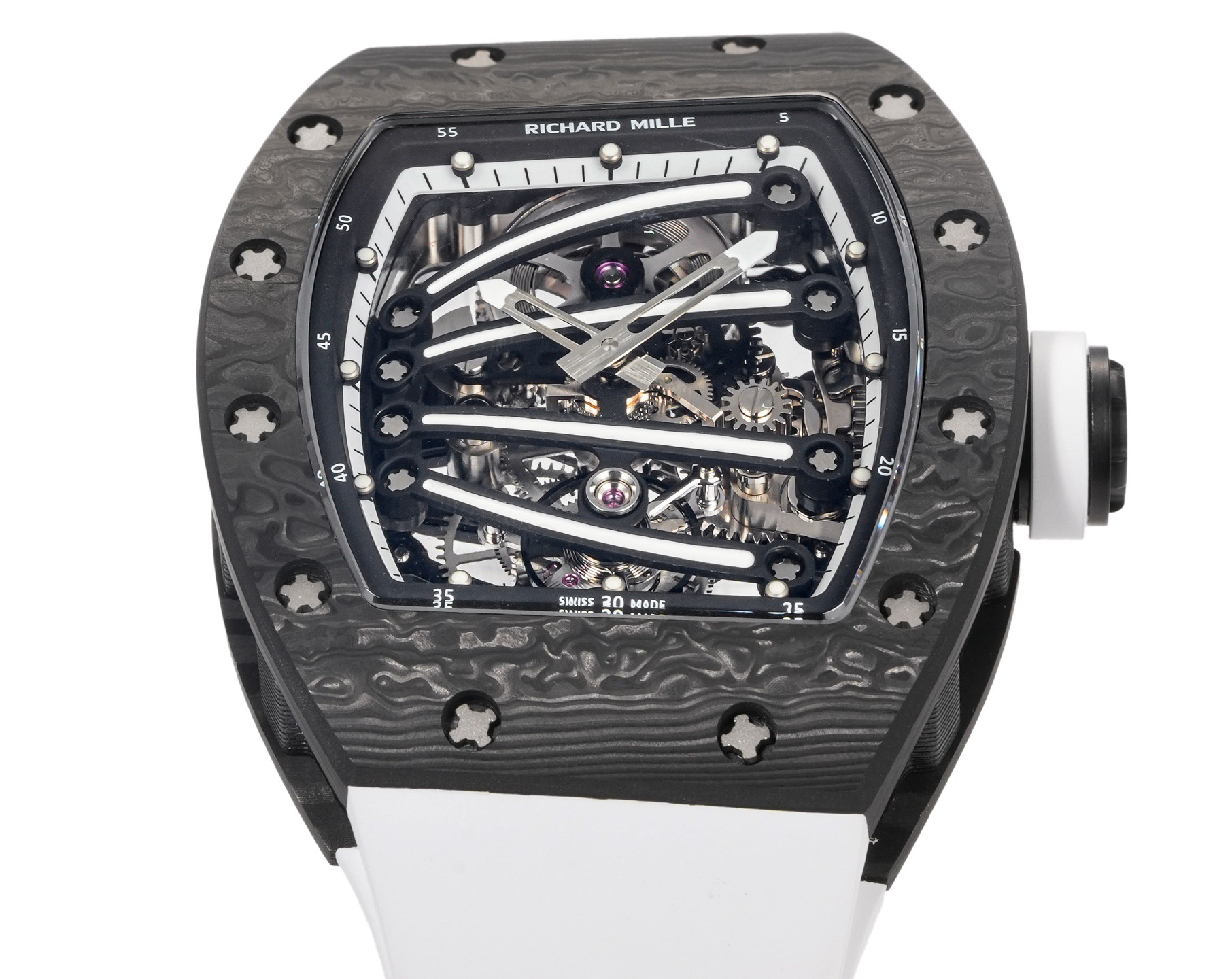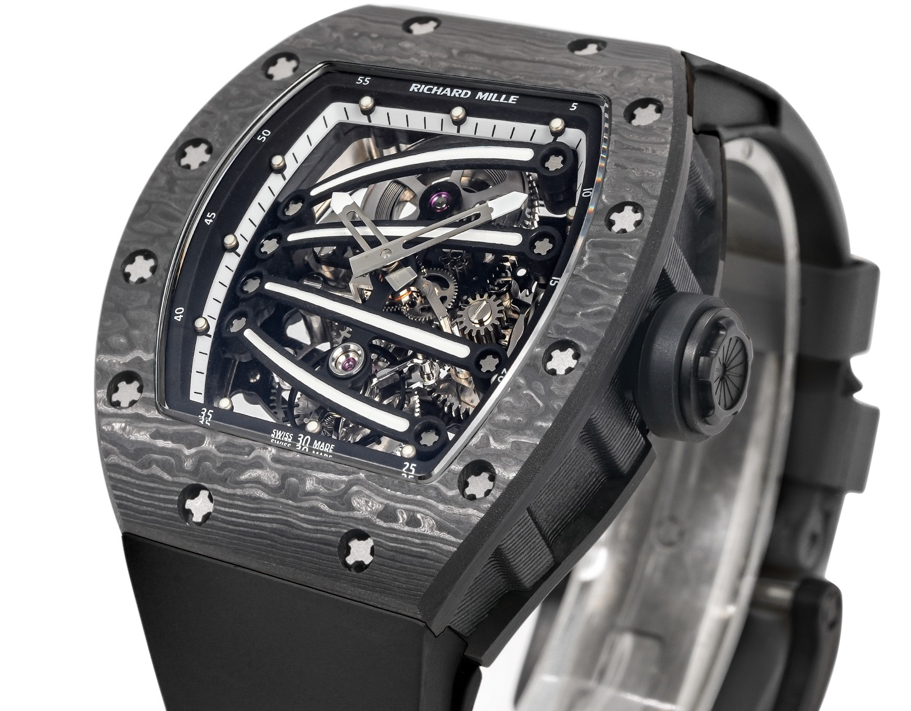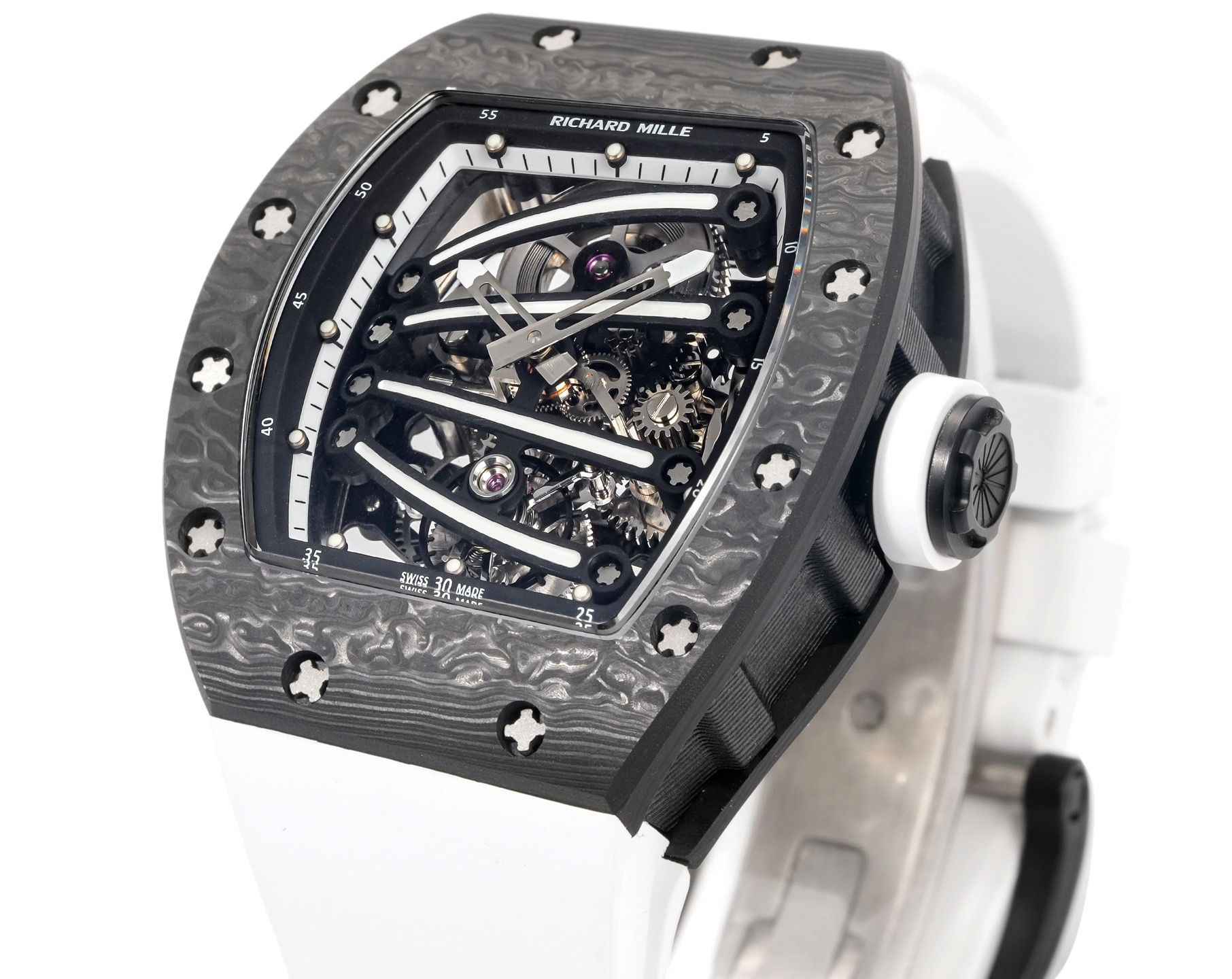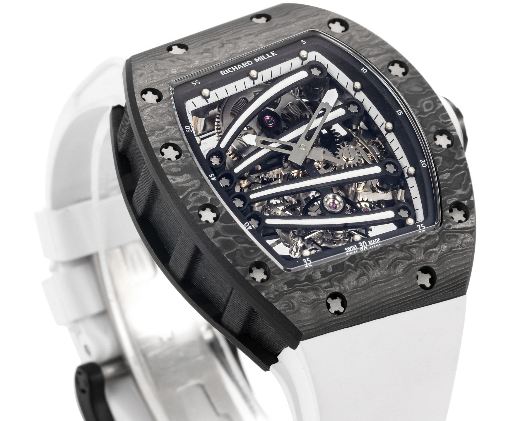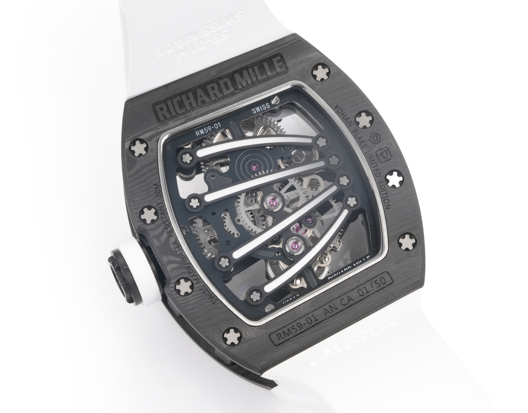 ➕Noob official➕理查德米勒RM59-01陀飞轮 绿蜥蜴 🦎充满独特的标记,以傲人之姿屹立在品牌腕表之间,打造专为运动竞技设计的腕表 1⃣️腕表的表壳,是对Richard Mille钟爱的酒桶型表壳的全新诠释,亦是创新的演绎。表壳2点和5点之间拉长的造型令人惊艳,而这一来避免了表冠与手腕摩擦,且保留了配戴的绝佳舒适感。直径为51.10x 43.10 x 15.20毫米,材质为TPT碳纤维合成物制成,这种材质强度高且轻盈又耐用。2⃣️相信很多人看到这款腕表最先映入眼帘的就是表盘上鲜亮的标志性四爪板桥,板桥具有极佳的柔韧度,将整个机芯紧紧擒住,为减轻外界震动为腕表带来的伤害。3⃣️腕表搭载手动上链陀飞轮机芯,动力储存大约48小时,振频每小时28800次,加上优化的齿轮体系以及可变惯性摆轮,使得这款腕表的性能、规律性以 及动力储存的比例关係达到顶尖的平衡状态。4⃣️腕表采用蓝宝石水晶玻璃设计的表镜,两面防眩处理,厚度为中间1.2毫米,边有1.95毫米。5⃣️腕表胶带为进口材料氟橡胶表带,拥有耐磨性和抗腐蚀性,且配戴起来柔软舒适。Noob official ➕ Richard Miller RM59-01 Tourbillon Green Lizard 🦎 Filled with unique markings, standing proudly among the brand's watches, creating a watch specifically designed for sports competitions ⃣ The watch case is a new interpretation and innovative interpretation of Richard Mille's beloved barrel shaped case. The elongated shape between the 2-point and 5-point of the watch case is stunning, while avoiding friction between the crown and wrist and retaining excellent comfort during wear. The diameter is 51.10 x 43.10 x 15.20 millimeters, made of TPT carbon fiber composite material, which has high strength, lightweight and durability. two ⃣ I believe that the first thing that catches the eye of many people when they see this watch is the bright and iconic four claw bridge on the dial. The bridge has excellent flexibility, tightly grasping the entire movement to reduce the damage caused by external vibrations to the watch. three ⃣ The watch is equipped with a manually wound tourbillon movement, with a power reserve of approximately 48 hours and a frequency of 28800 vibrations per hour. Coupled with an optimized gear system and variable inertia balance wheel, the performance, regularity, and power reserve ratio of this watch reach a top-notch balance state. four ⃣ The watch features a sapphire crystal glass design with anti glare treatment on both sides, with a thickness of 1.2 millimeters in the middle and 1.95 millimeters on the edges. five ⃣ The watch tape is made of imported fluororubber strap, which has wear resistance and corrosion resistance, and is soft and comfortable to wear.