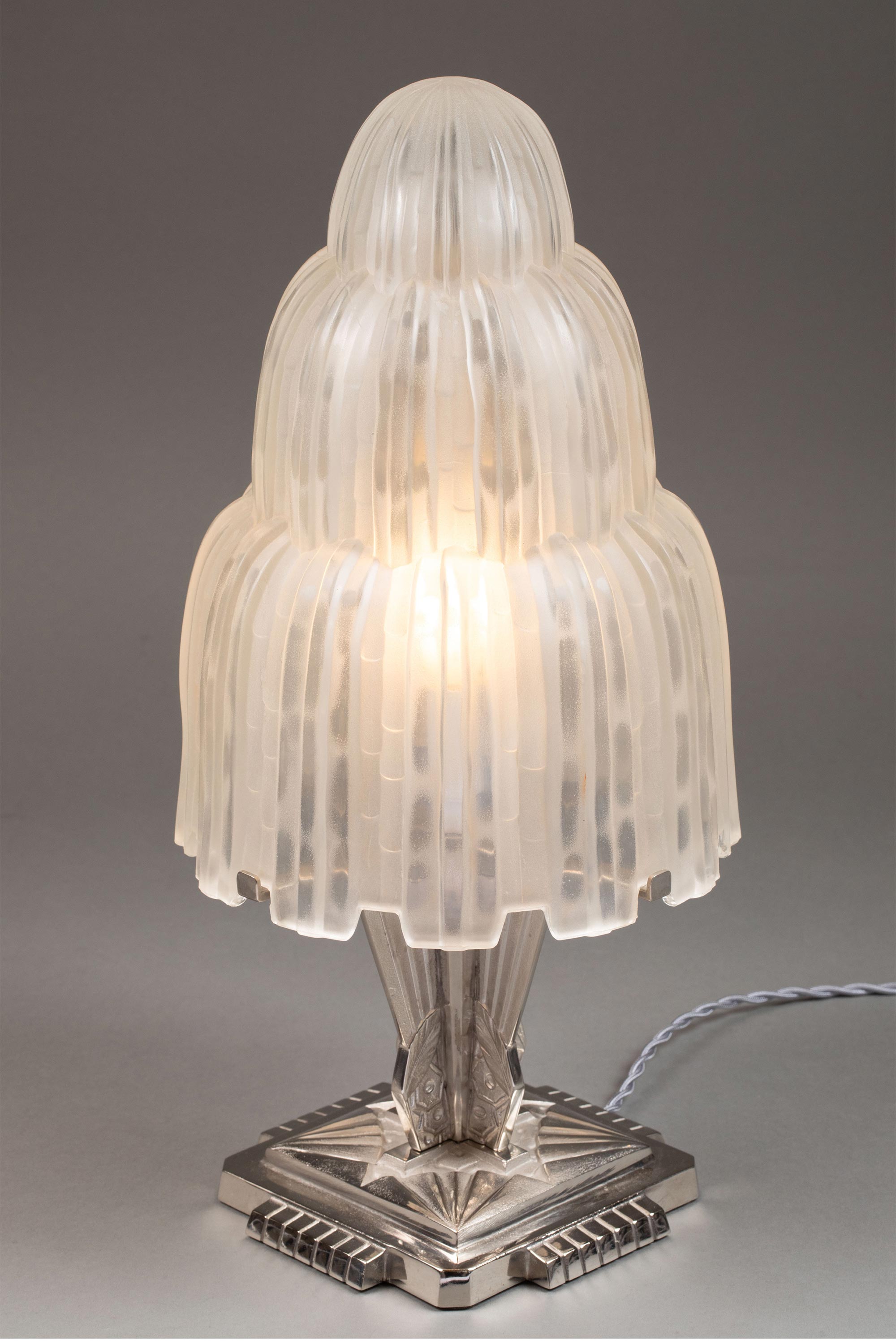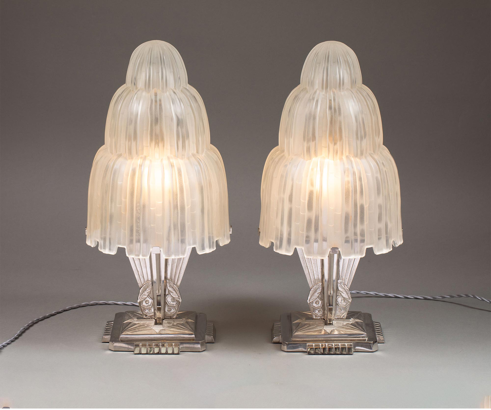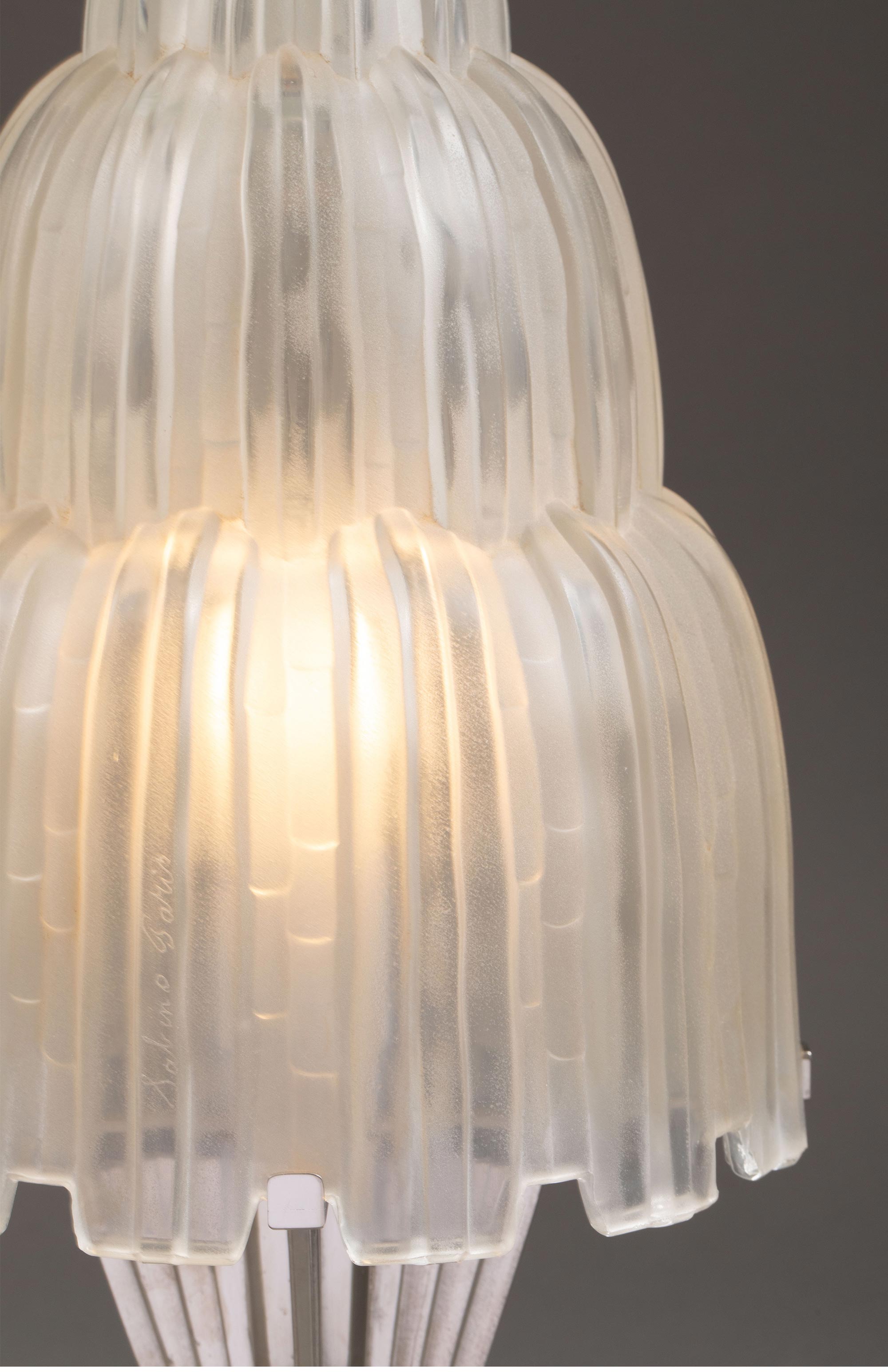 1930年代法国著名水晶品牌Sabino出品装饰艺术风格镀镍青铜灯柱装饰Cascade瀑布款乳色灯罩水晶台灯一对