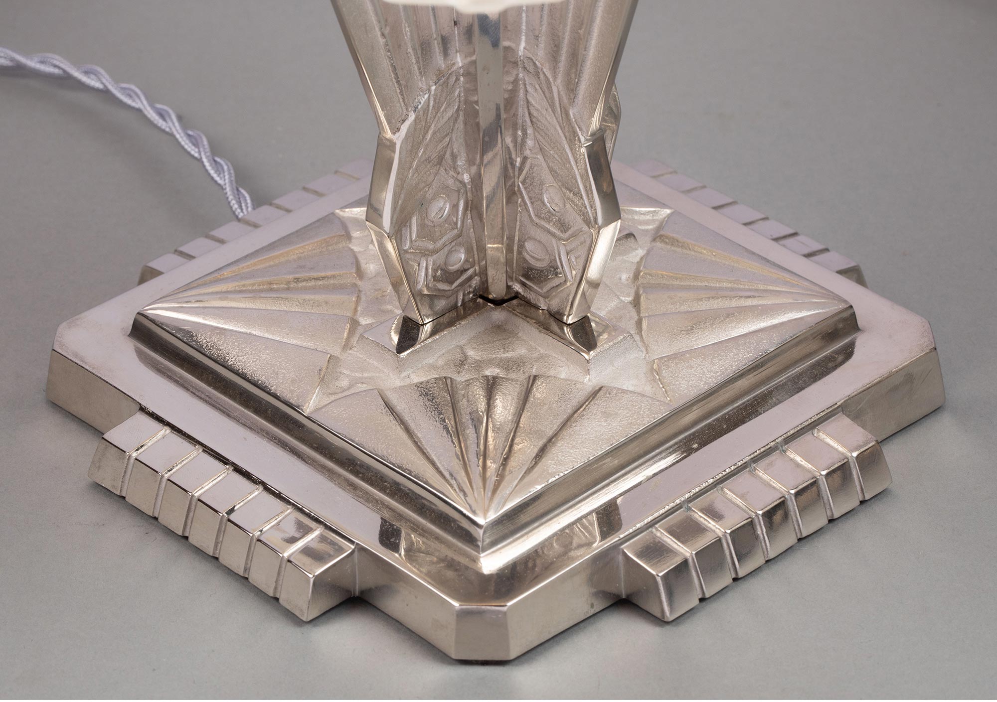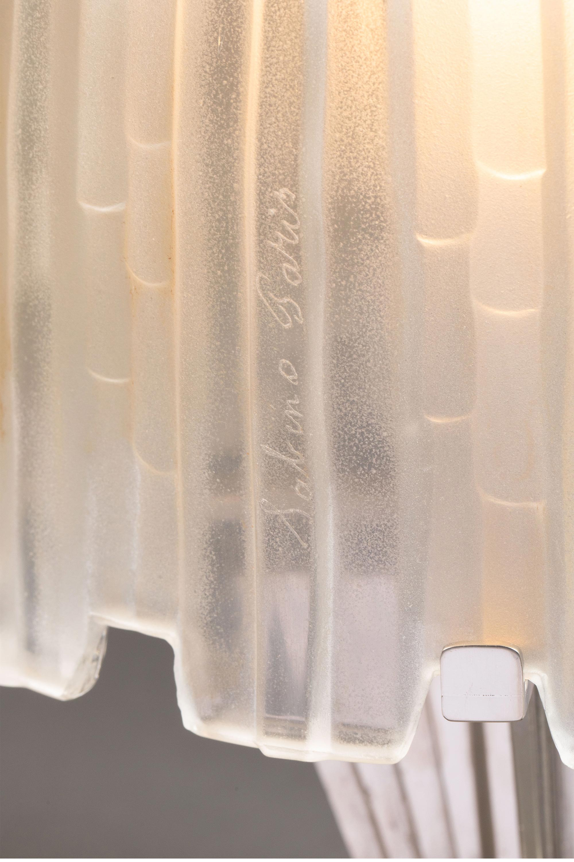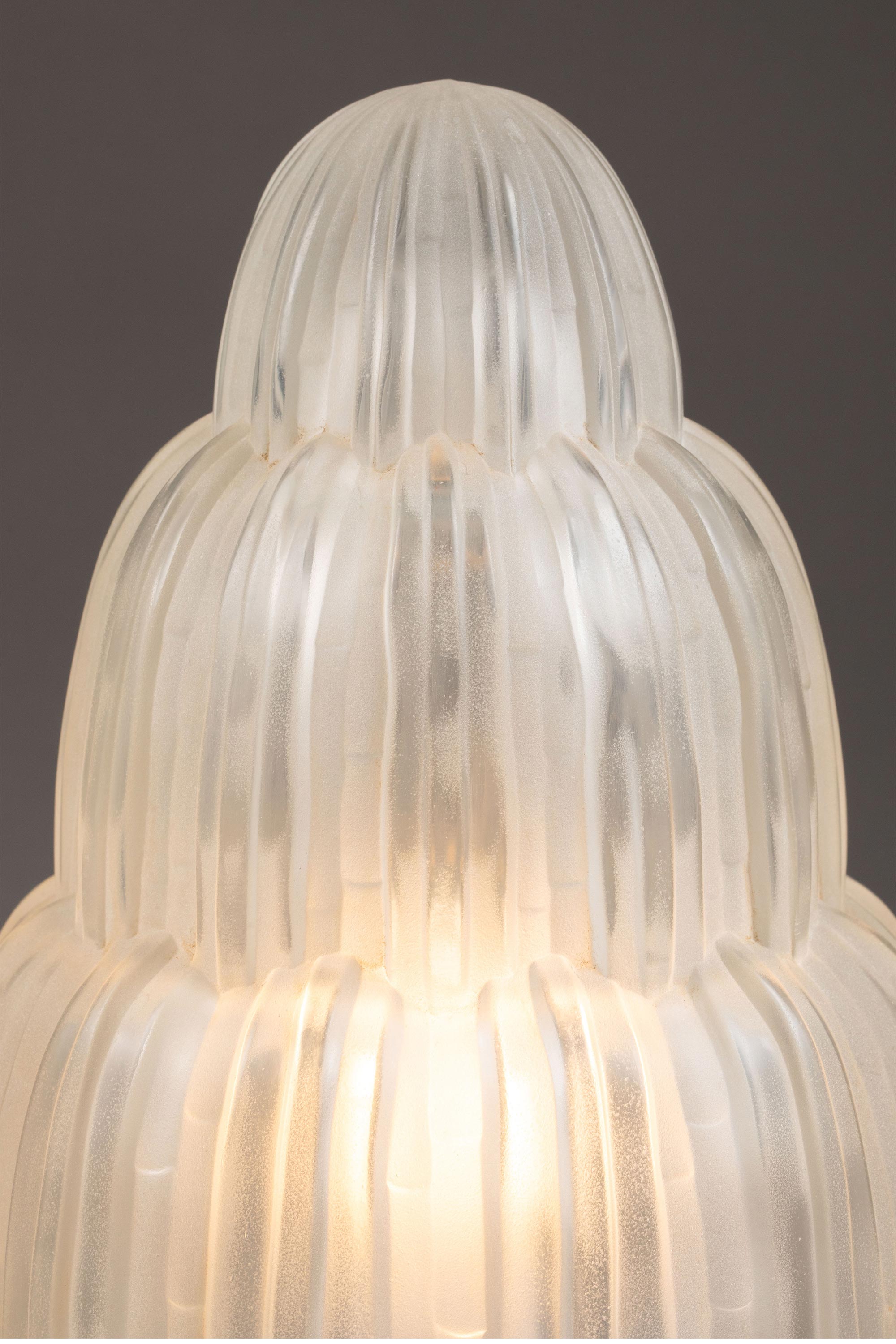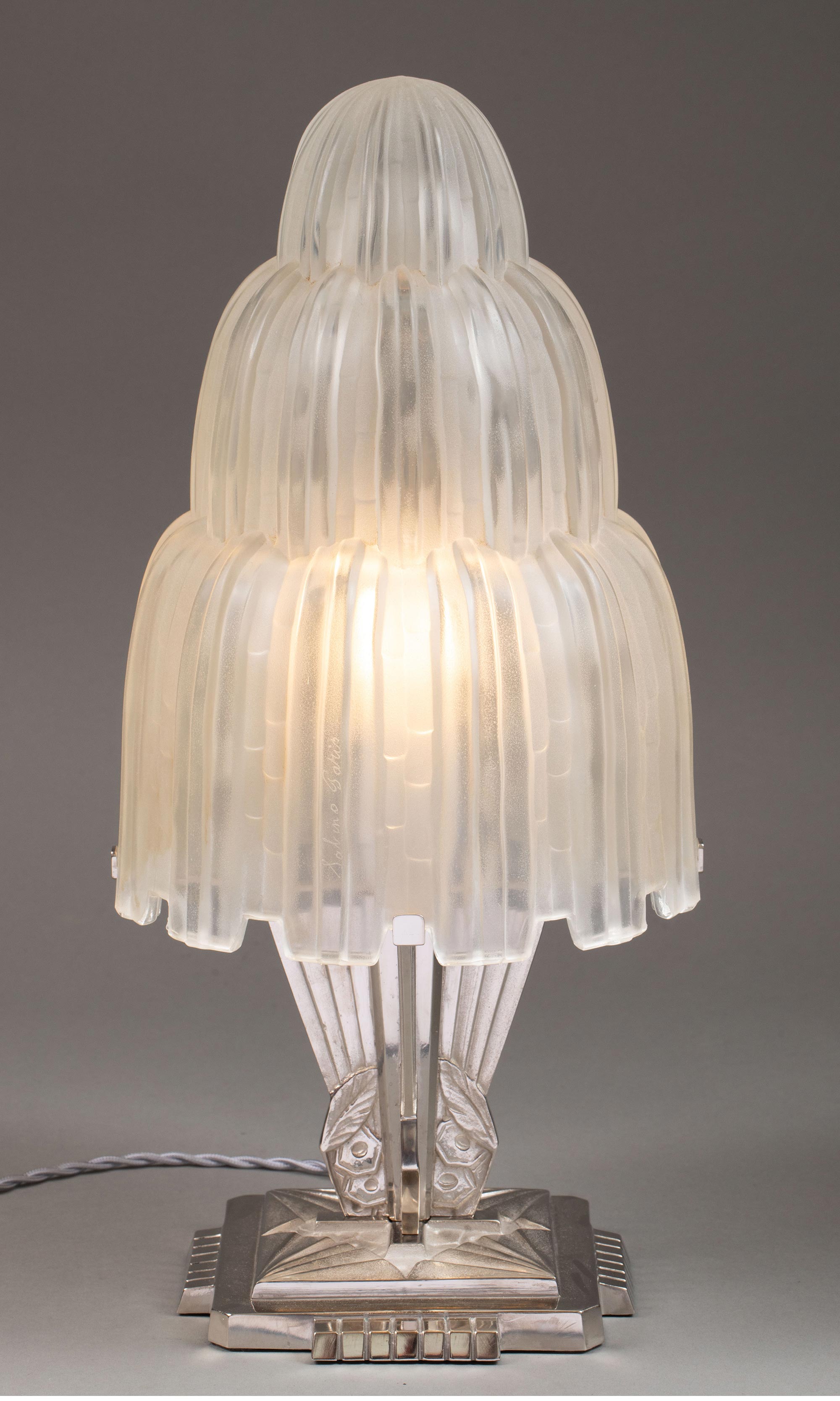 1930年代法国著名水晶品牌Sabino出品装饰艺术风格镀镍青铜灯柱装饰Cascade瀑布款乳色灯罩水晶台灯一对