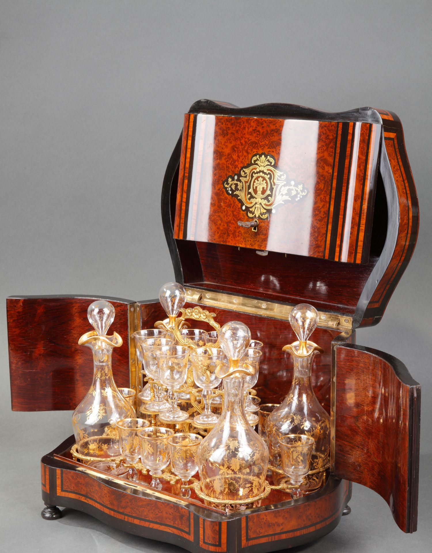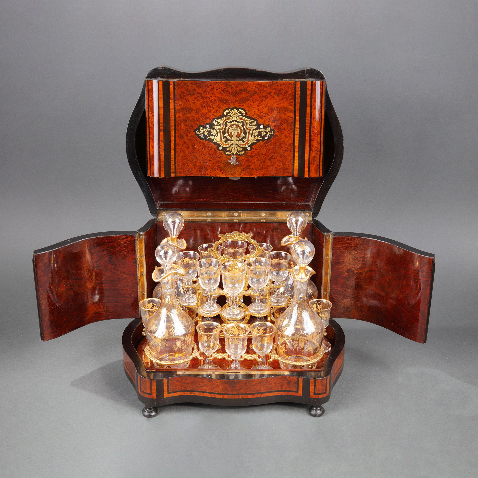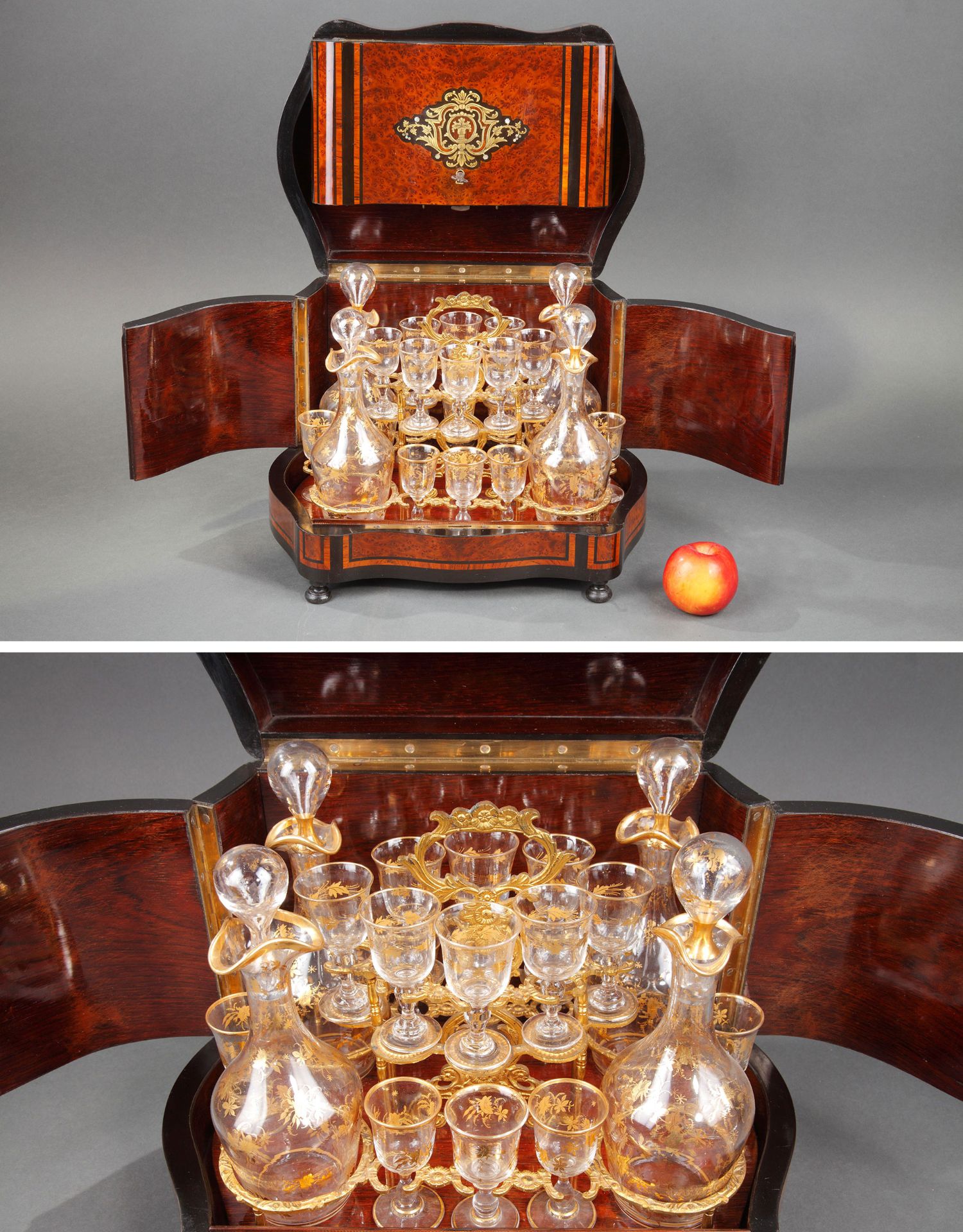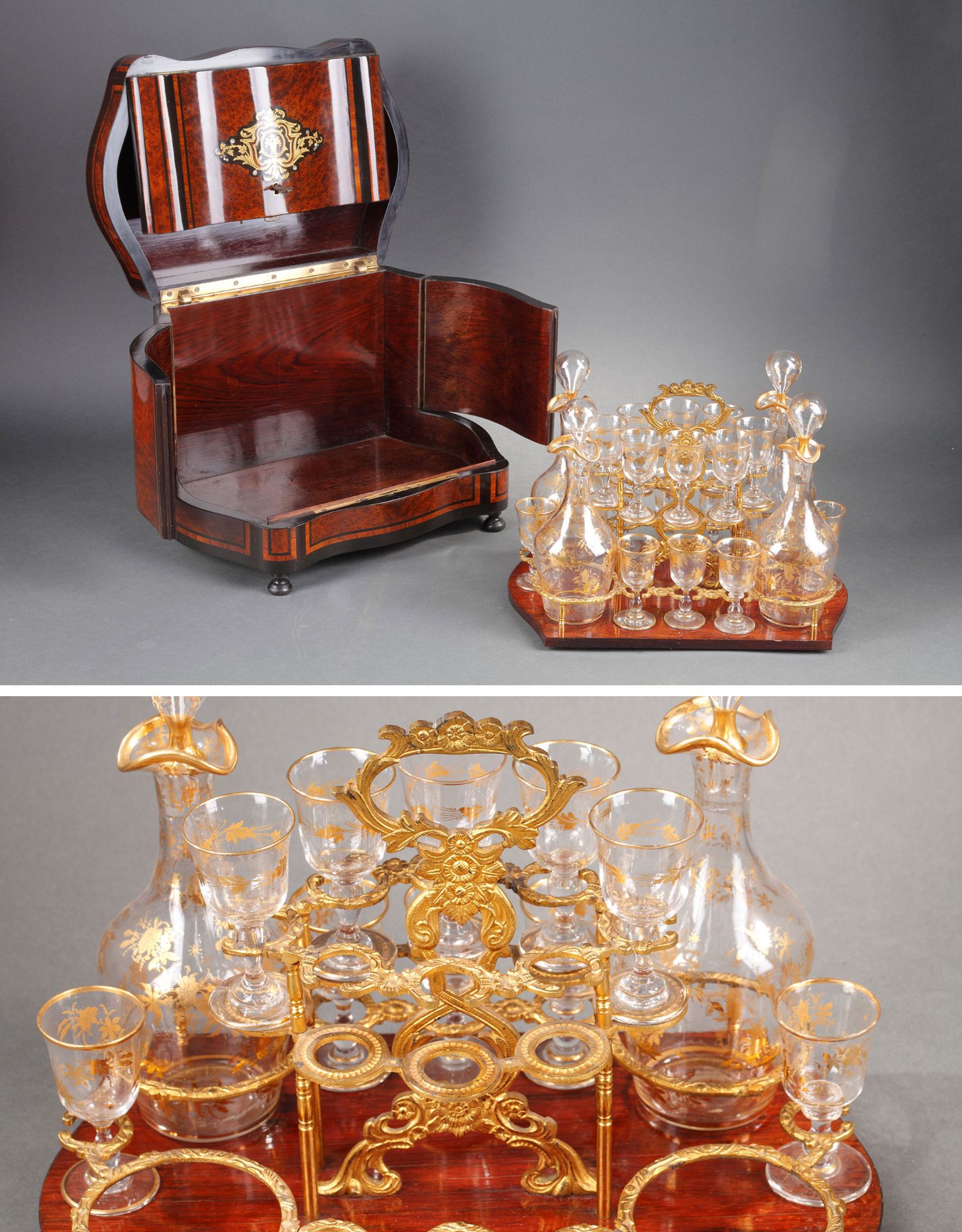 独角鹿西洋古董法国出品玫瑰木镶嵌黄铜母贝铜鎏金烈酒箱全套酒具
