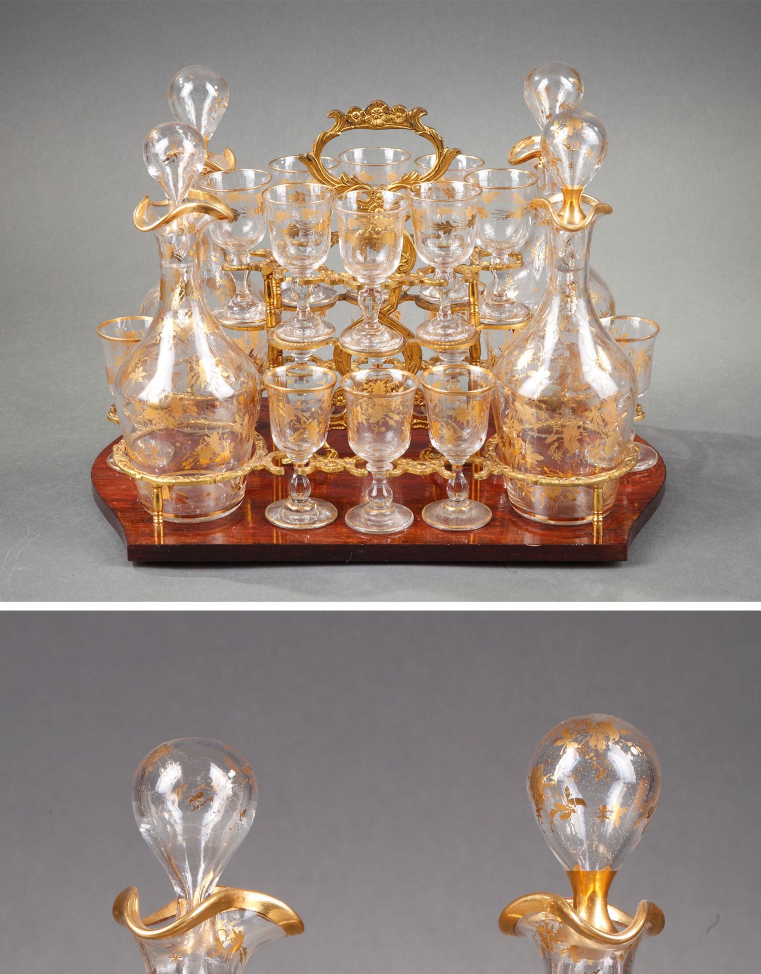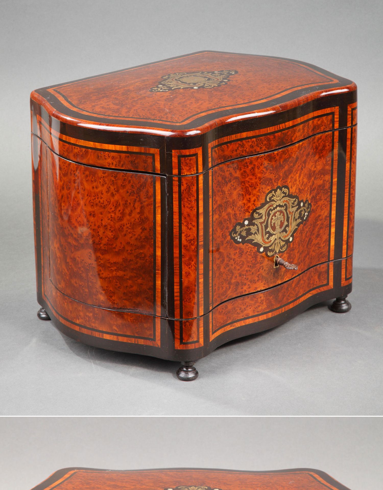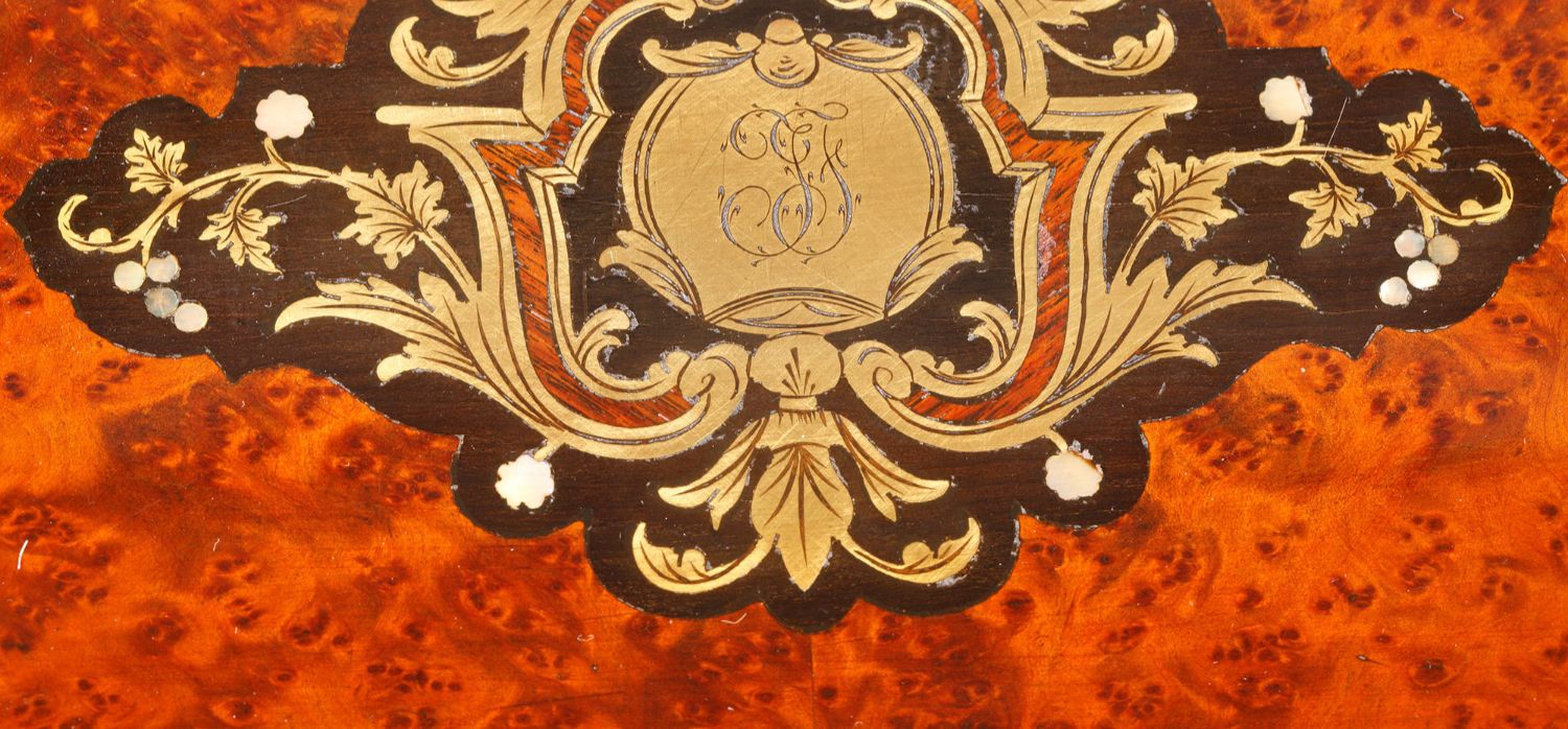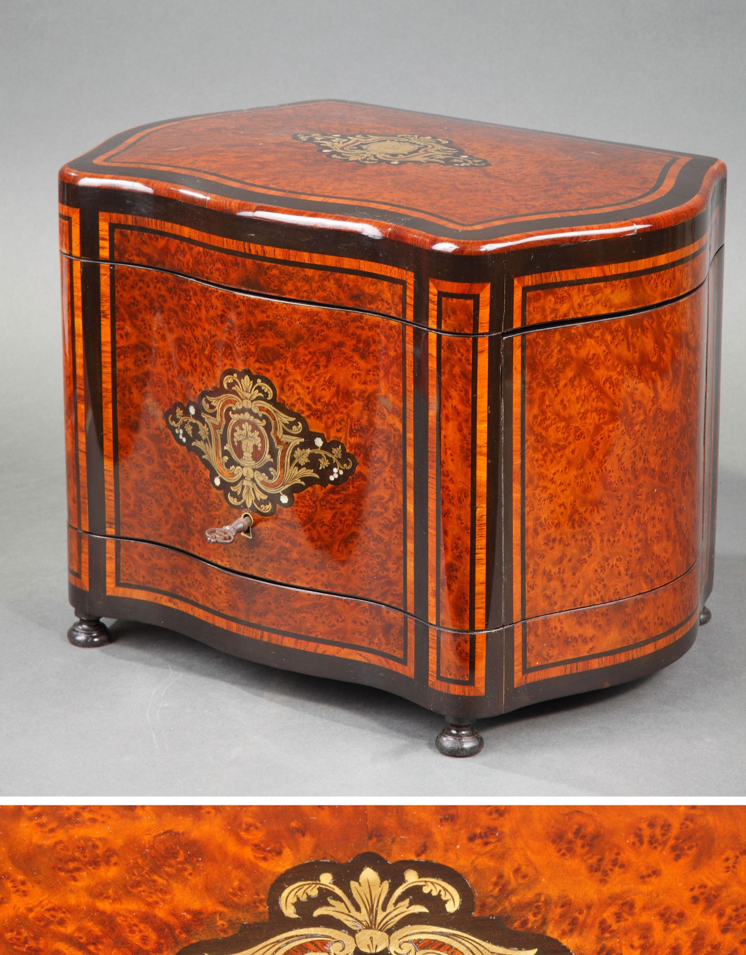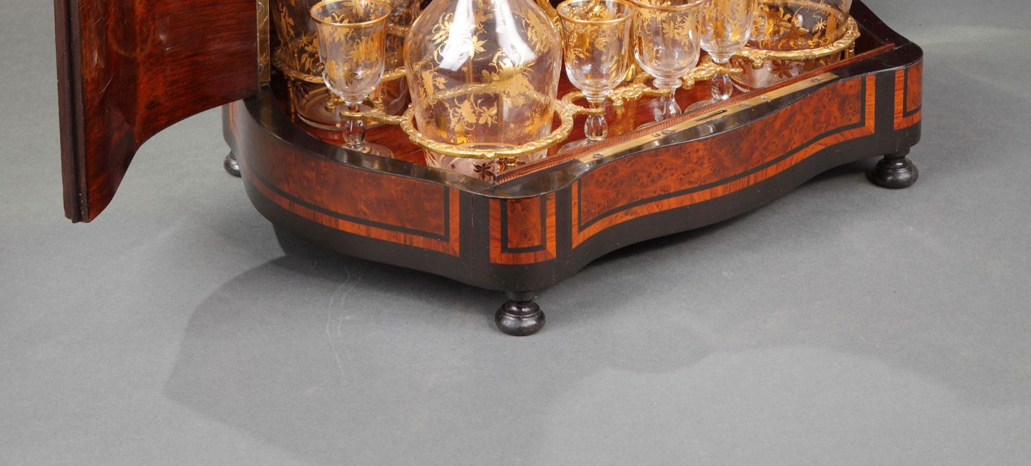 独角鹿西洋古董法国出品玫瑰木镶嵌黄铜母贝铜鎏金烈酒箱全套酒具