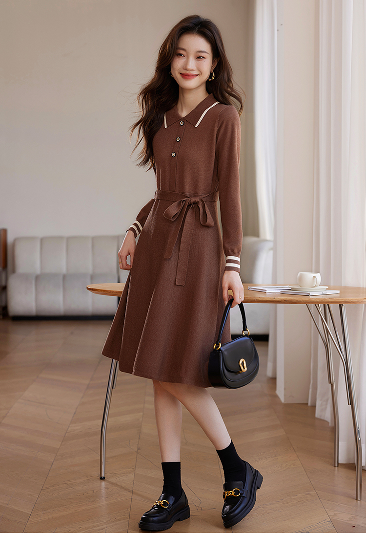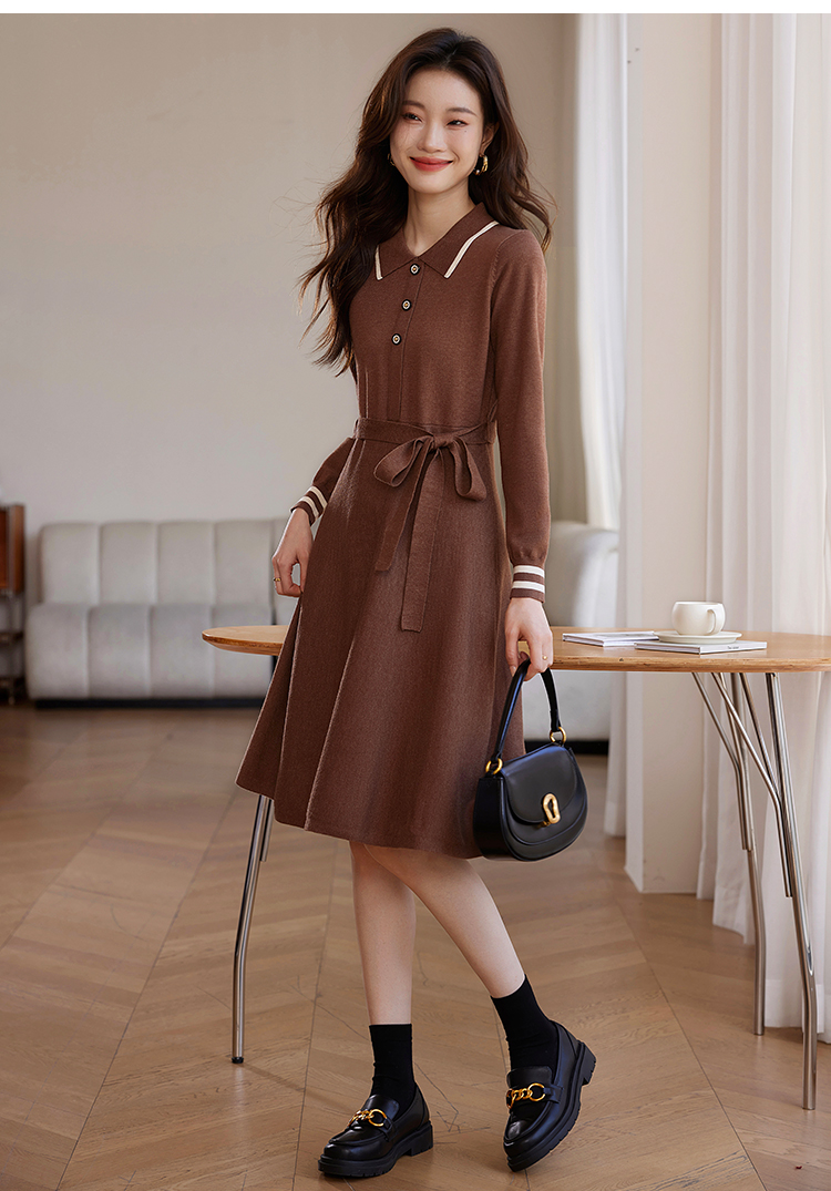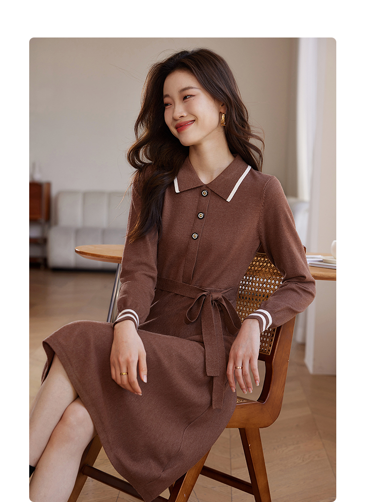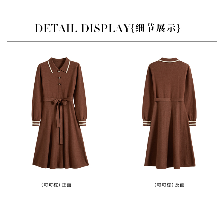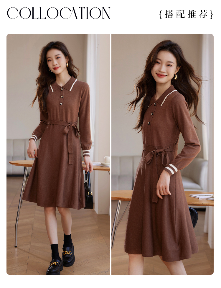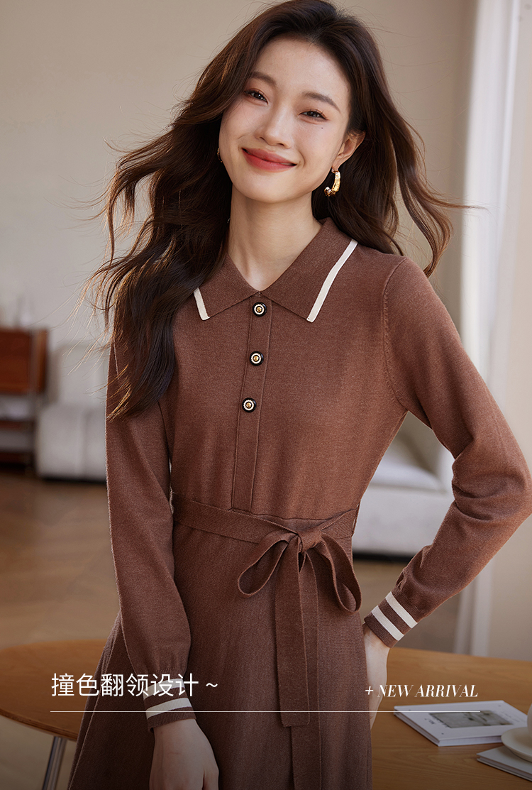 【专属特价】熙世界法式撞色polo领针织连衣裙女秋冬气质包芯纱收腰显瘦裙子