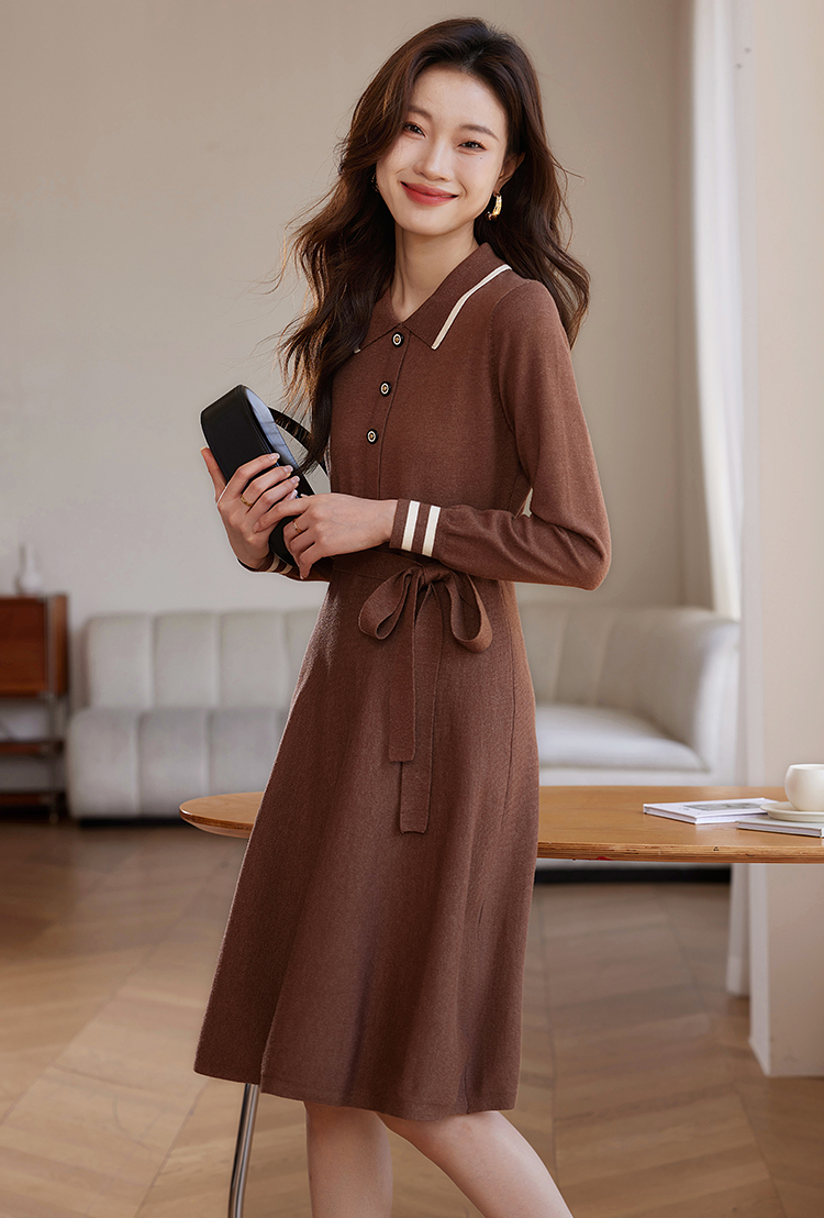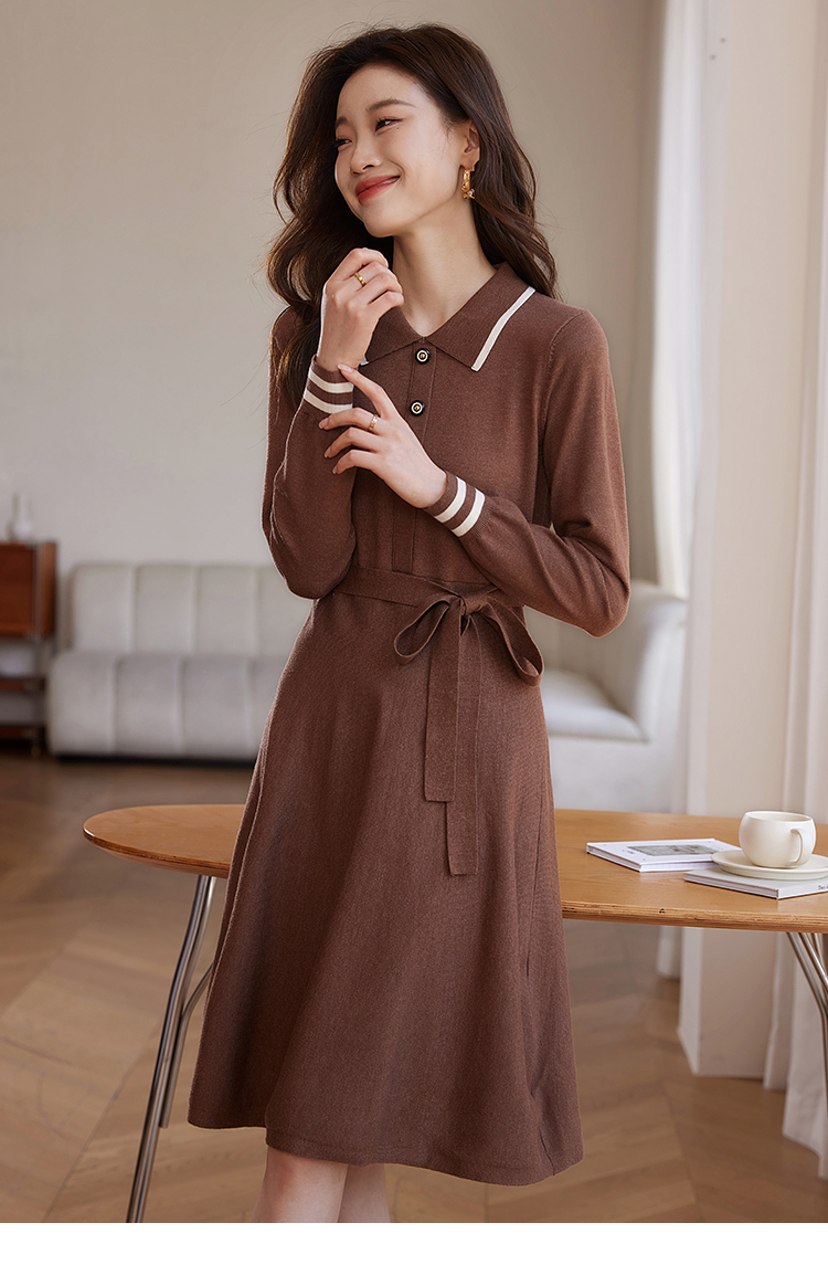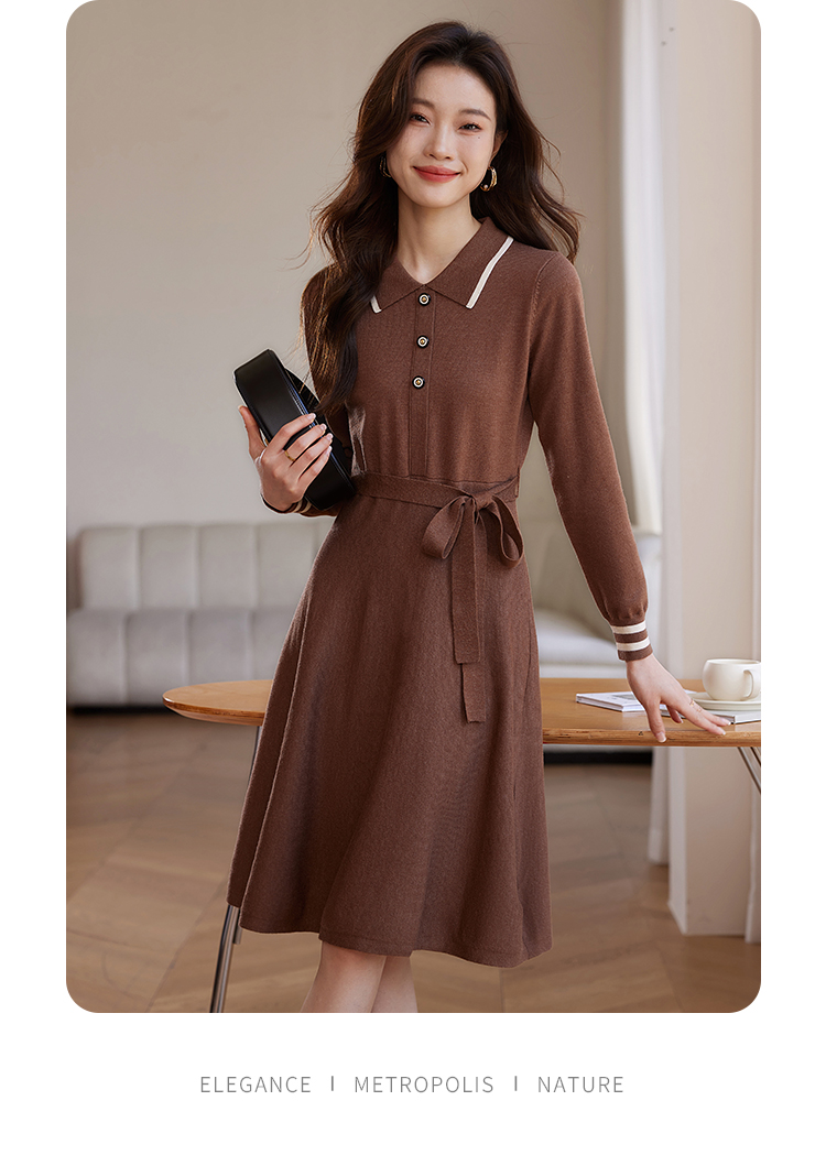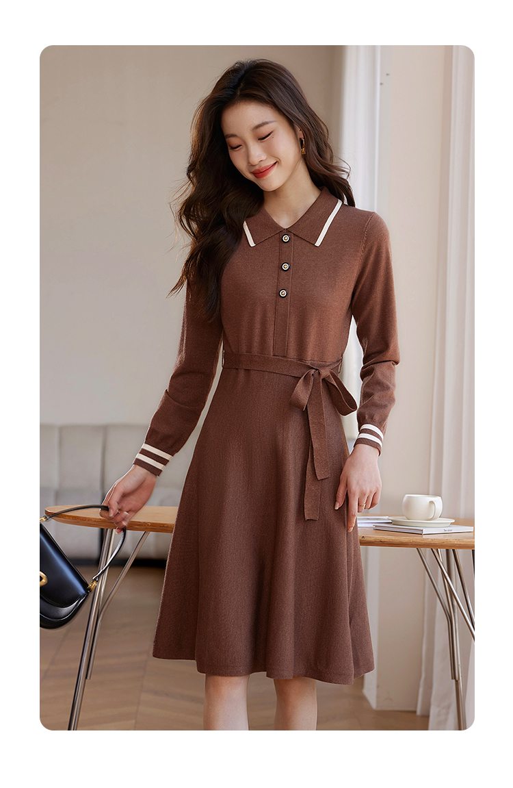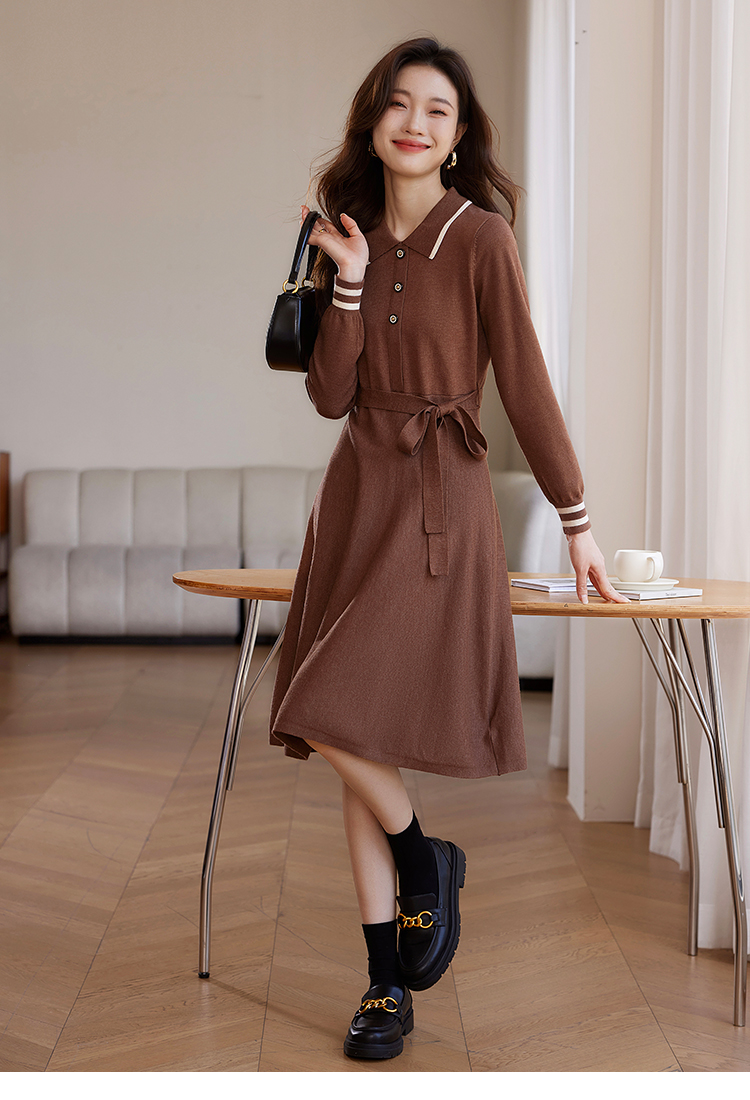 【专属特价】熙世界法式撞色polo领针织连衣裙女秋冬气质包芯纱收腰显瘦裙子