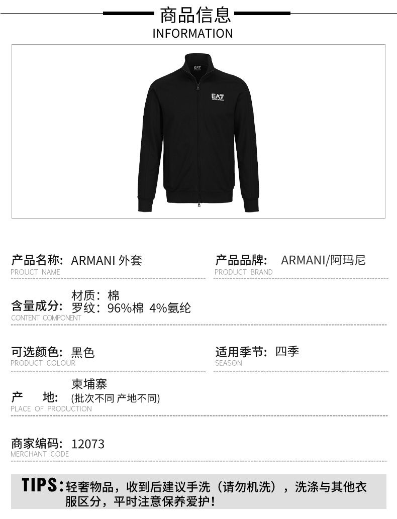 【超惠秒】Armani EA7 男士百搭运动休闲拉链开合卫衣外套12073