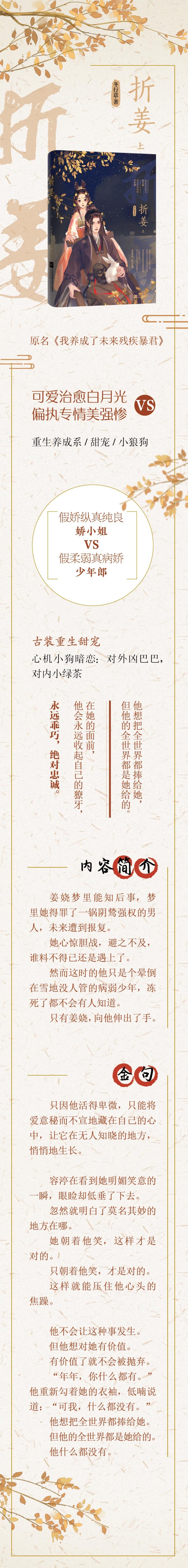 生在声名煊赫的姜家,眉眼妩媚动人,姜娆天生有财有颜有靠山,一生本该顺遂安逸,偏偏得罪了九皇子。九皇子双腿残疾,缠绵病榻多年,性情扭曲,众人眼中阴毒薄情的怪物。夺嫡成功后,将之前得罪过他的人通通收拾了个遍,手段狠戾绝情——包括姜娆。梦里知晓了后事,姜娆怕的不行,只想远离那个荒唐暴虐的男人。谁料,寒冷冬日,依旧与他狭路相逢。日后冷血睥睨、位高权重的男人,如今只是个没长大的羸弱少年。衣衫单薄倒在漫天大雪里,长睫密闭,看上去可怜又乖巧。姜娆盯着他看了半天,在离开与留下之间迟疑不定。心思百转千回,最终还是在听到苍白着脸的少年隐忍痛苦的一声闷哼后,回头,朝他伸出了手。