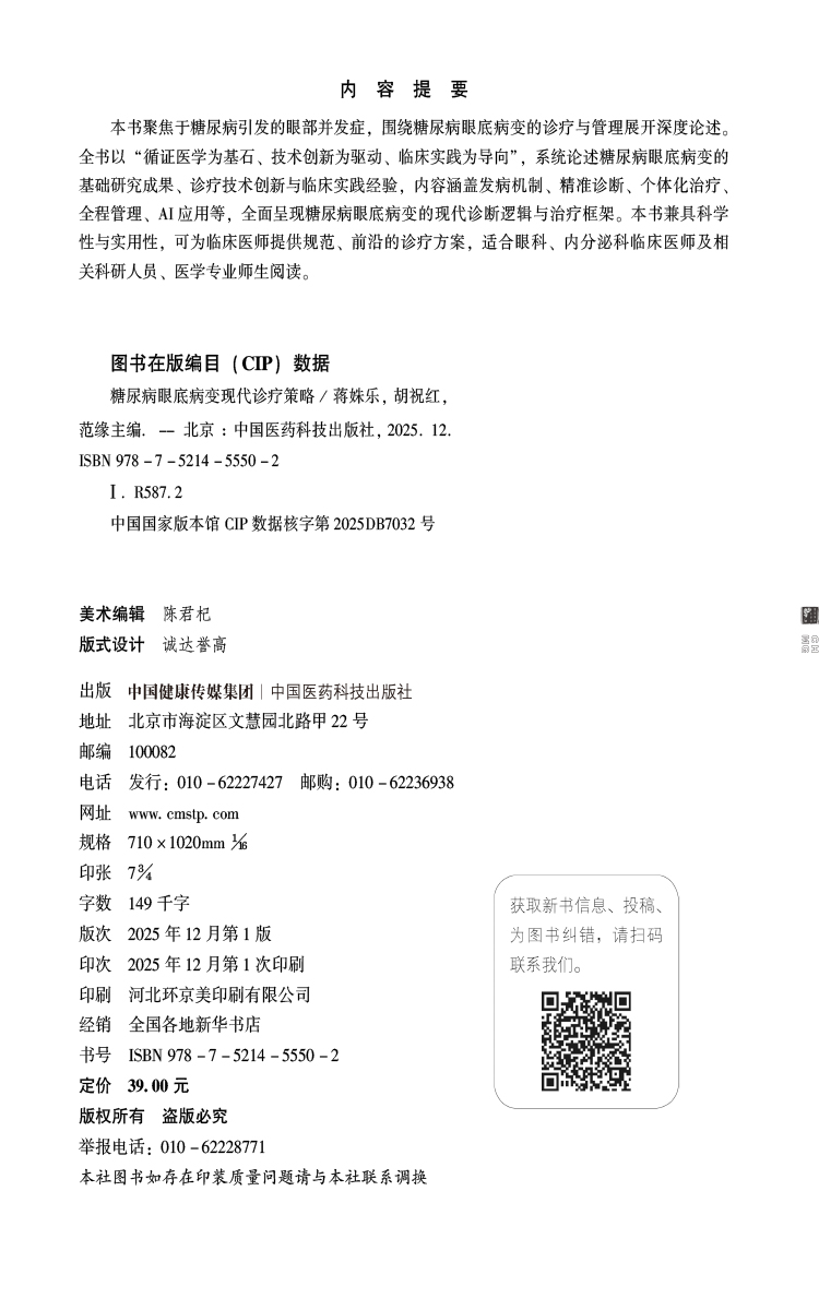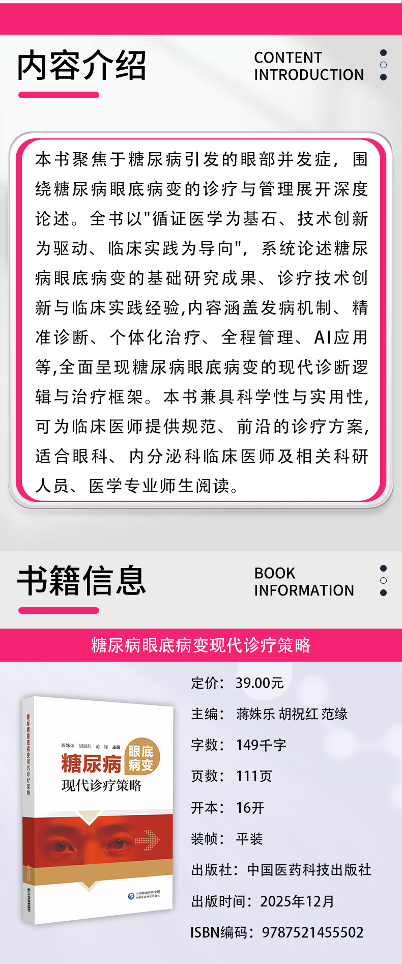 糖尿病眼底病变现代诊疗策略 蒋姝乐 胡祝红 范缘 适合眼科内分泌科临床医师及相关科研人员医学专业师生阅读 中国医药科技出版社