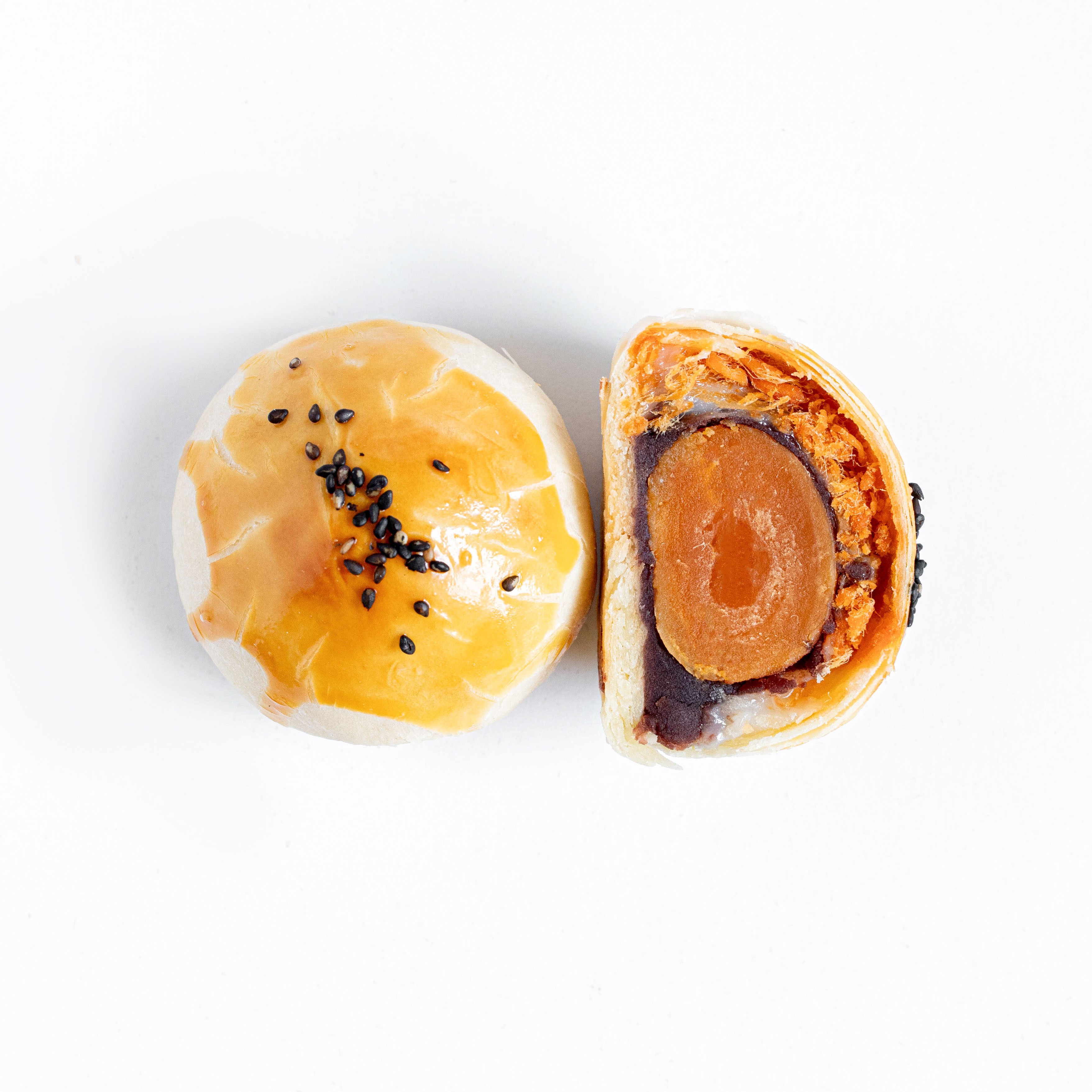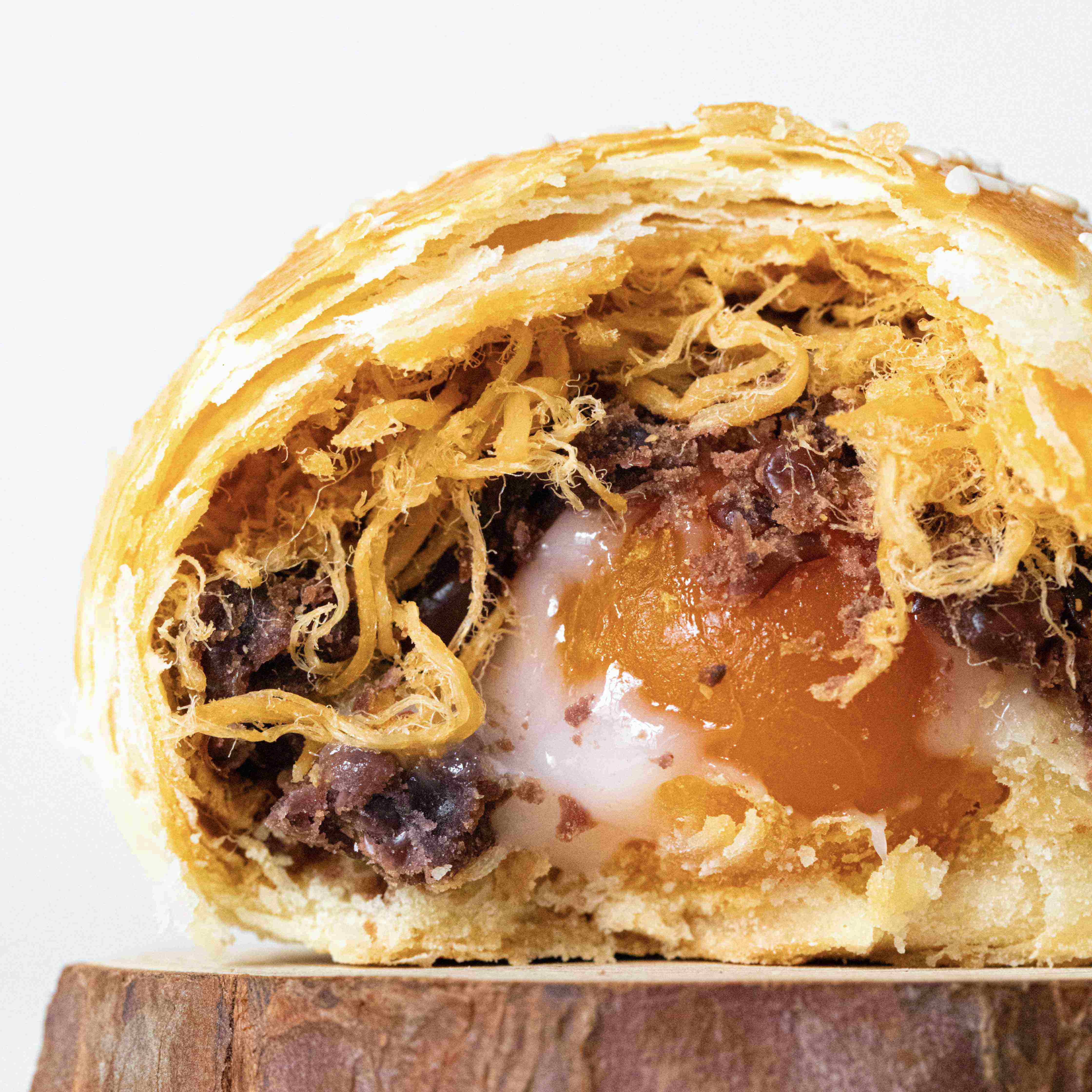 国民级 CP 组合:减糖红豆沙带着颗粒感,清香不齁甜,搭配咸香肉松和 Q 弹拉丝麻薯,最后撞上沙沙的蛋黄,咸甜交织,一口入魂,经典永不过时