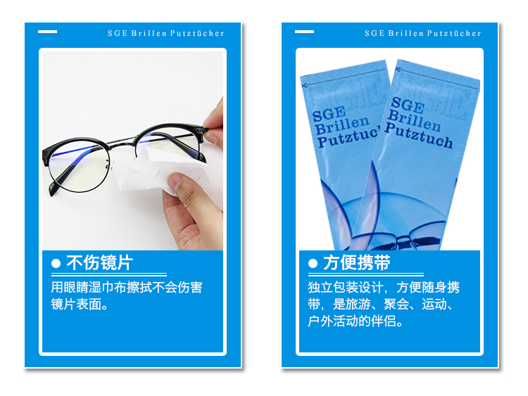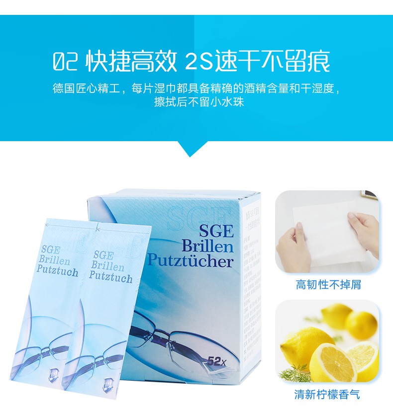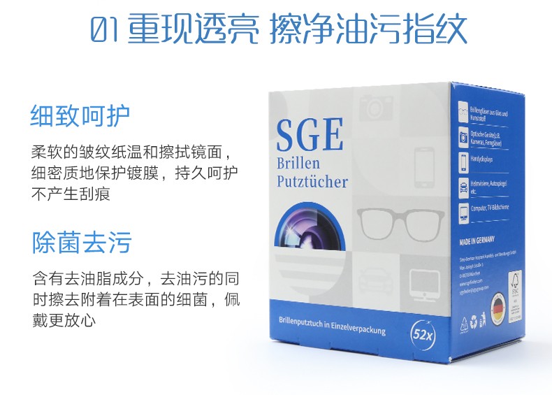 【可茵慈】SGE 德国进口一次性眼镜清洁纸 擦眼镜布 擦镜纸 镜头布屏幕湿巾速干52片/盒装 商品图2