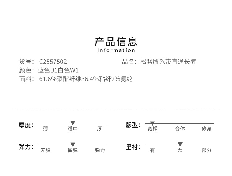 VIVIAN LIU薇薇安刘C2557502秋女装新款松紧腰系带直通长裤