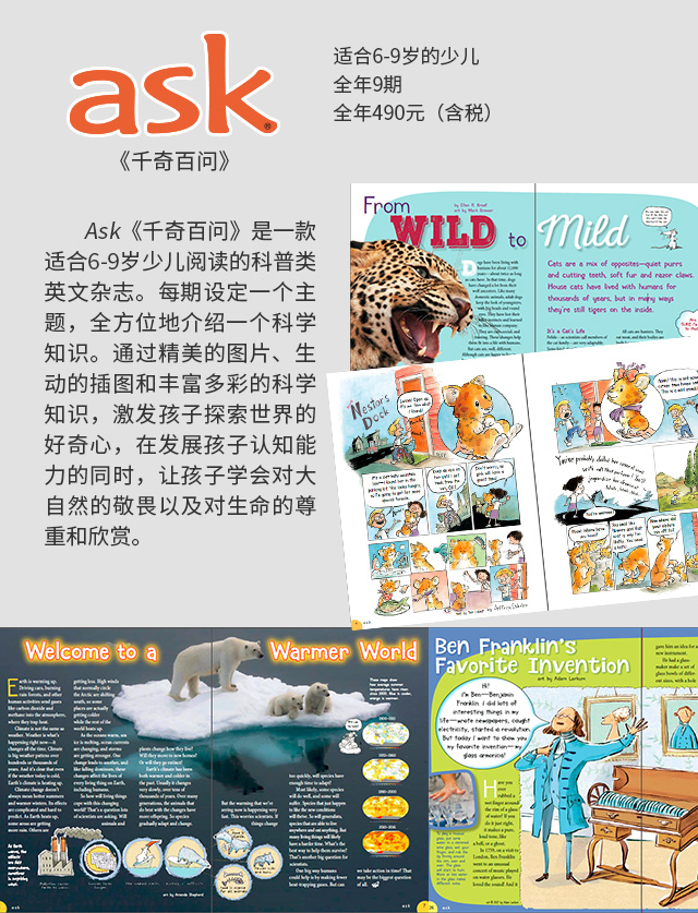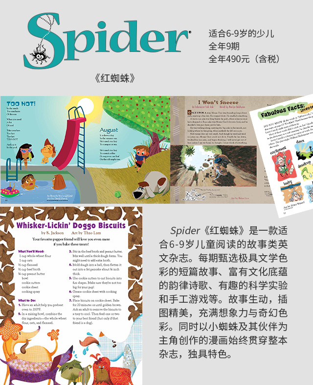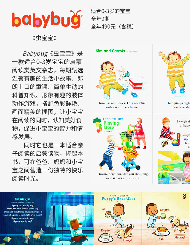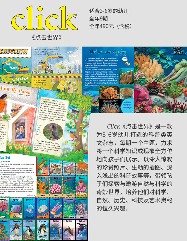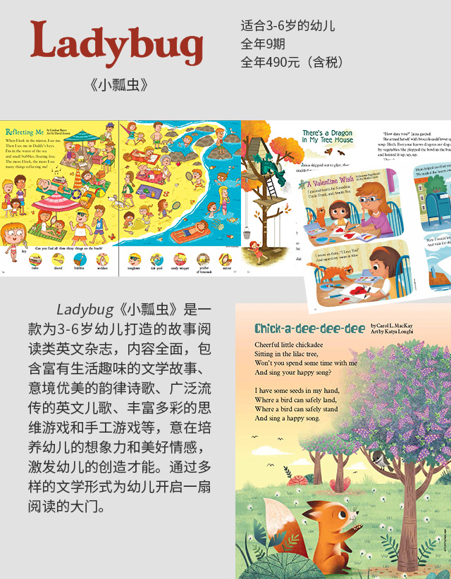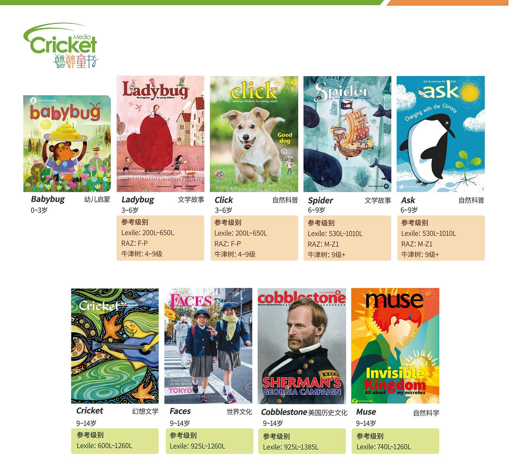 低年龄段的五种杂志,每期配有完整音频。分别是Babybug,Ladybug,Click,Spider和Ask。