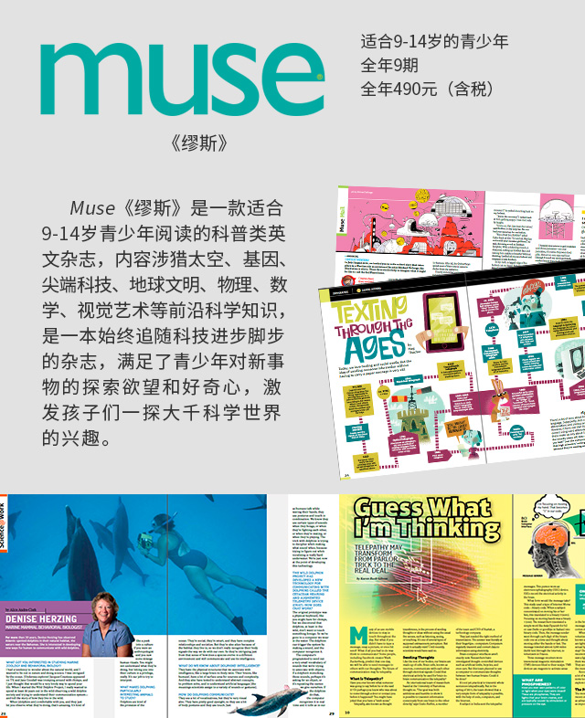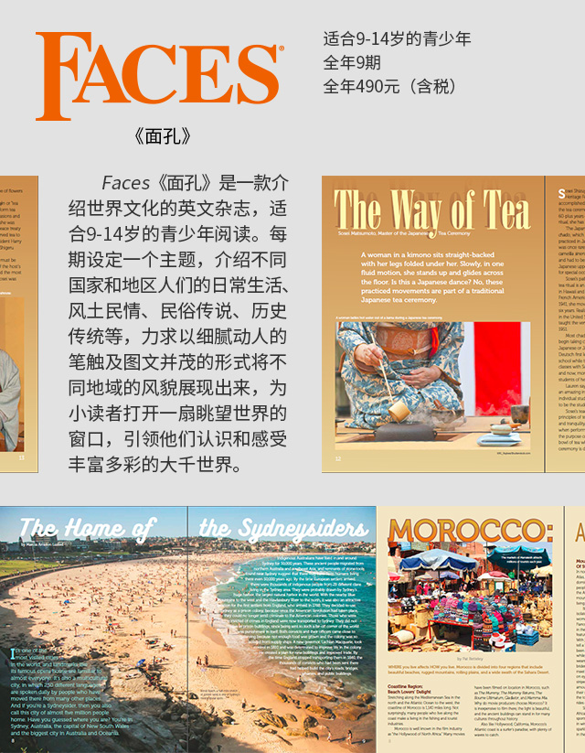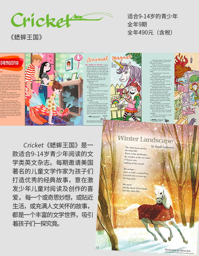 高年龄段的四种杂志,每期配有重点文章音频。分别是Cricket,Faces,Muse和Cobblestone。