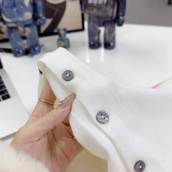面料中加入了羊绒 聚酯纤维和锦纶,面料富有延展性,让针织开衫更耐洗耐穿。 柔软细腻,就如同婴儿的肌肤一样,真的相信你穿一次就会爱上! 我们特意拿了刷子来做了测试,反复摩擦了N次都没有起球,可见面料的耐磨性很强。