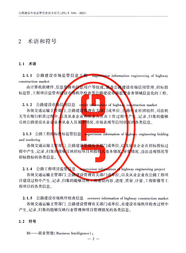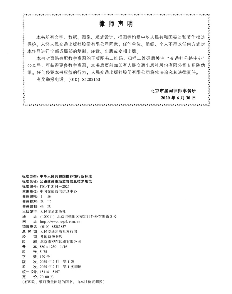 书名:公路建设市场监管信息技术规范(JTG/T 3191—2025)