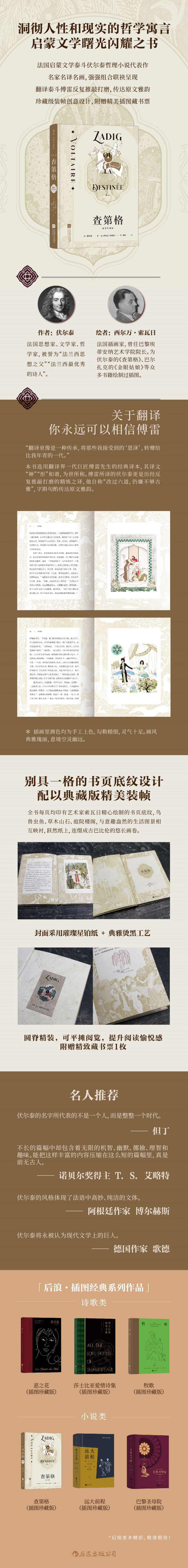 《查第格》是法国启蒙文学泰斗伏尔泰的哲理小说代表作。小说以古巴比伦为背景,将十九个天马行空、妙趣横生的小故事交织成青年查第格离奇非凡的一生,记述了查第格作为启蒙精神的阐释者,对理性之光的追寻历程。