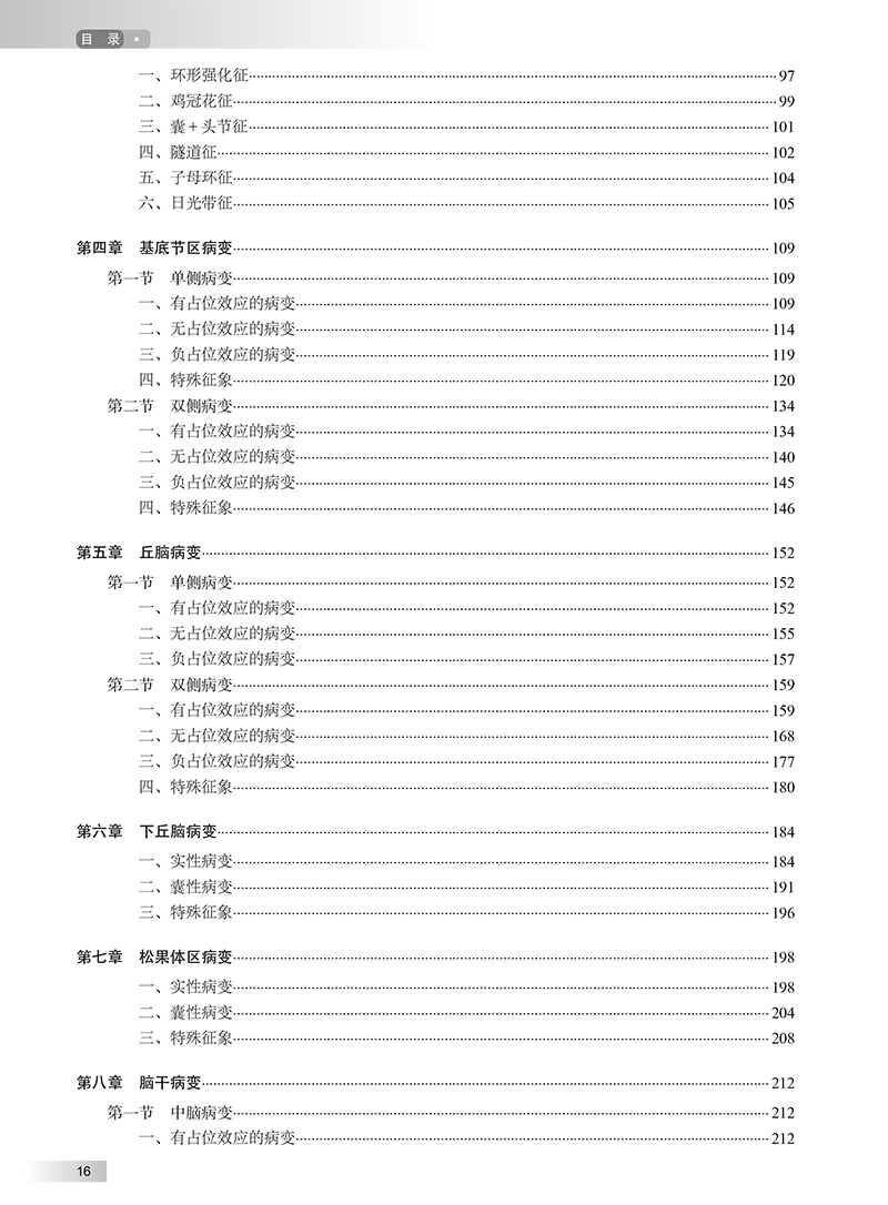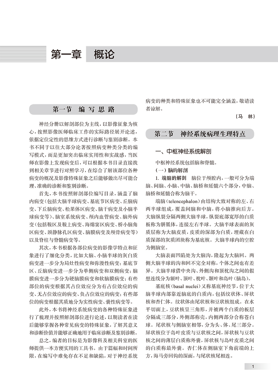 第一章 概论/ 1 第一节 编写思路 / 1 第二节 神经系统病理生理特点 / 1 一、 中枢神经系统解剖 / 1 二、 神经系统疾病的病理生理特点 / 4 第三节 神经系统疾病共性规律 / 6 一、 中枢神经系统影像学检查方法 / 6 二、 中枢神经系统正常表现及常见变异 / 9 三、 中枢神经系统基本病变的影像征象 / 11 第二章 临床常见症状与体征/ 15 第一节 头痛 / 15 一、 定义及概述 / 15 二、 临床表现与诊断检查 / 15 三、 影像学在继发性头痛中的应用 / 16 第二节 眩晕 / 17 一、 定义及概述 / 17 二、 临床表现与诊断检查 / 17 三、 影像学在中枢性眩晕中的应用 / 19 四、 影像学在周围性眩晕中的应用 / 19 第三节 意识障碍 / 20 一、 定义及概述 / 20 二、 临床表现及诊断检查 / 20 三、 影像学在昏迷中的病因诊断的应用 / 21 第三章 大脑半球病变/ 24 第一节 灰质病变 / 24 一、 局灶性病变 / 24 二、 弥漫性病变 / 35 第二节 白质病变 / 52 一、 局灶性病变 / 52 二、 弥漫性病变 / 78 第三节 灰白质交界区病变 / 97 一、 环形强化征 / 97 二、 鸡冠花征 / 99 三、 囊+ 头节征 / 101 四、 隧道征 / 102 五、 子母环征 / 104 六、 日光带征 / 105 第四章 基底节区病变/ 109 第一节 单侧病变 / 109 一、 有占位效应的病变 / 109 二、 无占位效应的病变 / 114 三、 负占位效应的病变 / 119 四、 特殊征象 / 120 第二节 双侧病变 / 134 一、 有占位效应的病变 / 134 二、 无占位效应的病变 / 140 三、 负占位效应的病变 / 145 四、 特殊征象 / 146 第五章 丘脑病变/ 152 第一节 单侧病变 / 152 一、 有占位效应的病变 / 152 二、 无占位效应的病变 / 155 三、 负占位效应的病变 / 157 第二节 双侧病变 / 159 一、 有占位效应的病变 / 159 二、 无占位效应的病变 / 168 三、 负占位效应的病变 / 177 四、 特殊征象 / 180 第六章 下丘脑病变/ 184 一、 实性病变 / 184 二、 囊性病变 / 191 三、 特殊征象 / 196 第七章 松果体区病变/ 198 一、 实性病变 / 198 二、 囊性病变 / 204 三、 特殊征象 / 208 第八章 脑干病变/ 212 第一节 中脑病变 / 212 一、 有占位效应的病变 / 212 二、 无占位效应的病变 / 214 三、 负占位效应的病变 / 215 四、 特殊征象 / 217 第二节 脑桥及桥臂病变 / 219 一、 有占位效应的病变 / 219 二、 无占位效应的病变 / 223 三、 负占位效应的病变 / 226 四、 特殊征象 / 229 第三节 延髓病变 / 232 一、 有占位效应的病变 / 232 二、 无占位效应的病变 / 234 三、 负占位效应的病变 / 238 第九章 小脑半球病变/ 240 第一节 皮层病变 / 240 一、 弥漫性病变 / 240 二、 局灶性病变 / 243 三、 特殊征象 / 247 第二节 白质病变 / 251 一、 弥漫性病变 / 251 二、 局灶性病变 / 254 三、 特殊征象 / 260 第三节 小脑蚓部病变 / 261 一、 有占位效应的病变 / 261 二、 负占位效应的病变 / 264 三、 小脑蚓部缺如 / 264 第十章 脑室系统病变/ 268 第一节 侧脑室病变 / 268 第二节 第三脑室病变 / 274 第三节 中脑导水管病变 / 280 第四节 第四脑室病变 / 281 第五节 脑室内弥漫性病变 / 291 第六节 室管膜下病变 / 296 第七节 脑室扩大 / 297 第十一章 颅内血管病变/ 303 第一节 动脉血管病变相关征象 / 303 一、 血管高密度征 / 303 二、 磁敏感血管征 / 304 三、 岛带征 / 305 四、 错配征 / 307 五、 T2FLAIR 弥散错配征 / 308 六、 灰白质模糊征 / 310 七、 常春藤征 / 311 八、 三区域征 / 314 九、 串珠样改变 / 315 第二节 静脉血管病变相关征象 / 317 一、 FLAIR 血管高信号征 / 317 二、 空三角征 / 318 三、 海蛇头征 / 319 四、 爆米花征 / 320 五、 开花征 / 321 第十二章 鞍区及鞍上病变/ 324 第一节 鞍区病变 / 324 一、 有占位效应的病变 / 324 二、 无占位效应的病变 / 329 三、 雪人征 / 332 第二节 鞍上病变 / 333 一、 鞍上实性病变 / 333 二、 鞍上囊性病变 / 337 第十三章 海绵窦区病变/ 344 第一节 有占位效应的病变 / 344 第二节 无占位效应的病变 / 351 第三节 阴阳征 / 355 第十四章 桥小脑角区病变/ 359 第一节 实性病变 / 359 第二节 囊性病变 / 366 第三节 特殊征象 / 372 第十五章 颈静脉孔区病变/ 374 第一节 实性病变 / 374 第二节 囊性病变 / 379 第三节 特殊征象 / 383 一、 胡椒盐征 / 383 二、 哑铃征 / 385 三、 阴阳征 / 388 第十六章 脑膜病变/ 391 第一节 硬脑膜病变 / 391 一、 局灶性病变 / 391 二、 弥漫性病变 / 395 三、 脑膜尾征 / 399 第二节 蛛网膜下腔病变 / 400 一、 局灶性病变 / 400 二、 弥漫性病变 / 403 第三节 软脑膜病变 / 405 第十七章 颅骨病变/ 411 第一节 局限性病变 / 411 第二节 弥漫性病变 / 416 第十八章 脊柱与脊髓病变/ 421 第一节 髓内病变 / 421 一、 有占位效应的病变 / 421 二、 无占位效应的病变 / 428 三、 负占位效应的病变 / 433 四、 特殊征象 / 437 第二节 髓外硬膜下病变 / 441 一、 局灶性病变 / 441 二、 弥漫性病变 / 447 三、 特殊征象 / 452 第三节 硬膜外病变 / 454 一、 局灶性病变 / 454 二、 弥漫性病变 / 458 三、 特殊征象 / 463 中英文名词对照索引/ 473 登录中华临床影像征象库步骤/ 475