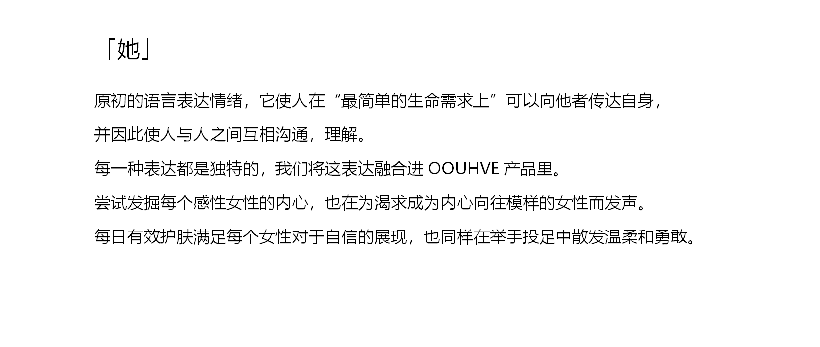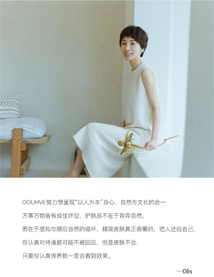 OOUHVE无添加护肤品,以内养外精准护肤 译为“更像自己”通过肌肤是有生命,学会倾听肌肤声音的探讨 赋予产品精神意义与力量,通过优选原料品质温和精纯有效的护肤品,让每一位女性在使用后更加独立坚强。
