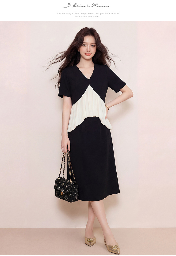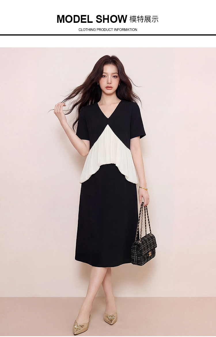 奢姿大码女装2026夏季撞色拼接半裙套装V领遮肉通勤中长裙两件套9962960039