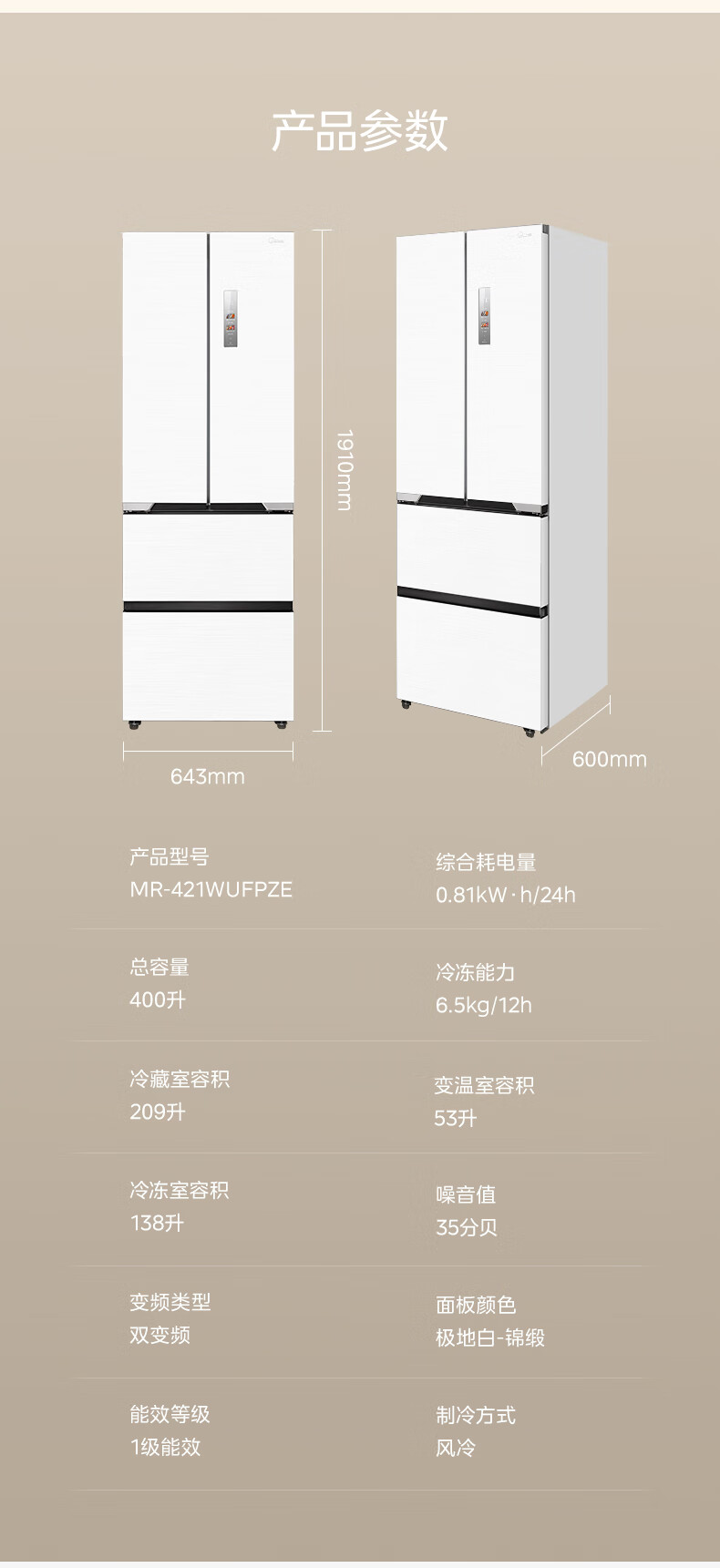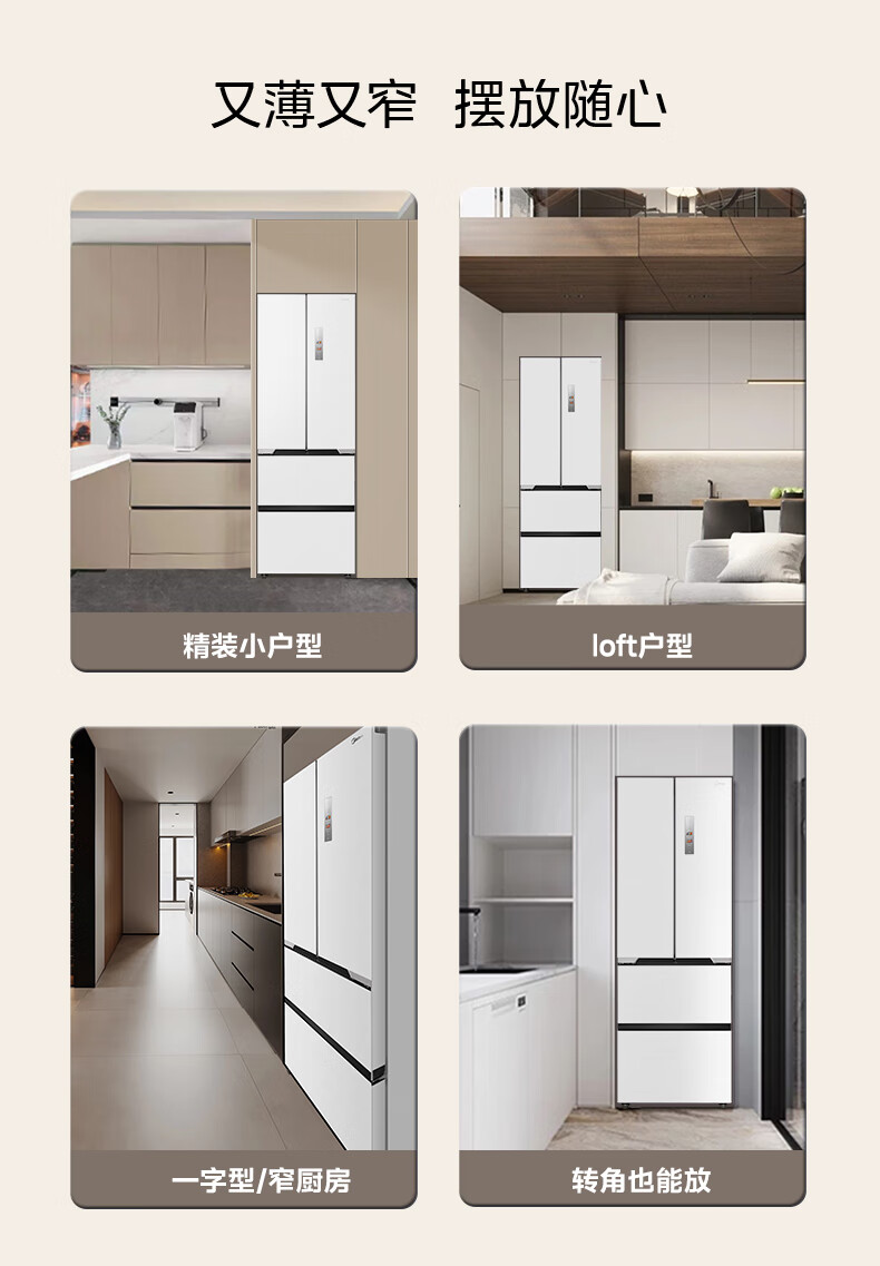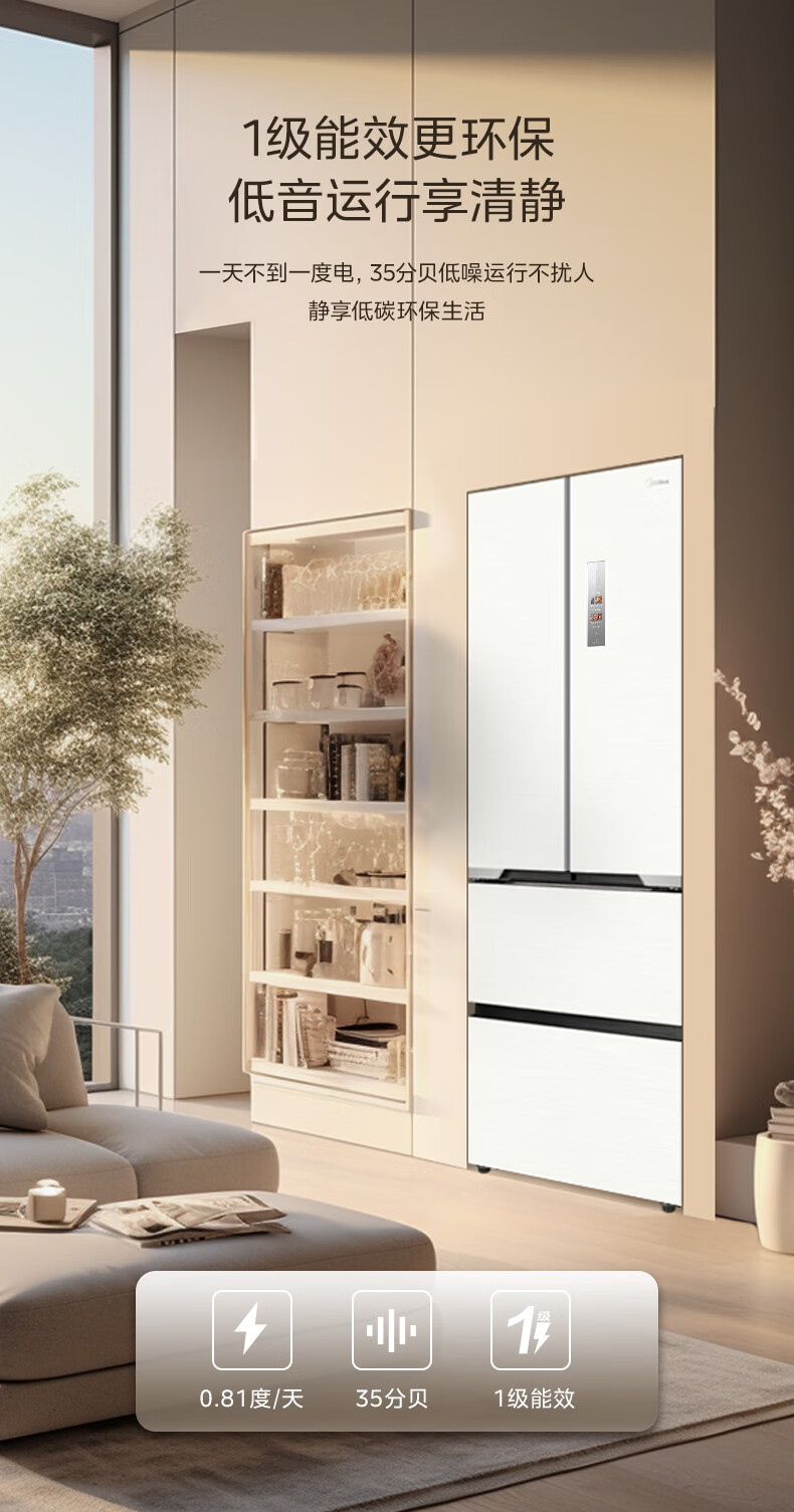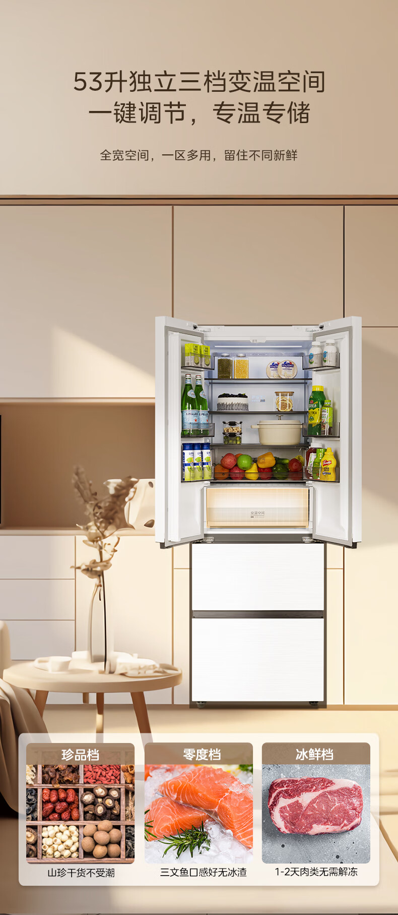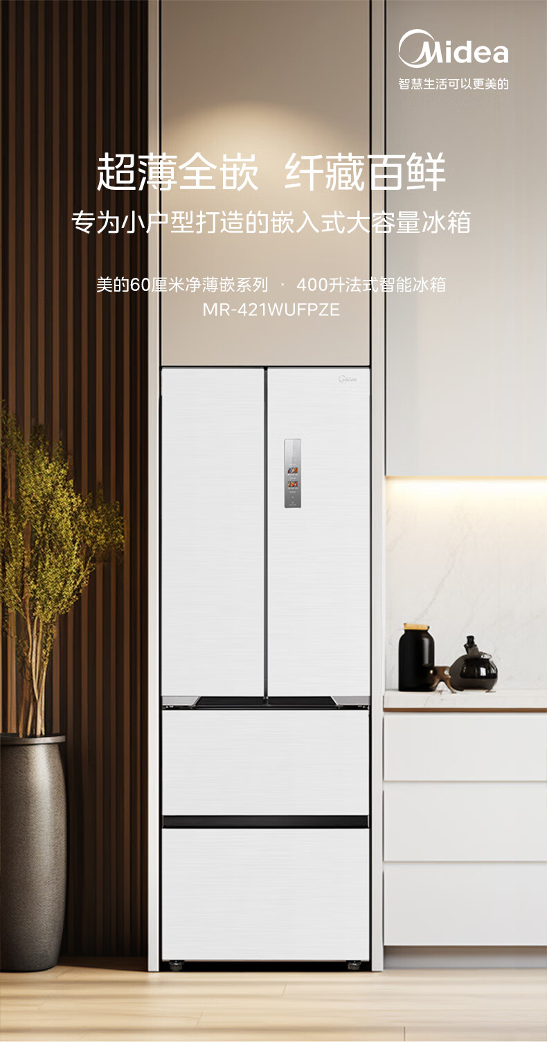 美的 MR-421WUFPZE 421升超薄可嵌入式一级变频除菌法式多门四开门家用无霜白色大容量智能电冰箱 极地白-锦缎