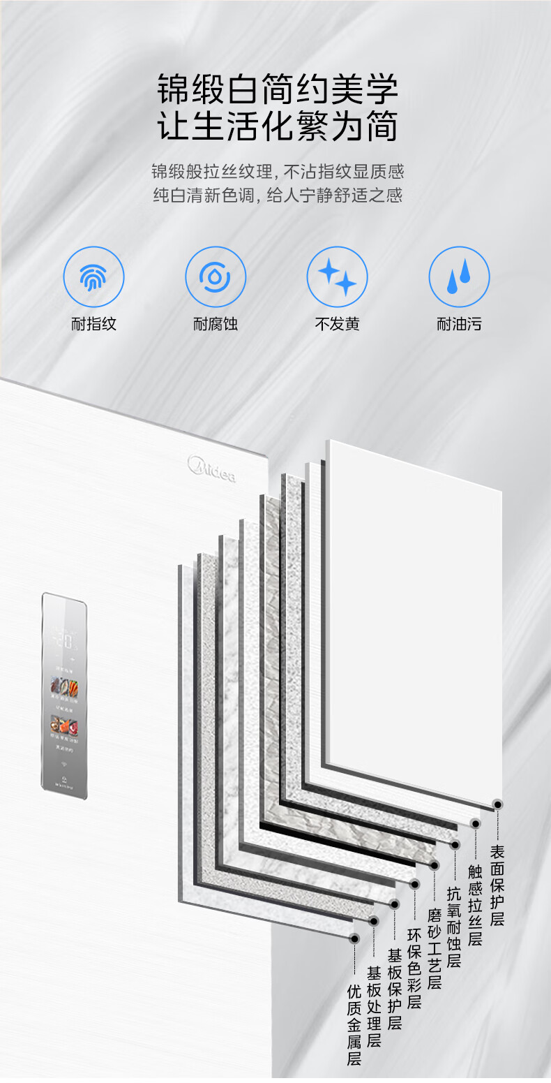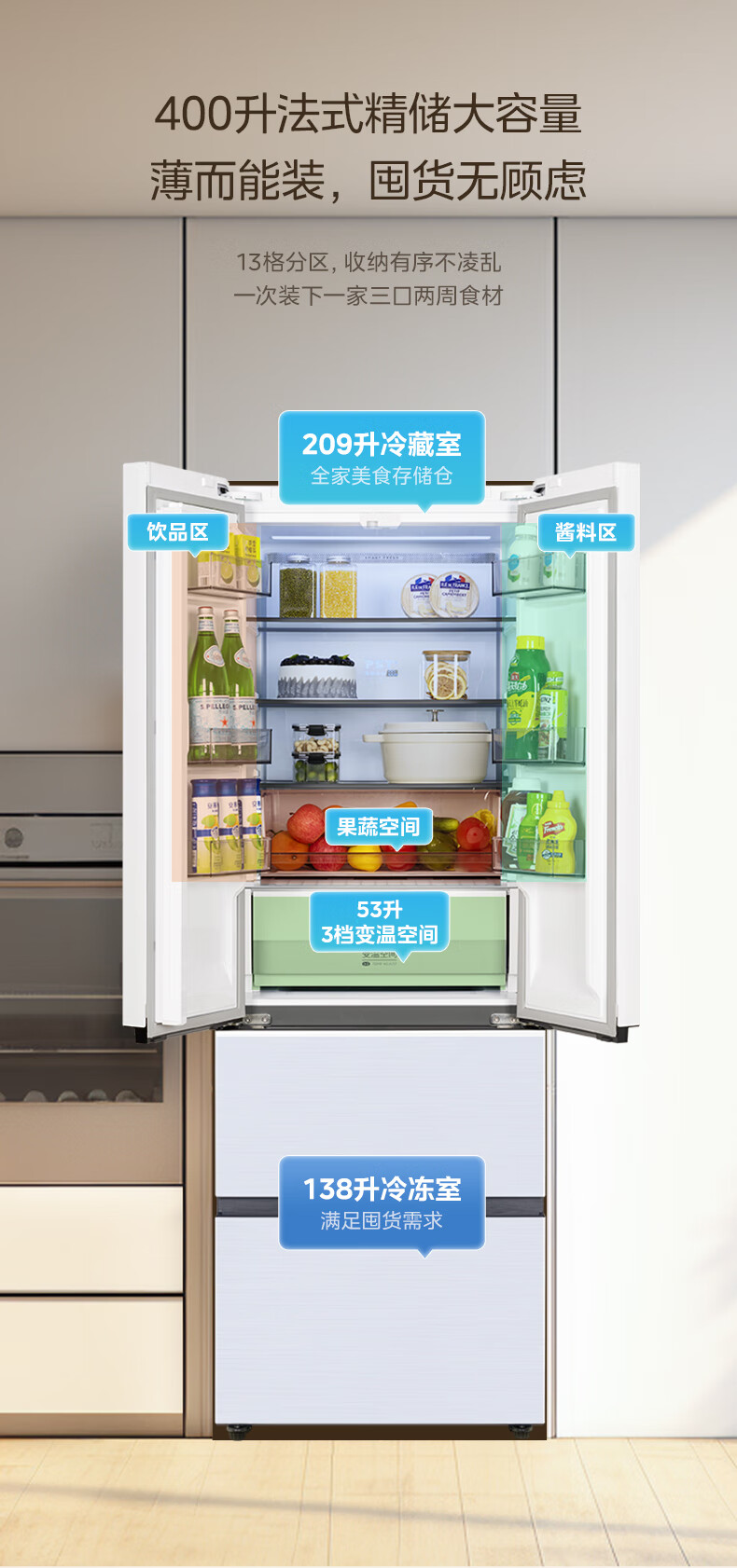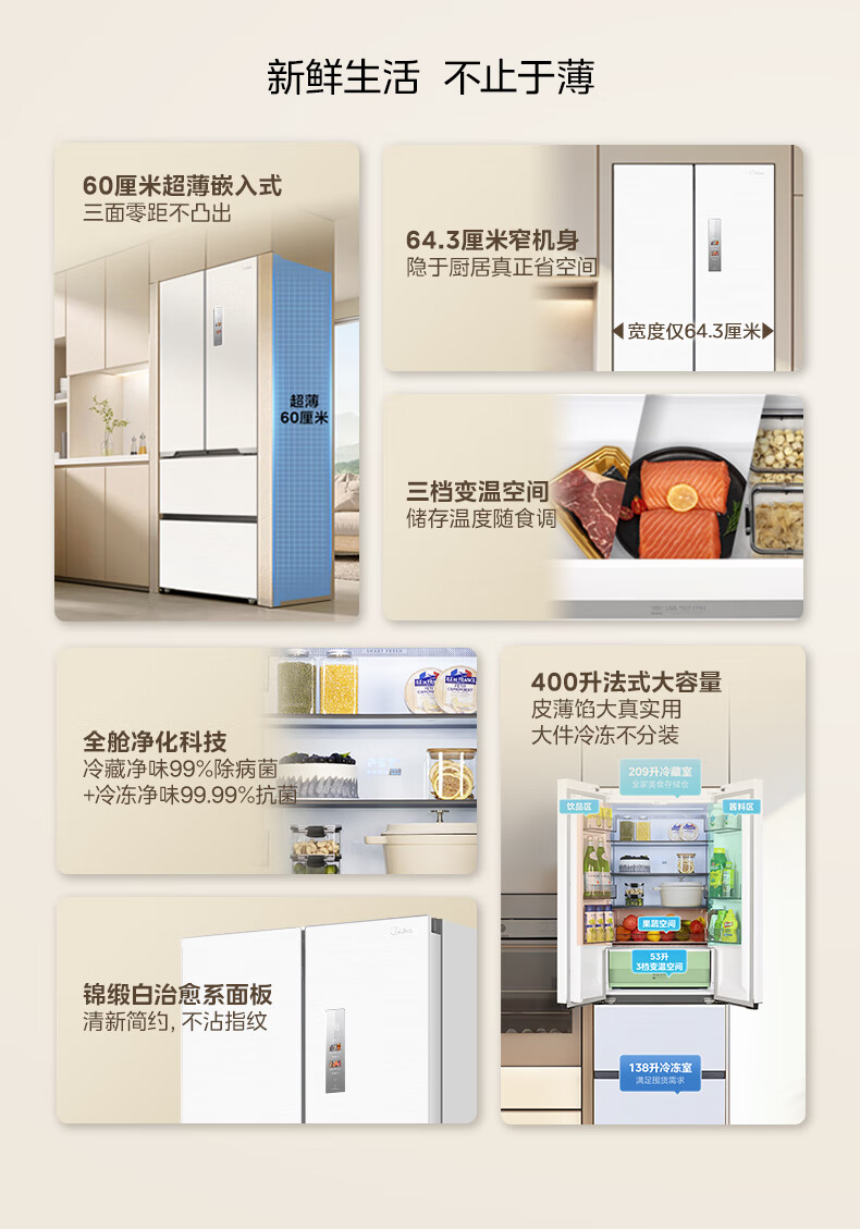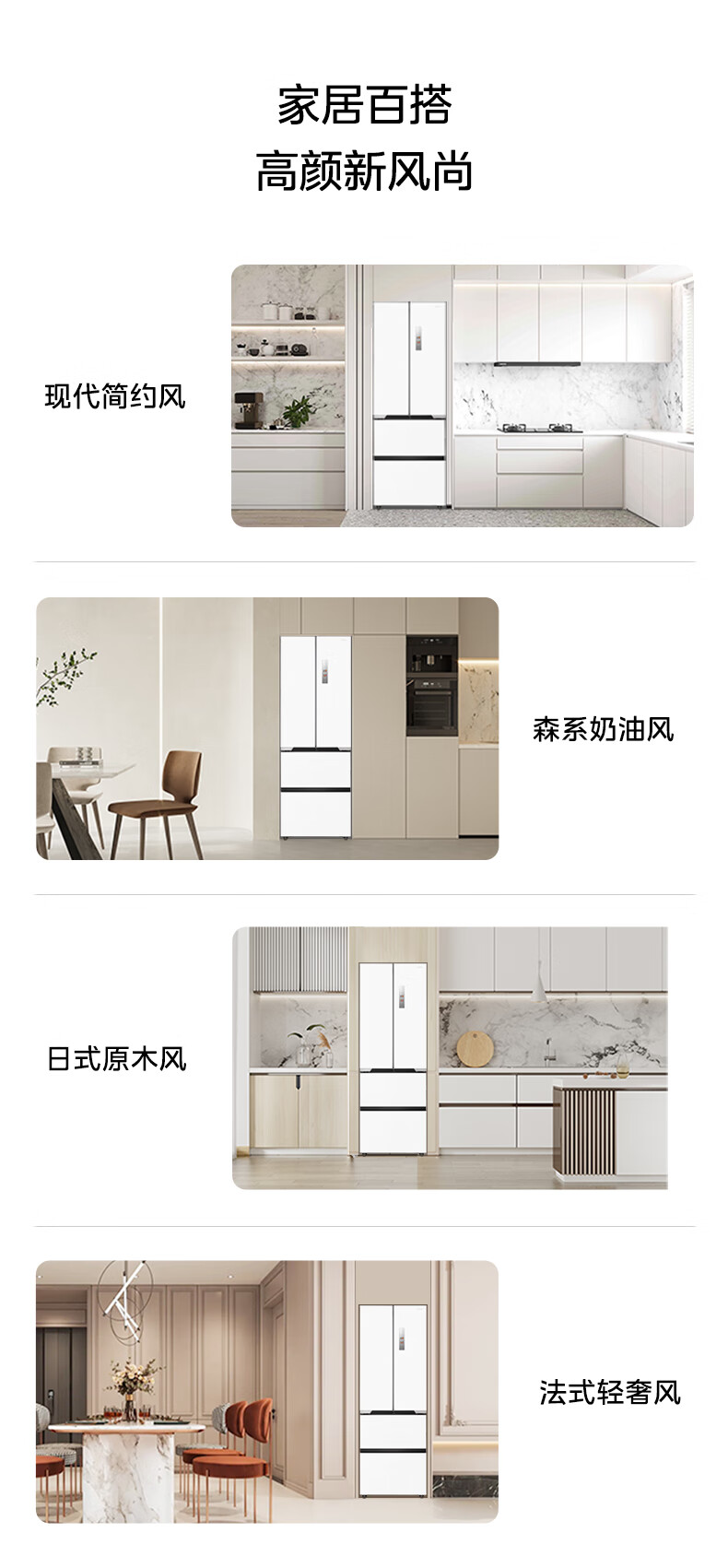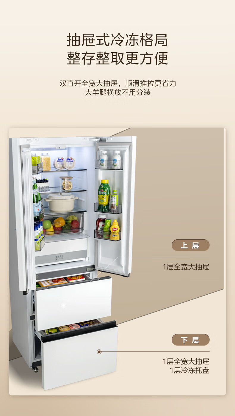 美的 MR-421WUFPZE 421升超薄可嵌入式一级变频除菌法式多门四开门家用无霜白色大容量智能电冰箱 极地白-锦缎