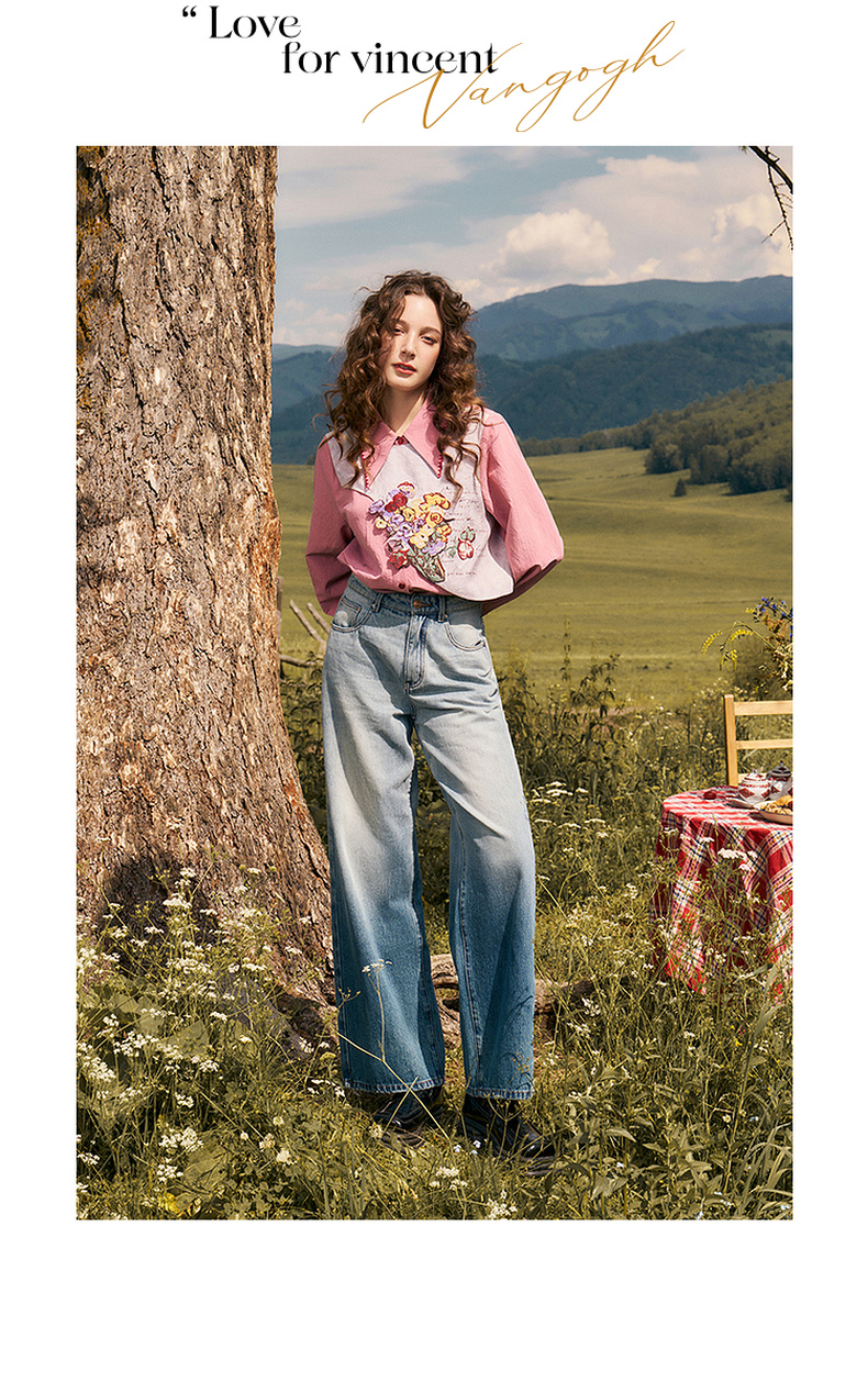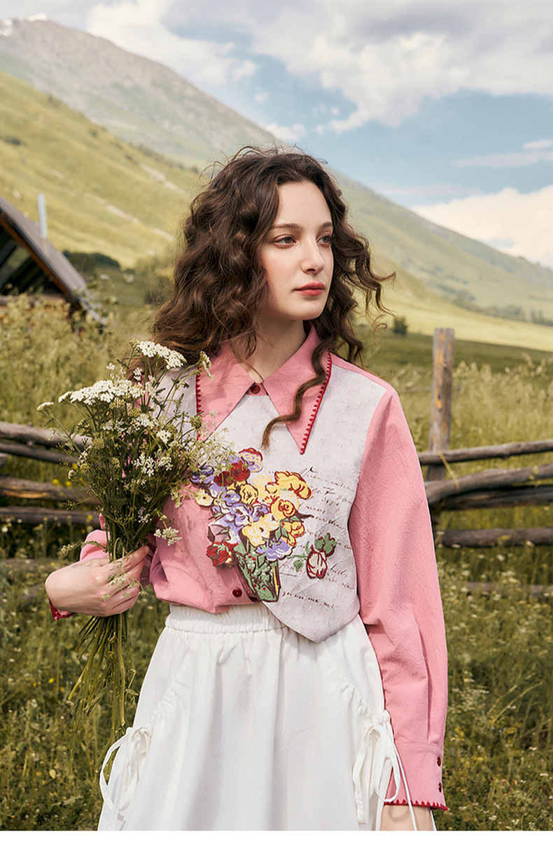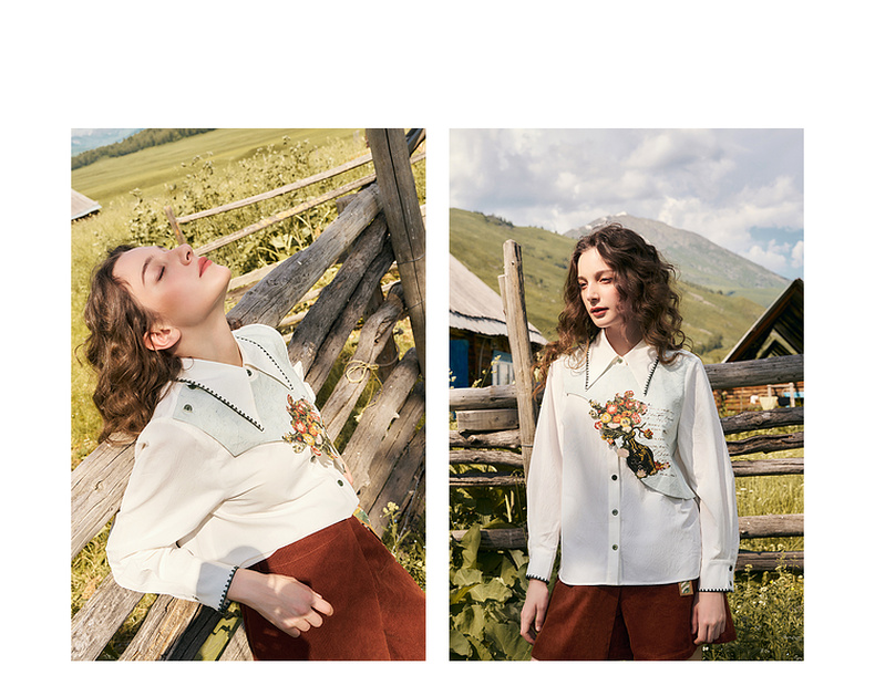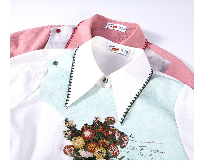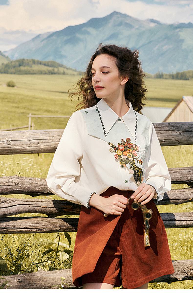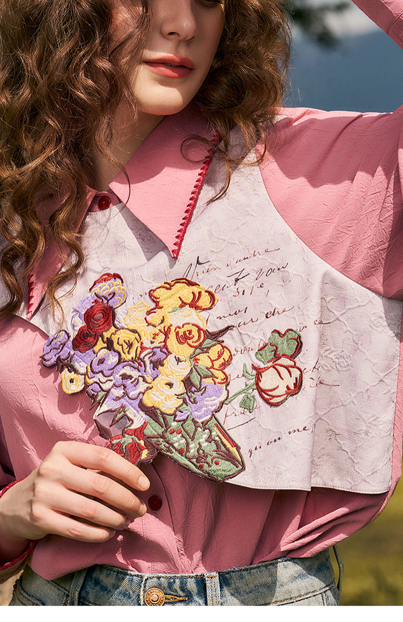 两三事梵高文艺热恋花束 森女风绣花布拼接长袖衬衫女S24QC456