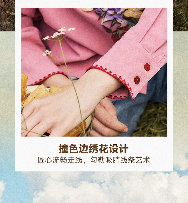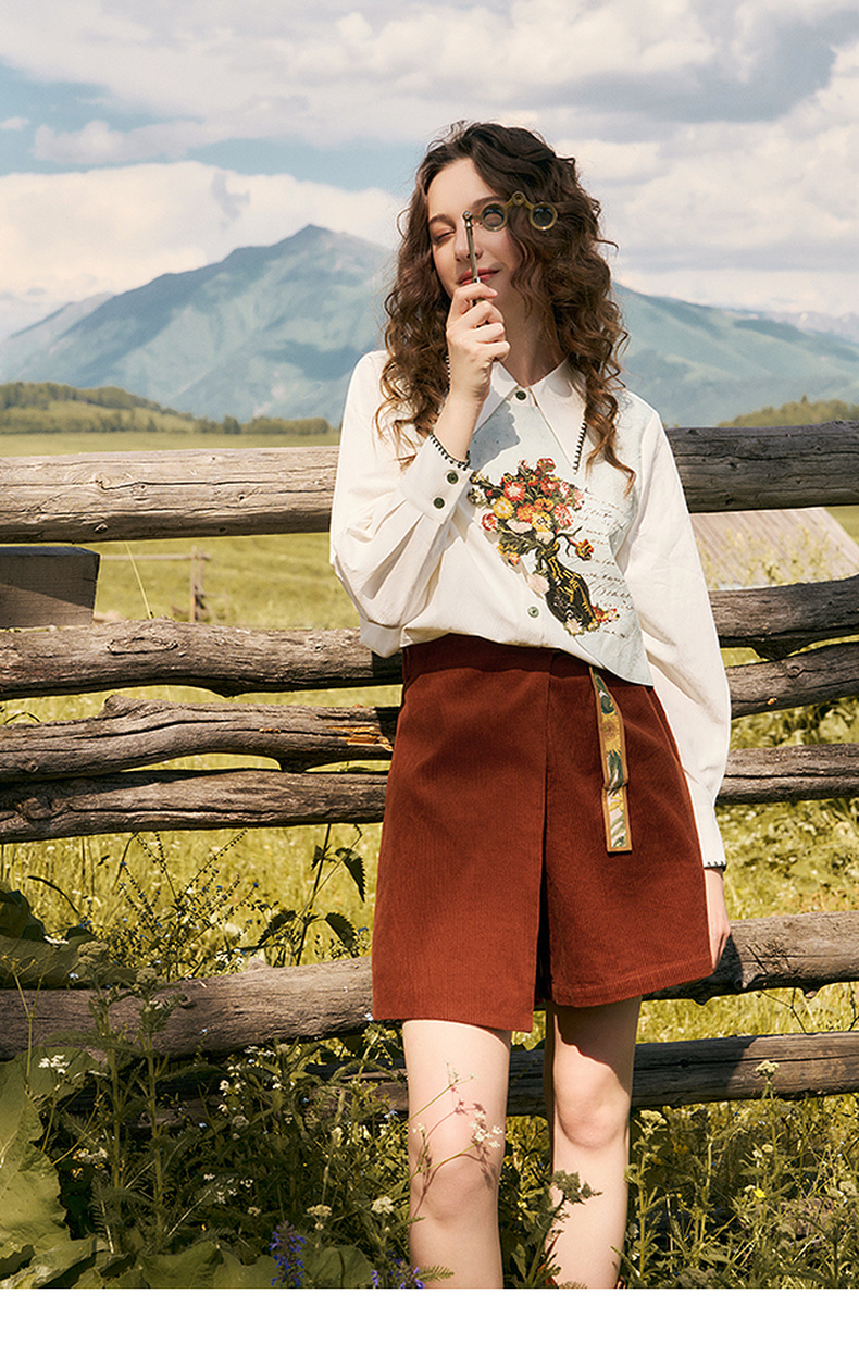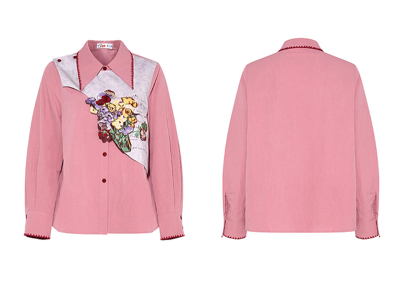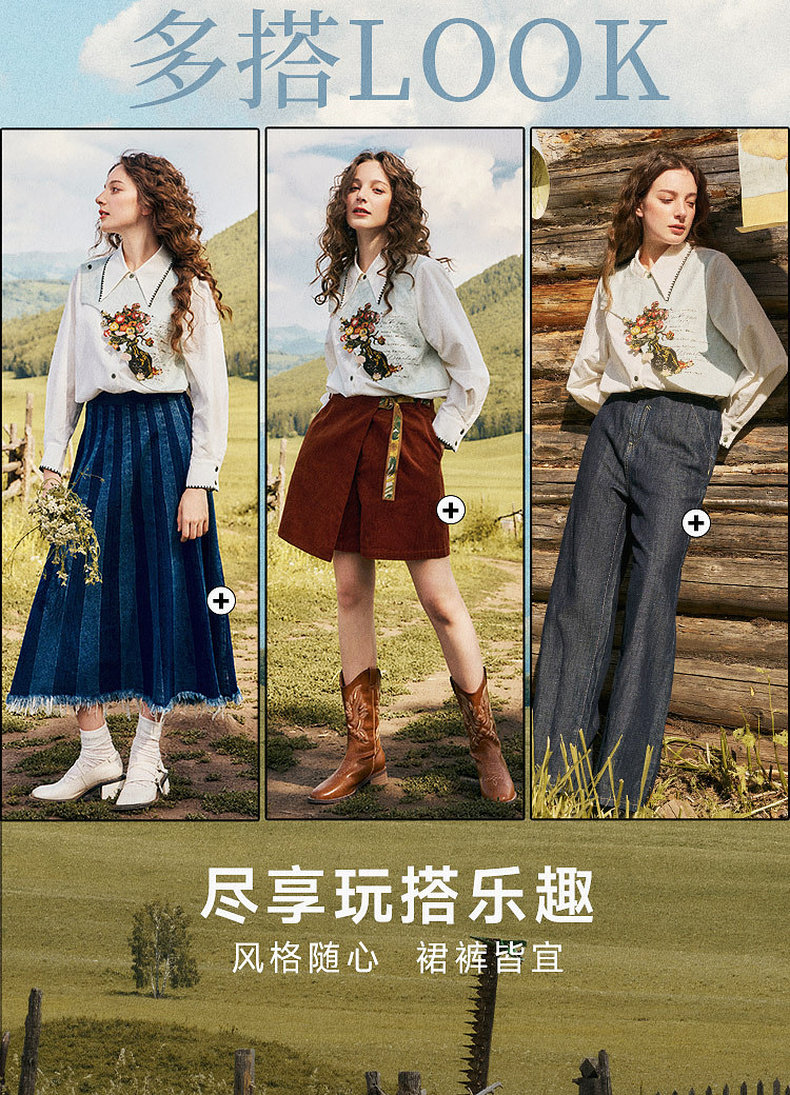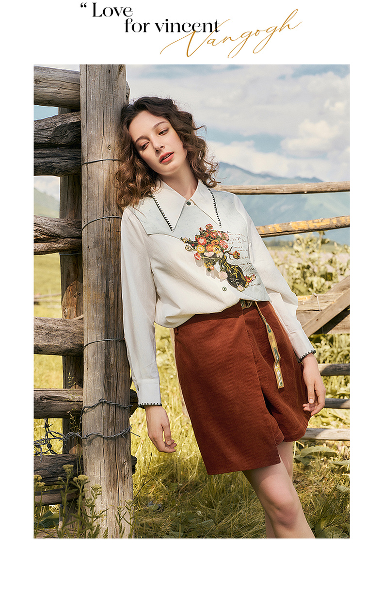 两三事梵高文艺热恋花束 森女风绣花布拼接长袖衬衫女S24QC456