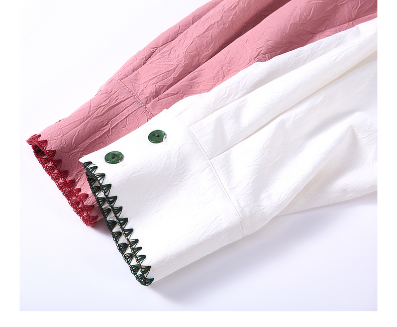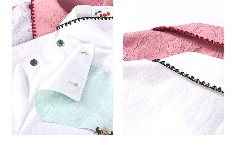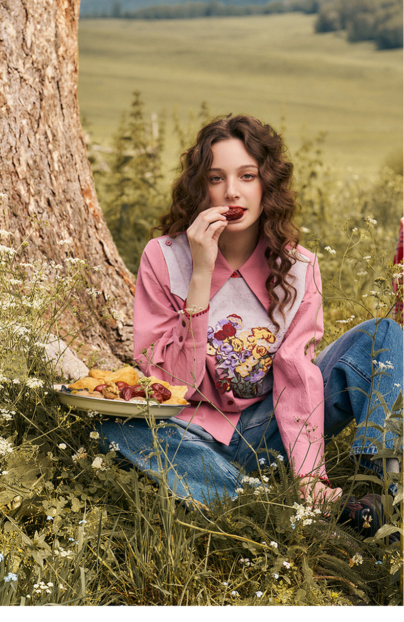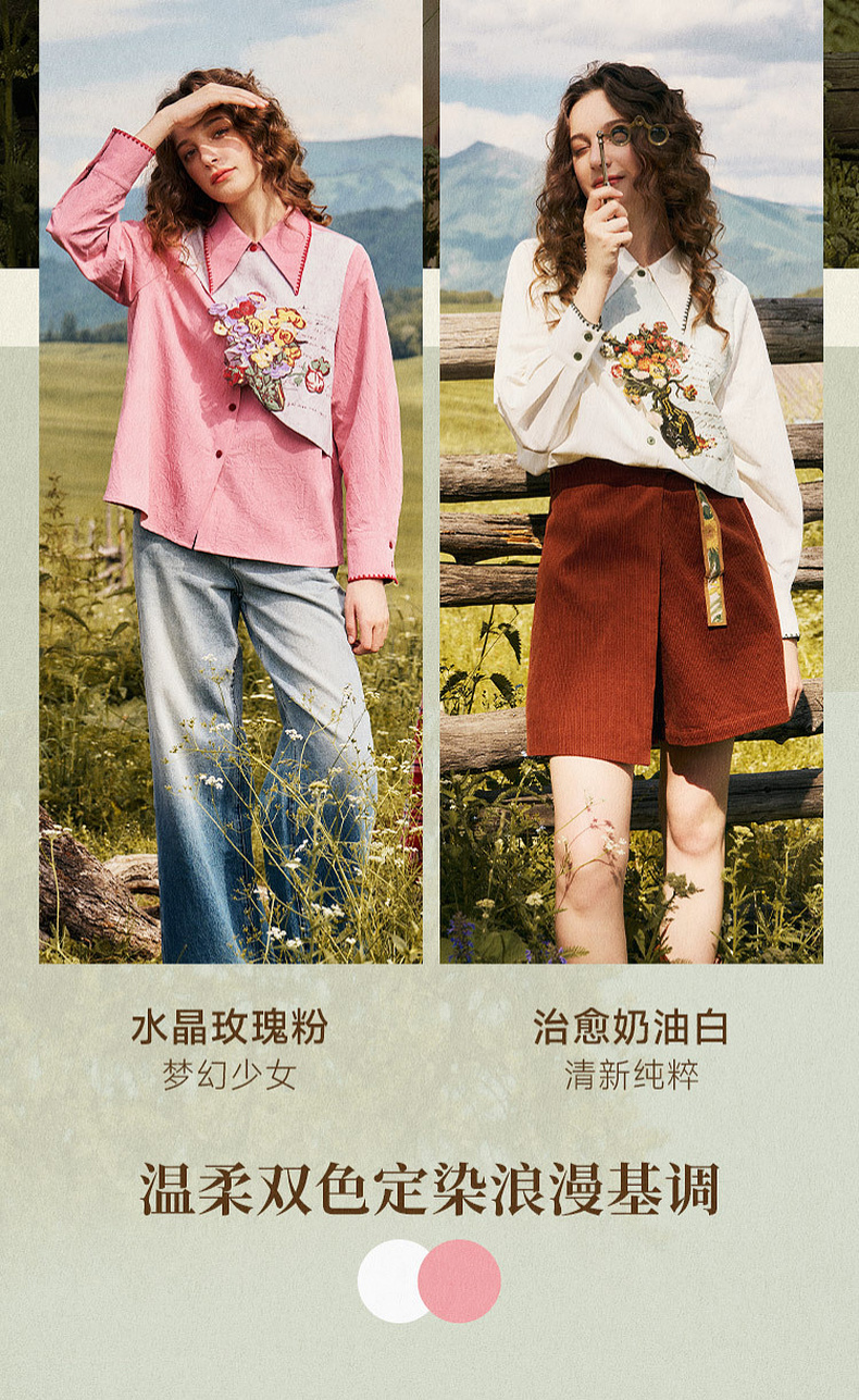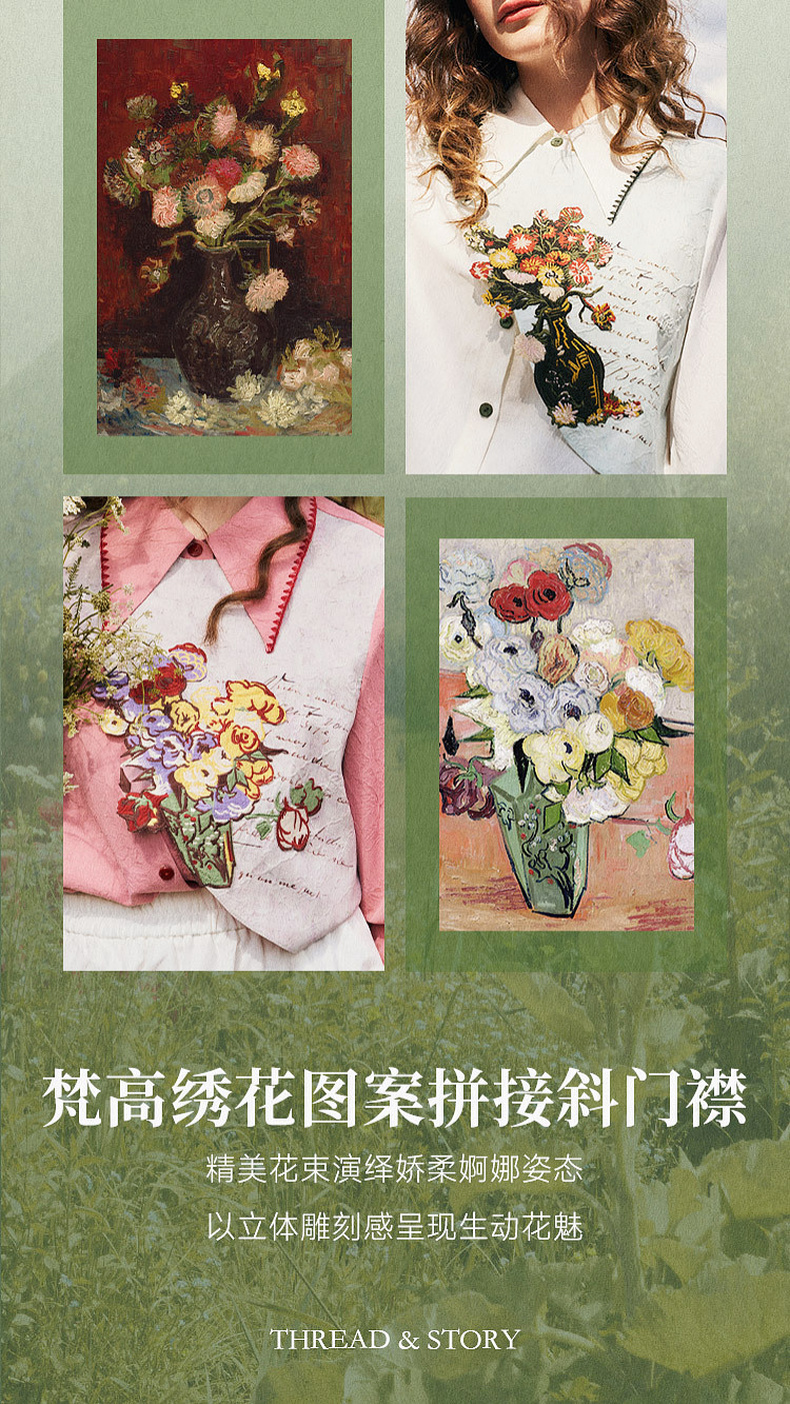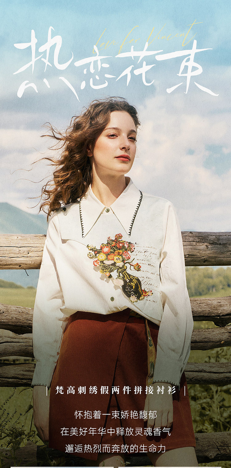 两三事梵高文艺热恋花束 森女风绣花布拼接长袖衬衫女S24QC456