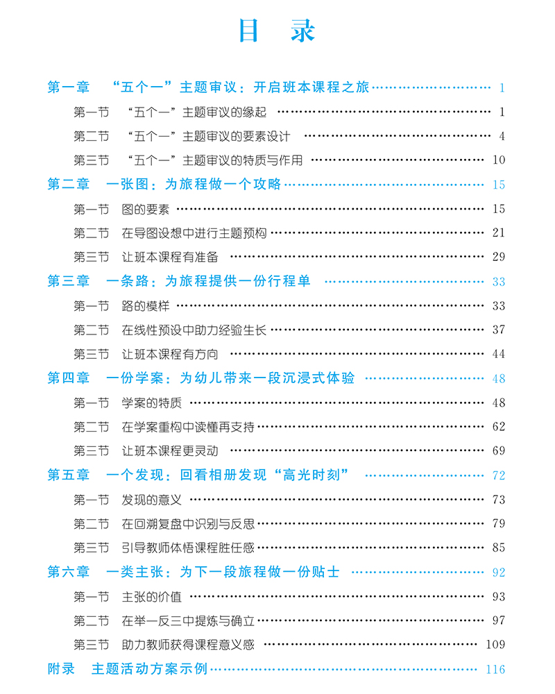 全书架构清晰,兼具理论深度与实践指导性:第一章直击当前班本课程建构中的常见误区,帮助教师规避实践陷阱,同时精准阐释 “五个一” 主题审议研修工具的核心内涵,奠定认知基础;第二至六章则逐一深入解读每个工具的具体实施路径,通过大量真实案例生动展示“一张图如何盘点资源”“一条路如何规划课程脉络” 等实操细节,让教师能直观理解、快速上手;附录部分精选完整案例,全景呈现教师运用 “五个一” 工具建构主题活动方案的全过程,为实践提供可直接参照的范本。