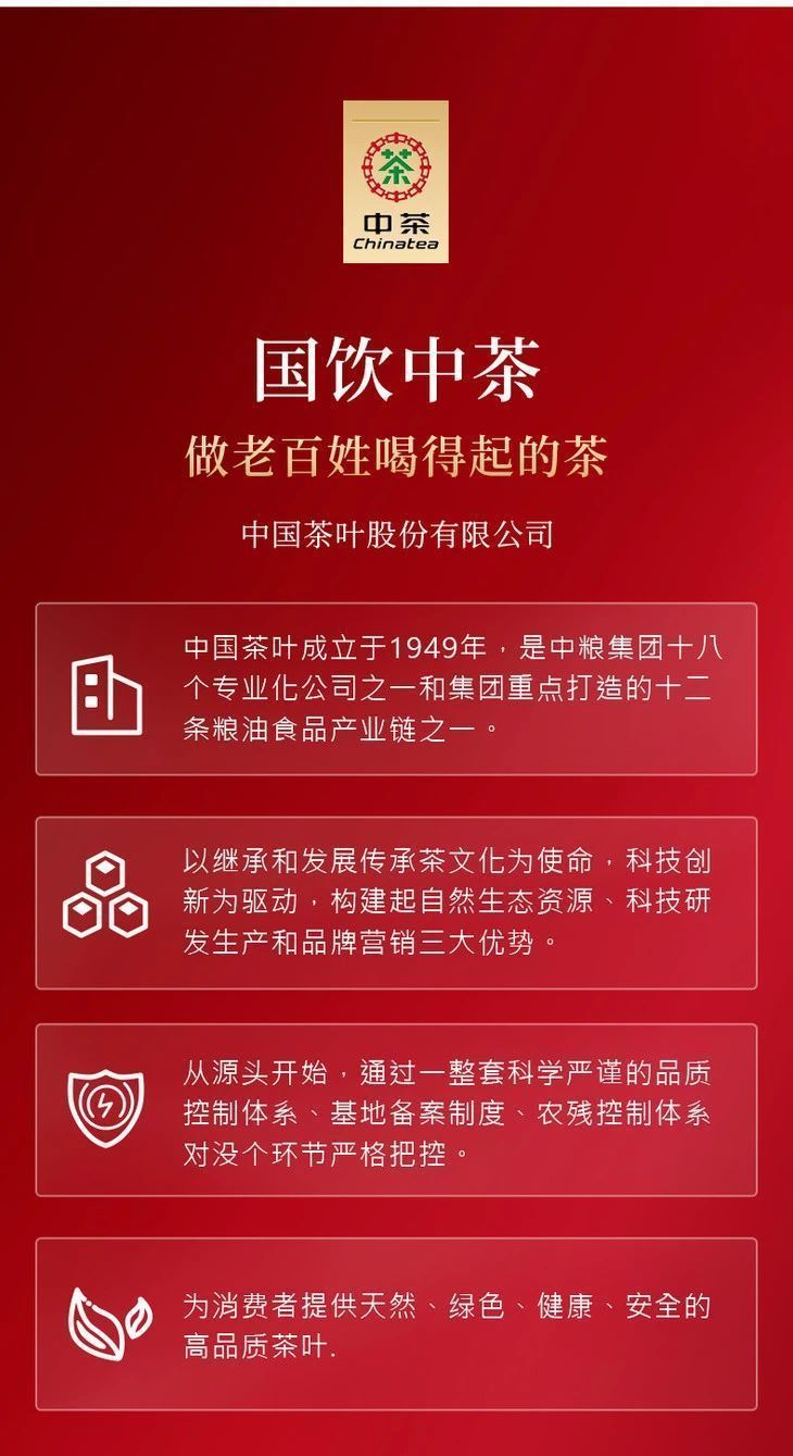 - 中茶是中粮集团十八个专业化公司之一和集团重点打造的十二条粮油食品产业链之一。中国茶叶以继承和发展中华传统茶文化为使命,秉承自然、生态、安全、健康的理念。