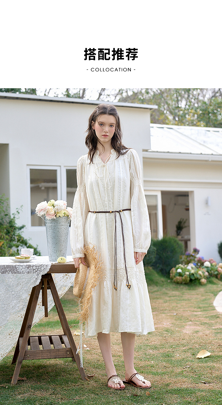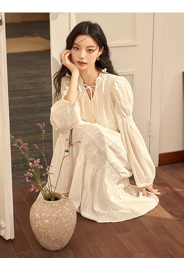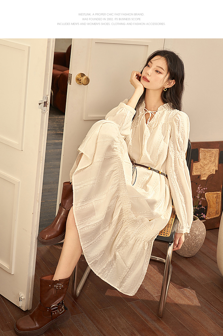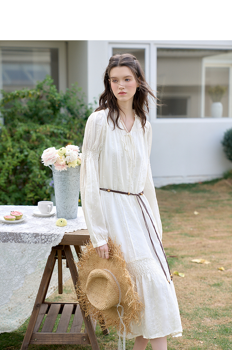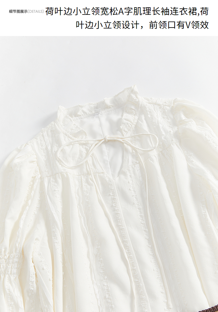 西遇V领泡泡袖长裙女新款宽松A字肌理长袖白色连衣裙11938189