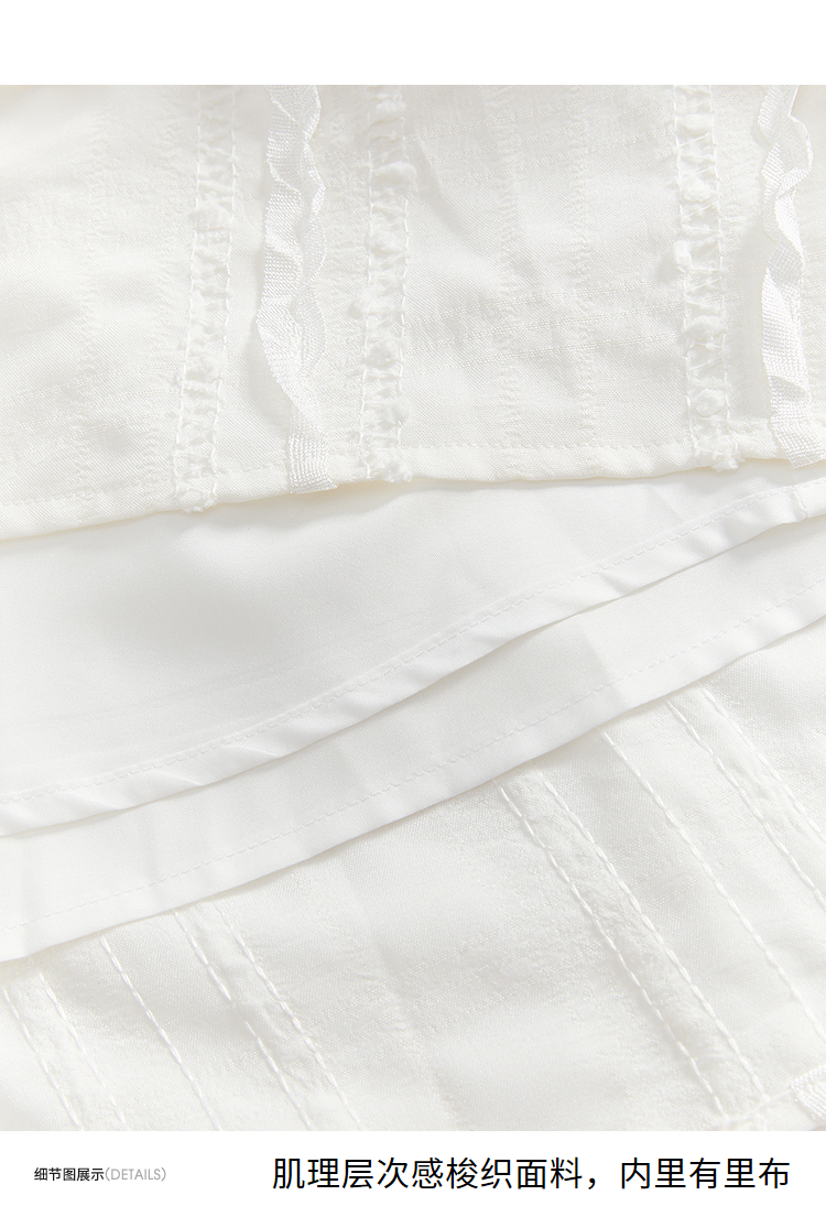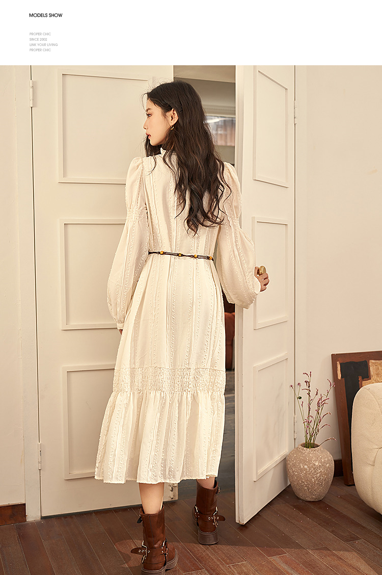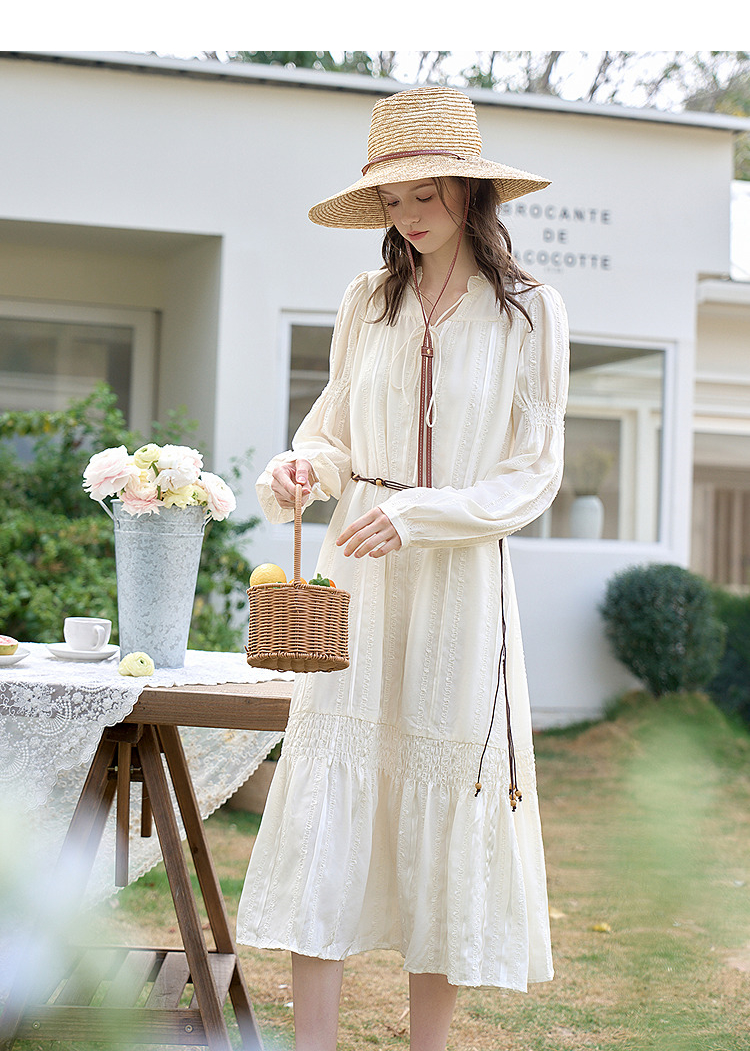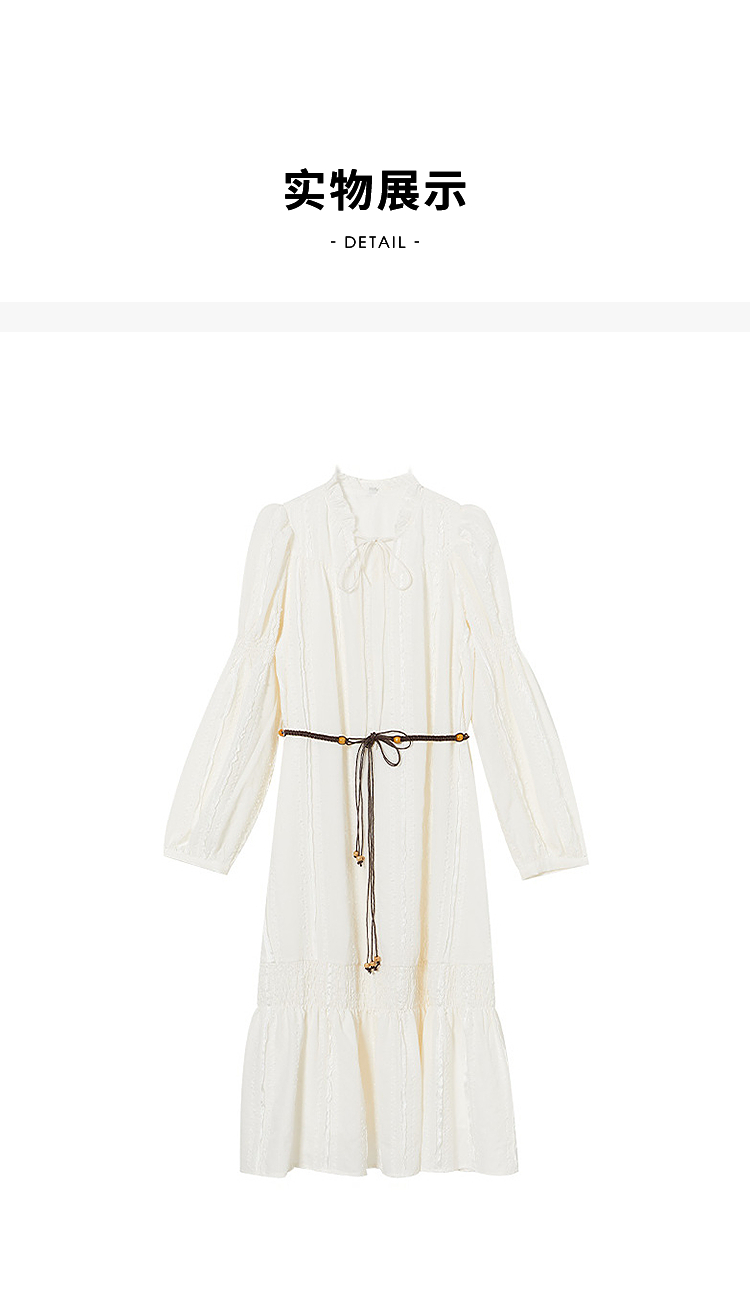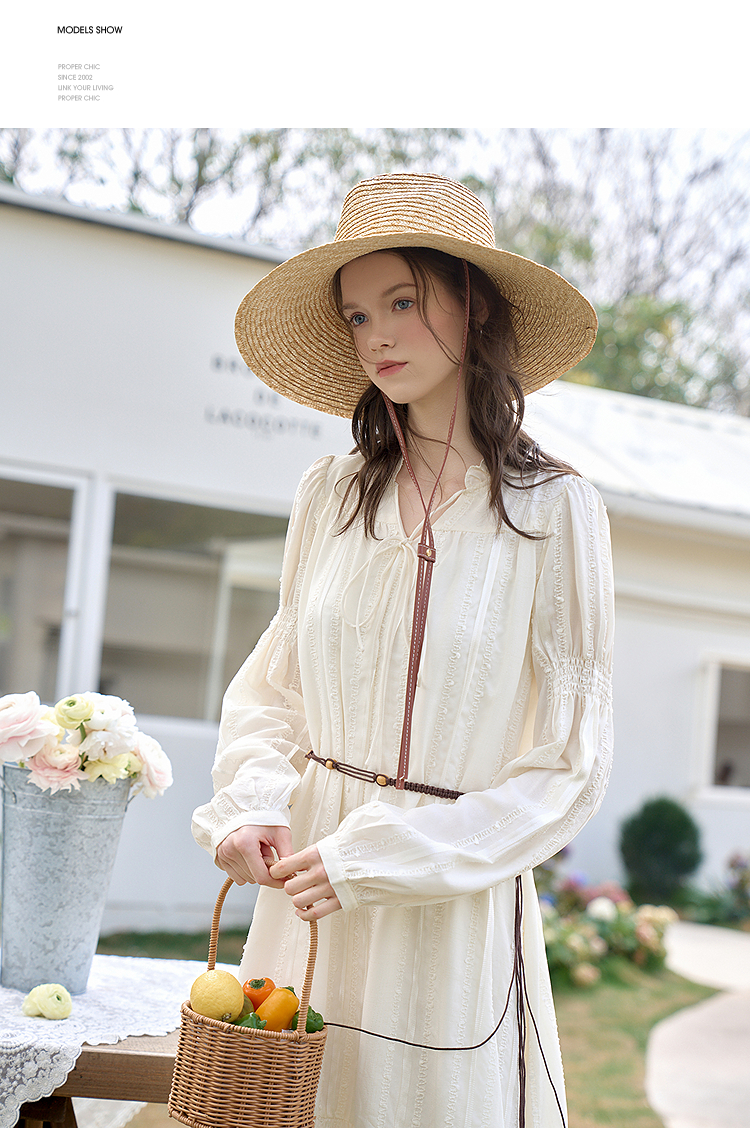 西遇V领泡泡袖长裙女新款宽松A字肌理长袖白色连衣裙11938189