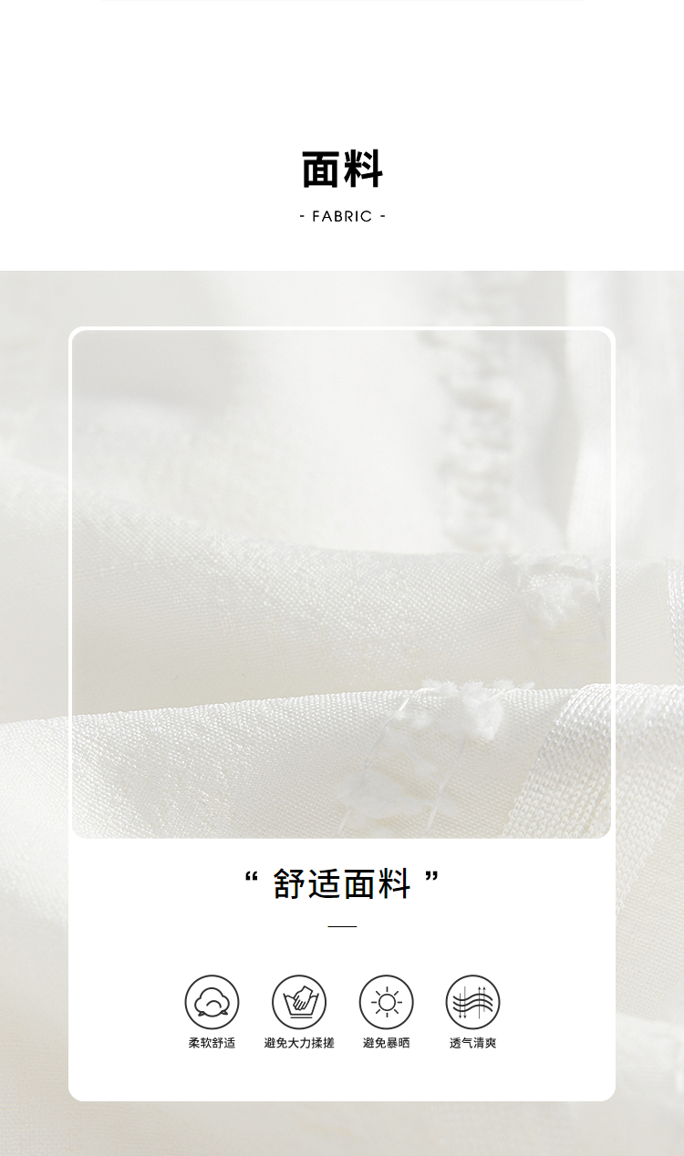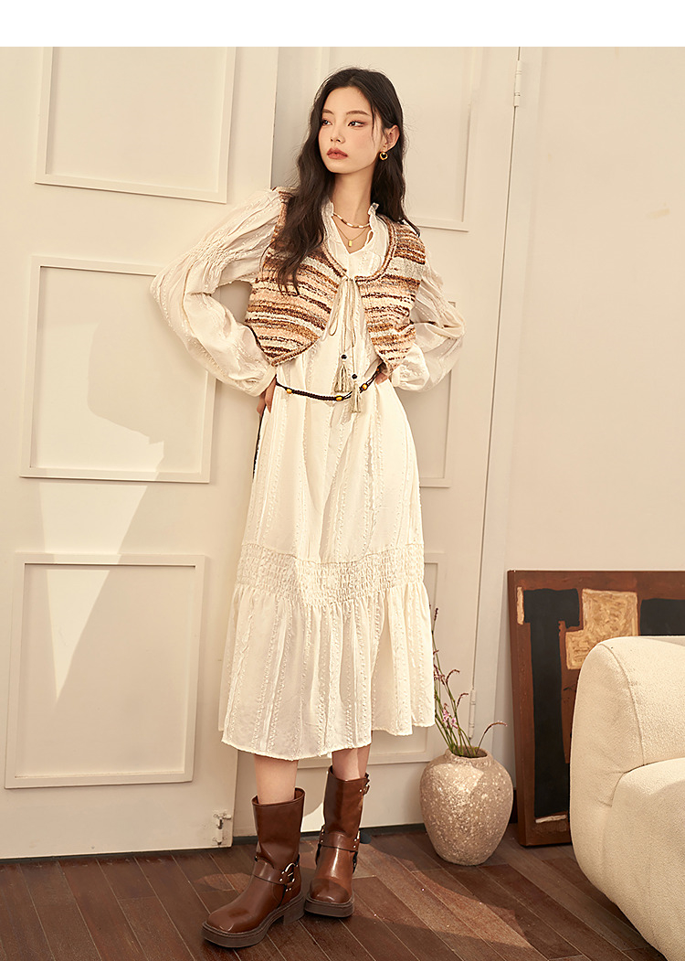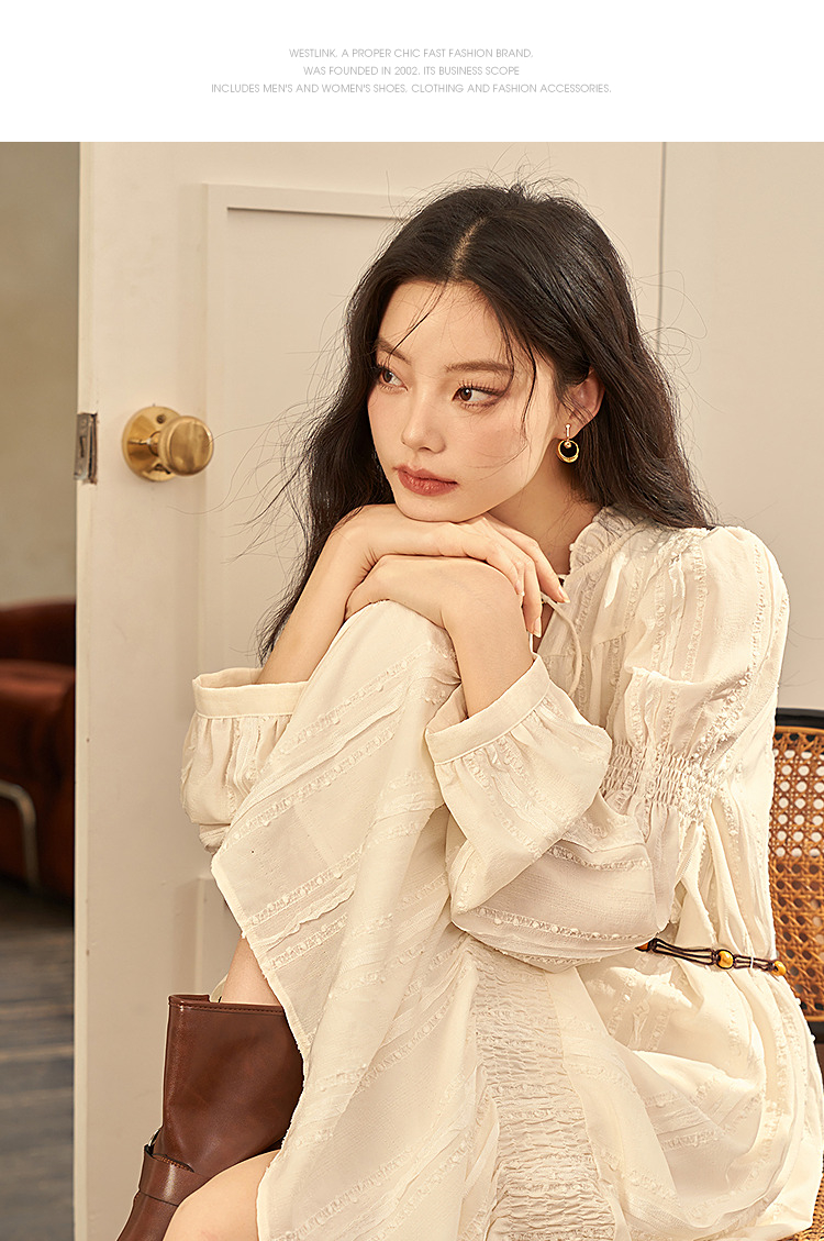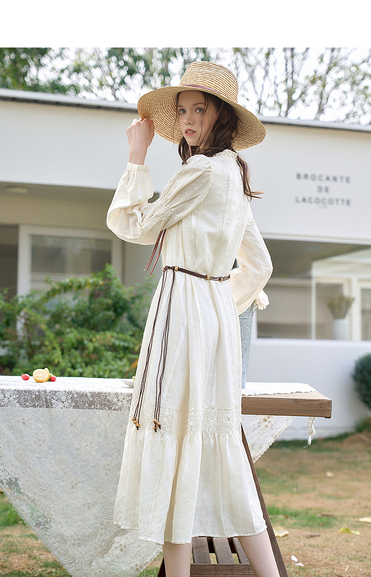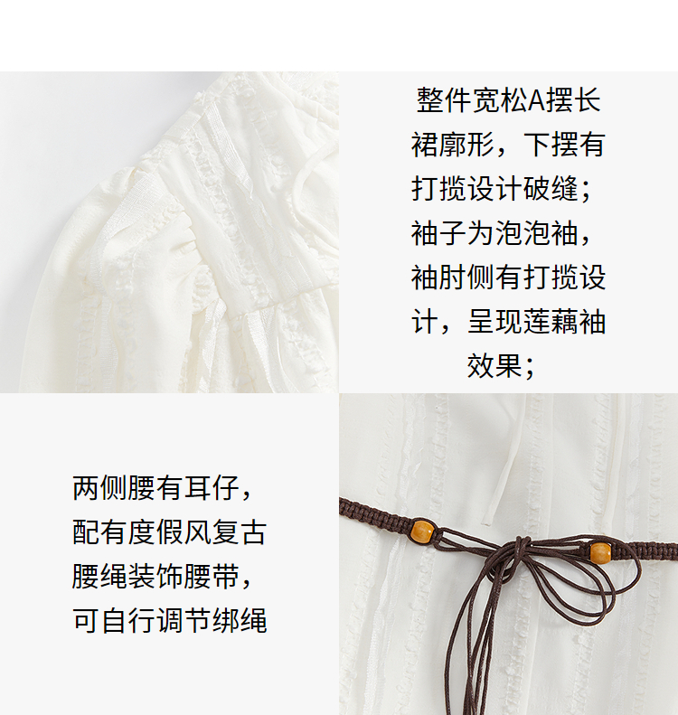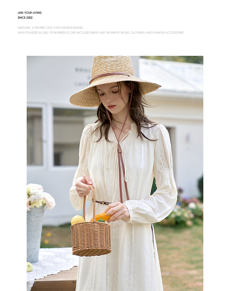 西遇V领泡泡袖长裙女新款宽松A字肌理长袖白色连衣裙11938189