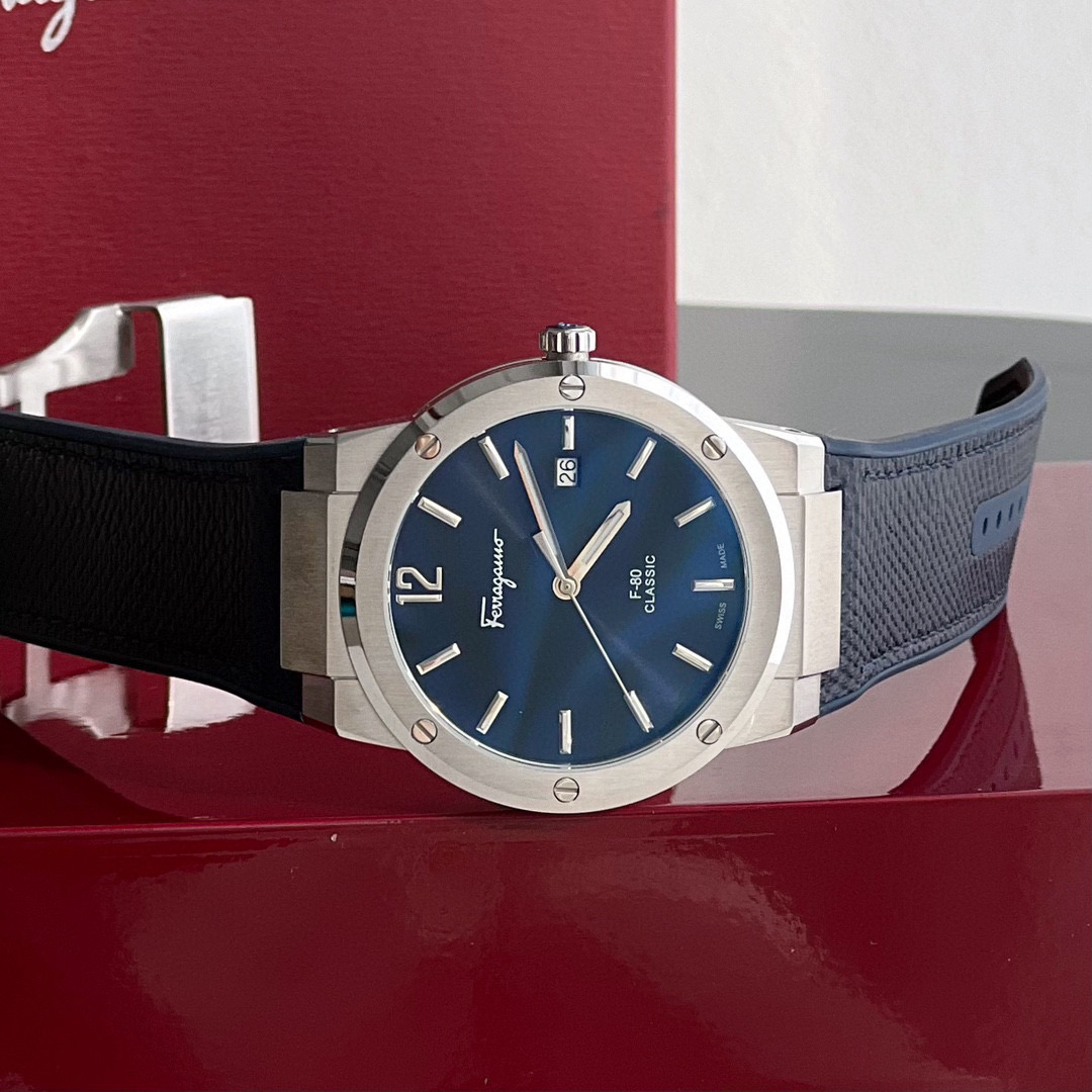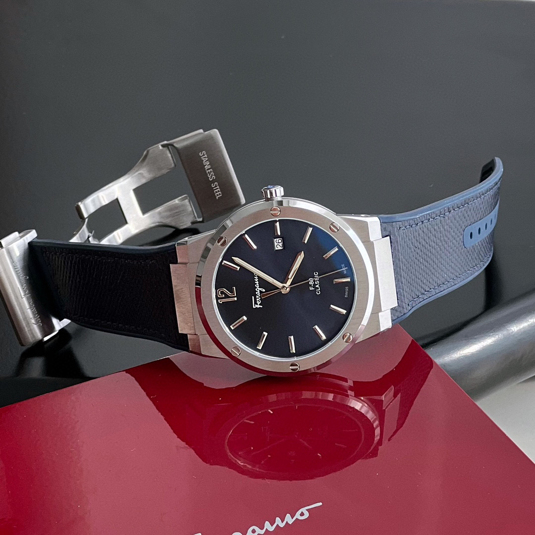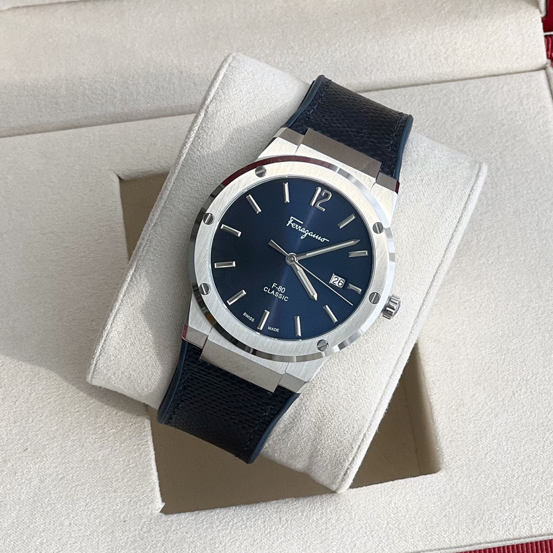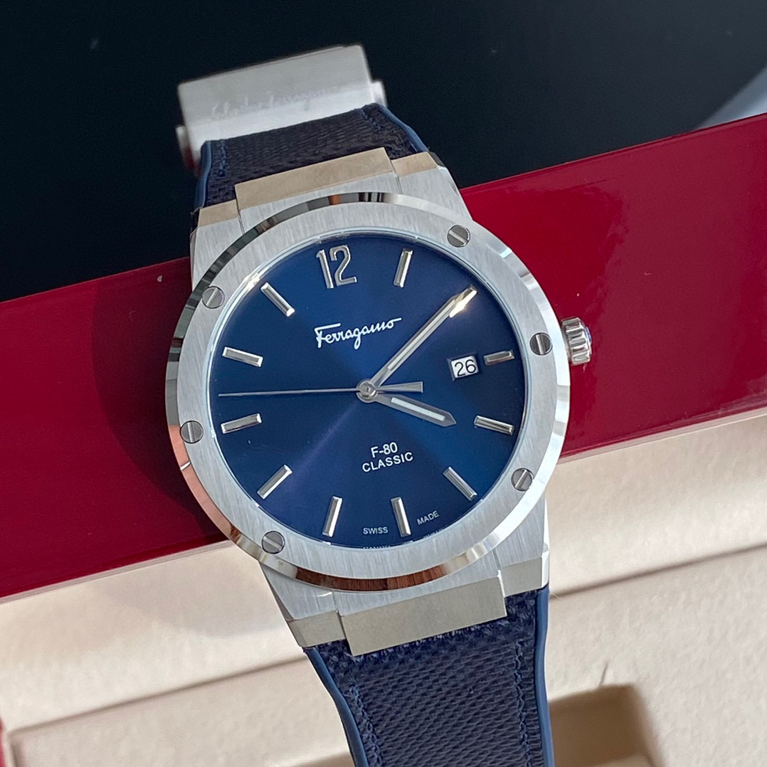新款首发!外贸出口订单,Ferragmo F-80 Slim系列,简约优雅时尚男表;表径:41mm,采用纤薄的表壳,运动的气质;鳄鱼纹蛇纹小牛皮搭配橡胶表带,运动与优雅联合,彰显匠心精工品质,防水防汗佩戴舒适;简约太阳纹盘面,经典大气三针设计,立体时标Logo增添视觉层次感,硬朗螺钉精钢表壳,拉丝工艺,搭配齿轮F浮雕表冠,突显现代都市型男格调;底盖镌刻Ferragamo总部斯皮尼图案。蓝宝石水晶镜面;瑞士石英机芯,性能稳定,走时精准,50米防水,配原盒包装一手好价!