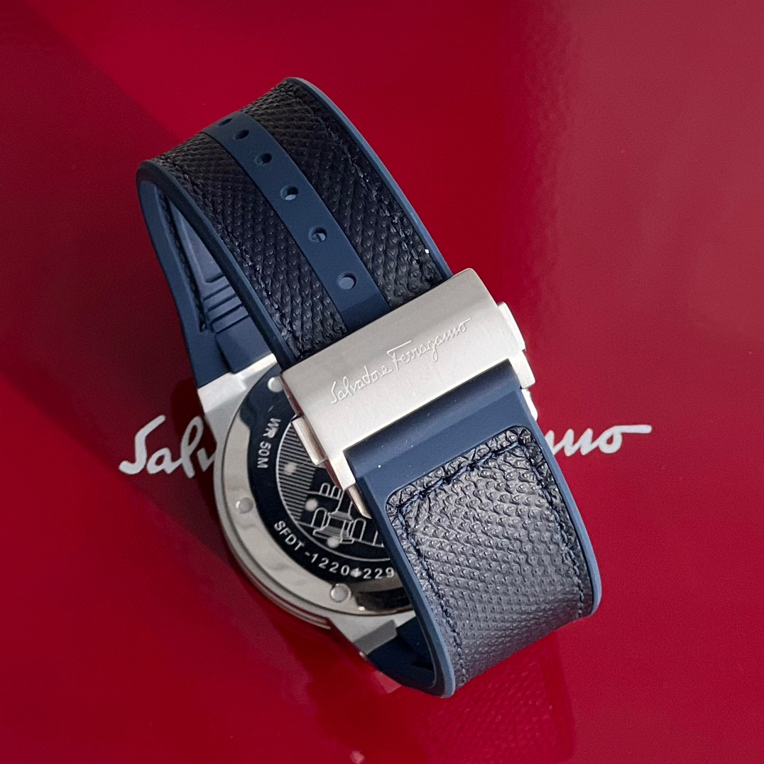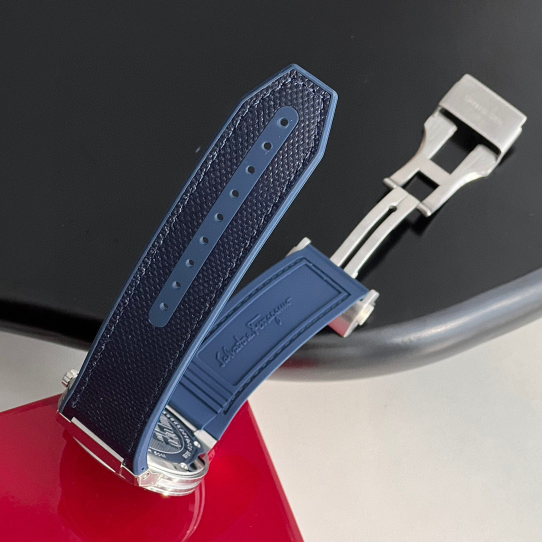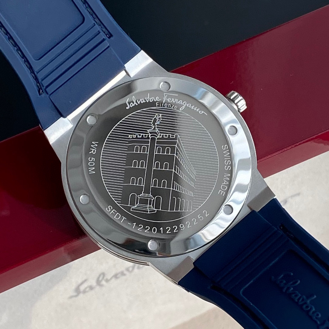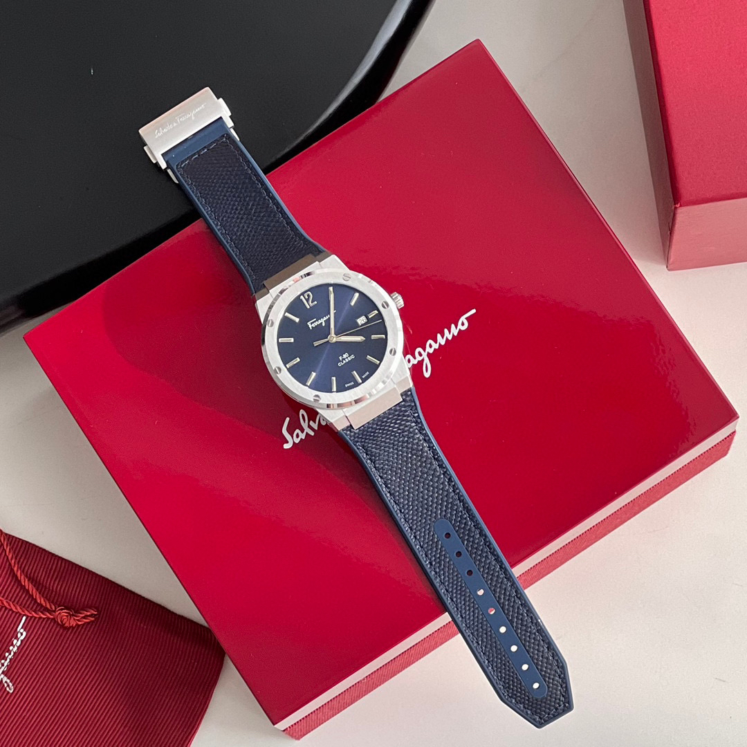 新款首发!外贸出口订单,Ferragmo F-80 Slim系列,简约优雅时尚男表;表径:41mm,采用纤薄的表壳,运动的气质;鳄鱼纹蛇纹小牛皮搭配橡胶表带,运动与优雅联合,彰显匠心精工品质,防水防汗佩戴舒适;简约太阳纹盘面,经典大气三针设计,立体时标Logo增添视觉层次感,硬朗螺钉精钢表壳,拉丝工艺,搭配齿轮F浮雕表冠,突显现代都市型男格调;底盖镌刻Ferragamo总部斯皮尼图案。蓝宝石水晶镜面;瑞士石英机芯,性能稳定,走时精准,50米防水,配原盒包装一手好价!
