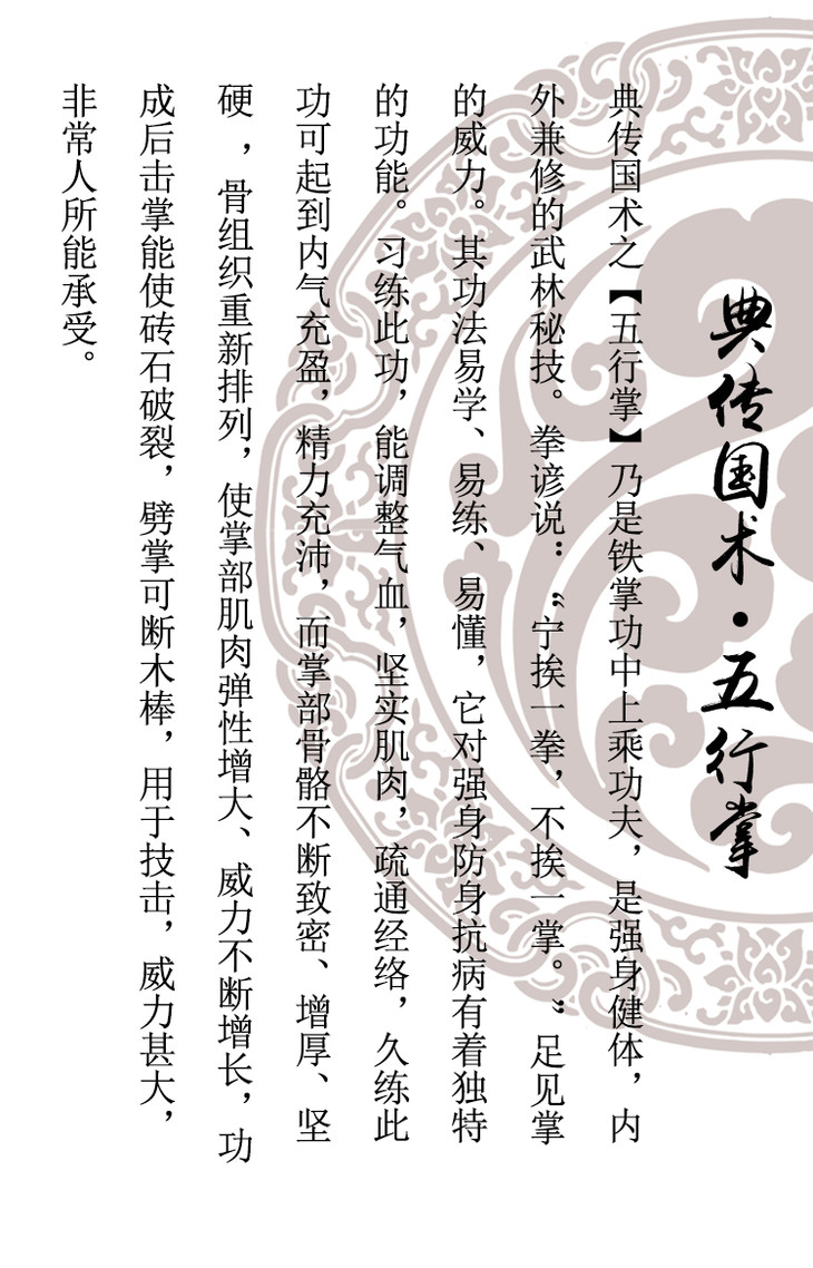 - 典传筋骨,传承于中华武术训练体系最精华部分,与解剖学、人体力学等科学理论相融合,致力于人体筋骨结构的内在开发与强化,为健康打下坚实基础。