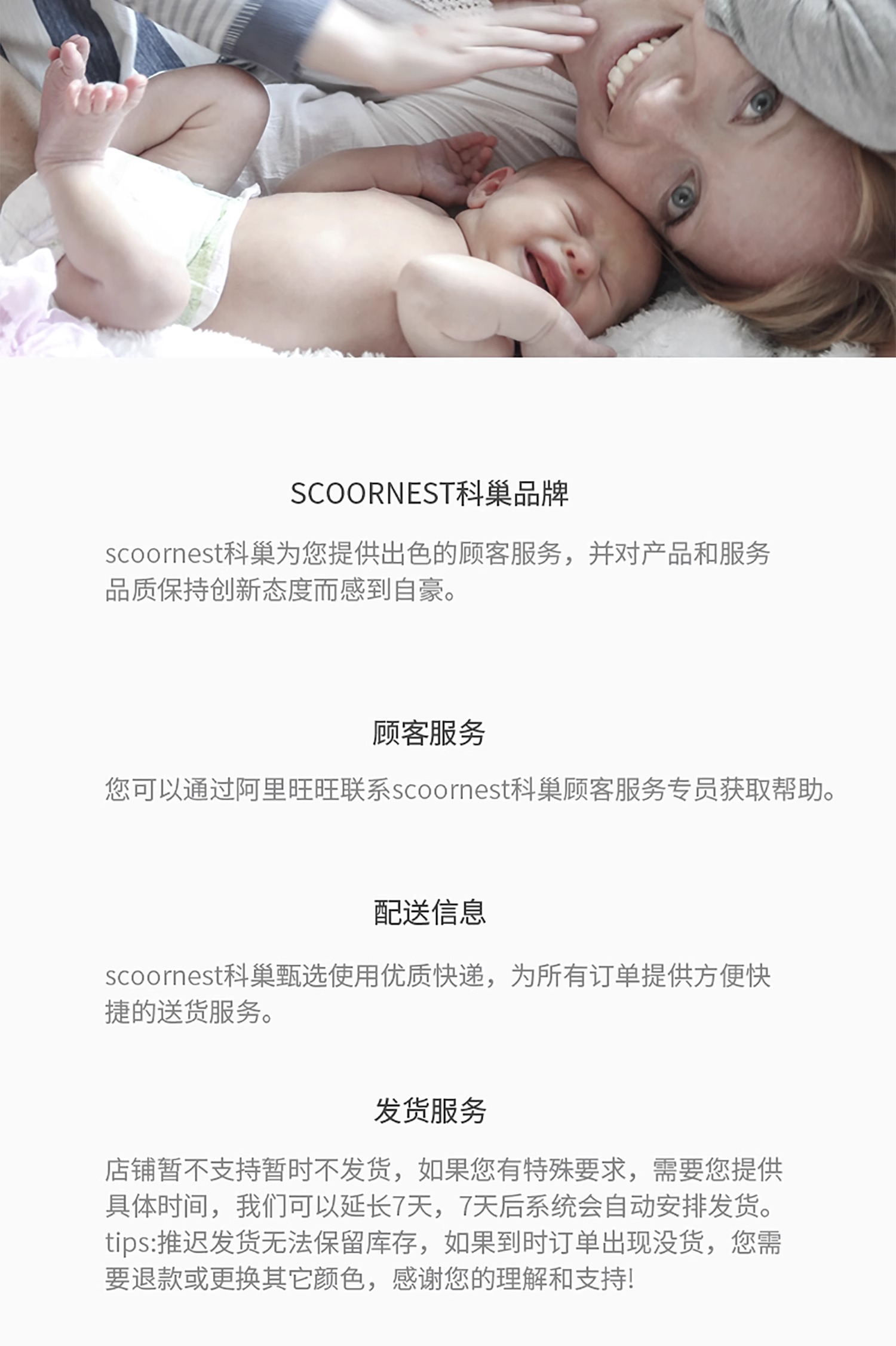 - Scoornest始终秉承给每一位宝宝送去科学的、关心的、创新的成长体验,通过提供商品和服务,使顾客形成守护、发展、巩固这种弥足珍贵的亲情的爱。