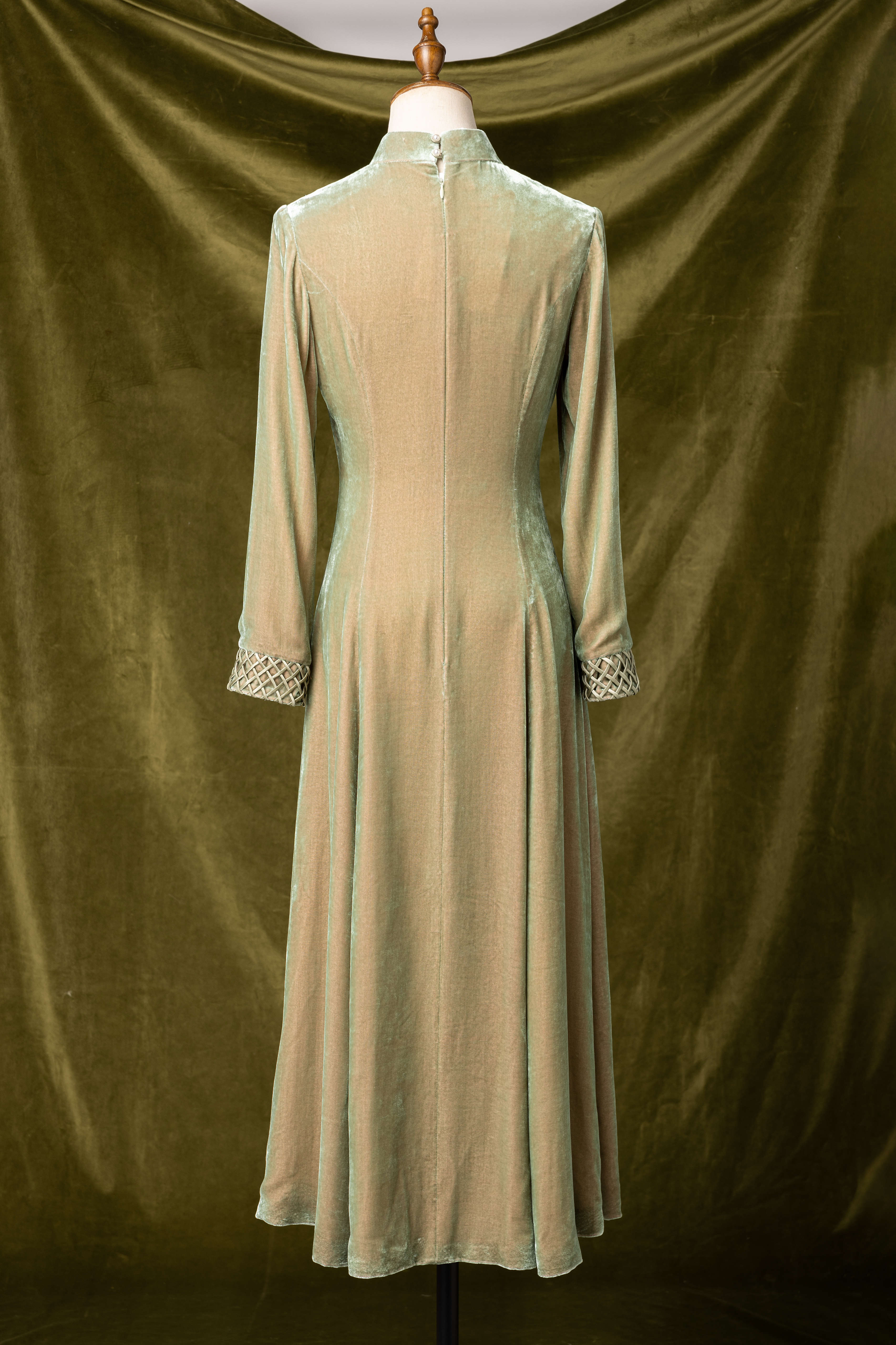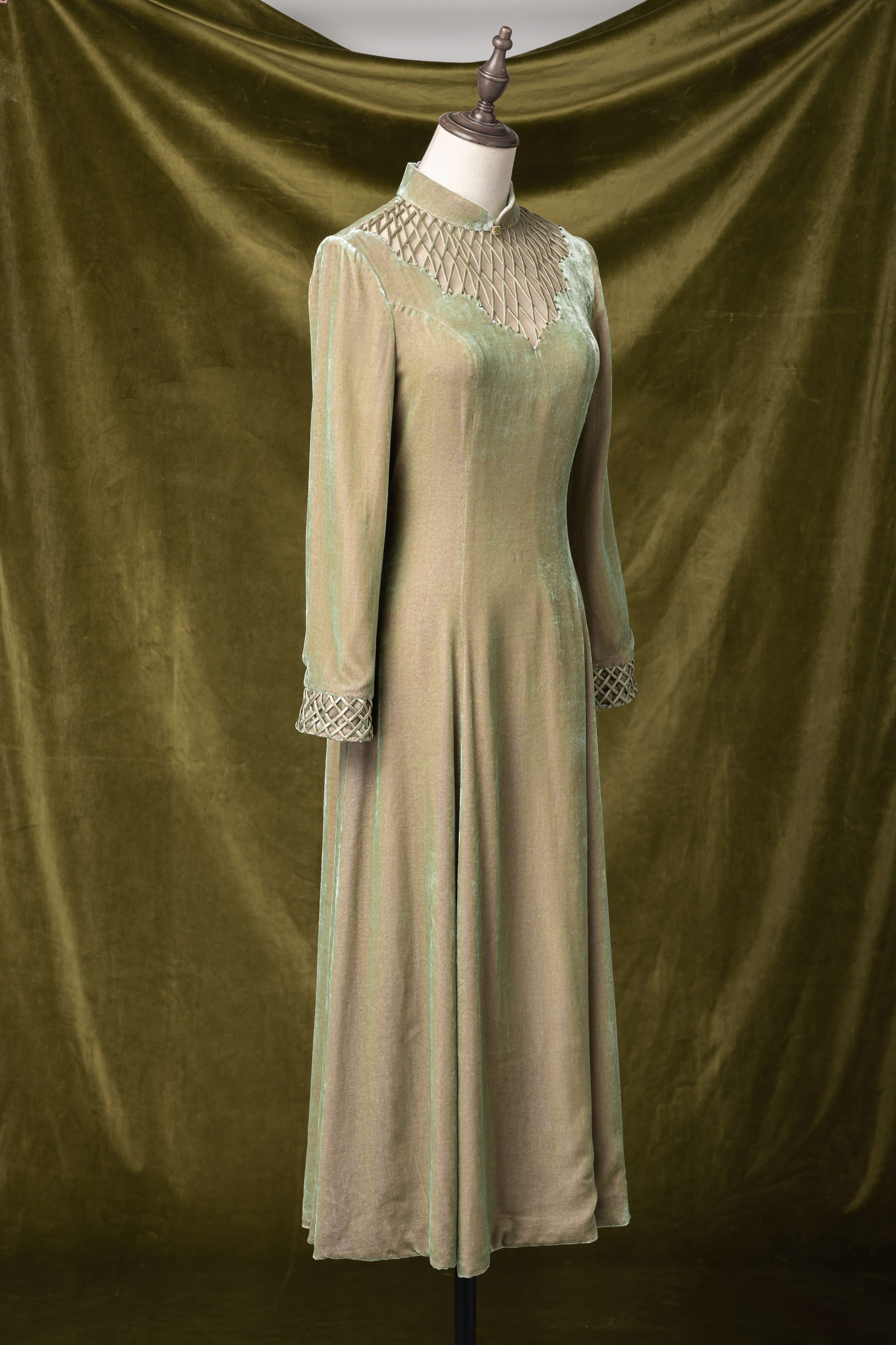 荷言HEYEN绿烟清辉 绿色编织真丝丝绒改良旗袍裙手工高级定制时装周 商品图5