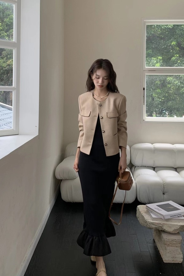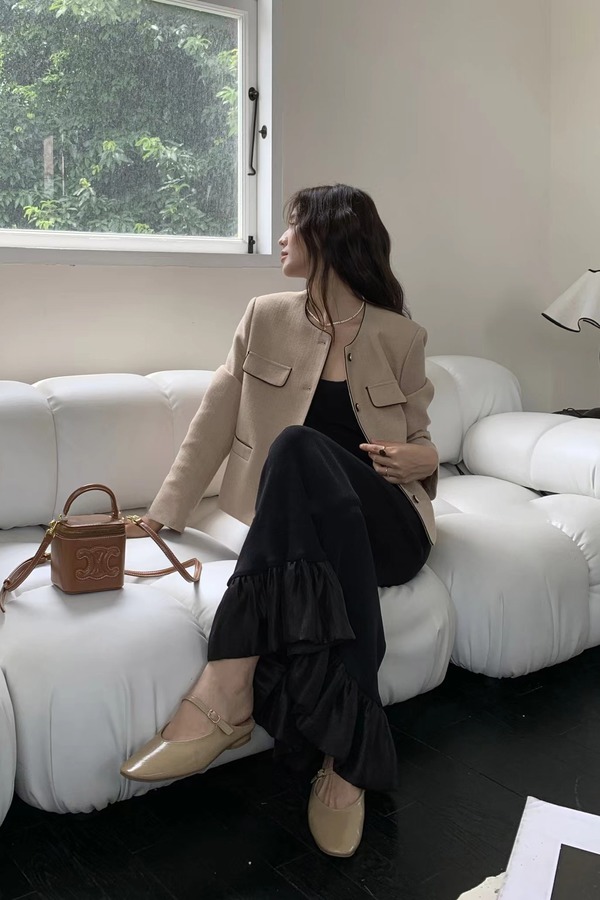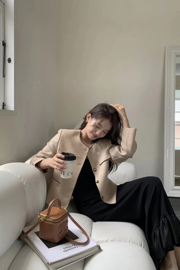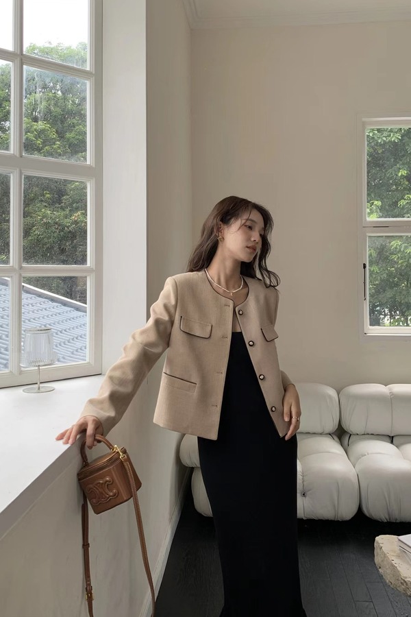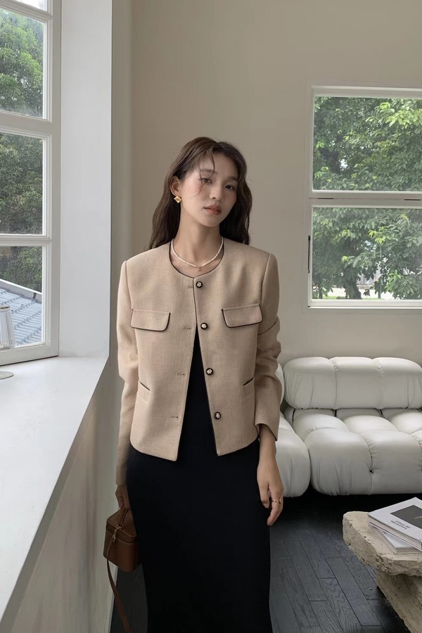 Le Malene 浅卡其色明线小香风圆领西装外套 18802