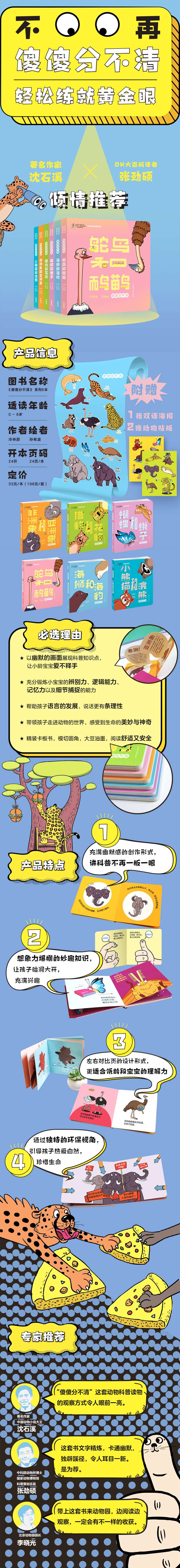 这是一套低幼科普绘本,文字简单易懂,插画幽默风趣。作者准确地抓住了低幼宝宝的关注点和兴趣点,用孩子们喜欢的表达方式,来传递动物科普知识。用心挑选了6对孩子们容易混淆错认的小动物:海狮和海豹、非洲象和亚洲象、蝴蝶和蛾子、鸵鸟和鸸鹋、猎豹和花豹、小熊猫和浣熊,引导孩子们从上到下,从左到右,从整体到局部等科学的观察方式,来发现两个动物之间的不同。从而真正掌握动物常识,不再走马观花式逛动物园。并在孩子们的心中,种下一粒科普的种子,对世界满怀好奇;同时也传达了动物保护的理念,期望他们成长为一个“世界公民”。