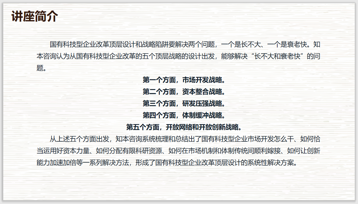 国企改革方法论 主要是在相关政策研究的基础上,结合典型案例,针对国有企业改革过程中存在的方方面的问题,提炼而出的具有实操性、系统性的解决方案。知本咨询国企改革方法论,聚焦于 混改和股权多元化、干部机制、三项制度、国企创新、两类公司、中长期激励、管控与治理优化、对标世界一流、国有企业产业整合和重组 等不同领域,为国有企业提供可快速落地的改革模型、改革路径、改革举措等,帮助国有企业早日实现改革目标。
