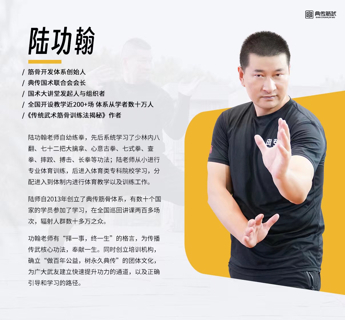 - 典传筋骨,传承于中华武术训练体系最精华部分,与解剖学、人体力学等科学理论相融合,致力于人体筋骨结构的内在开发与强化,为健康打下坚实基础。