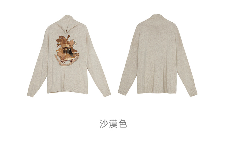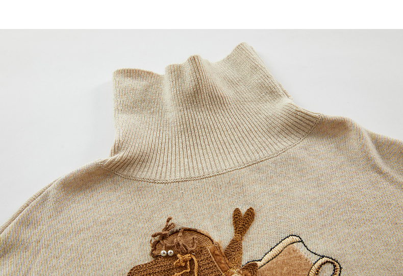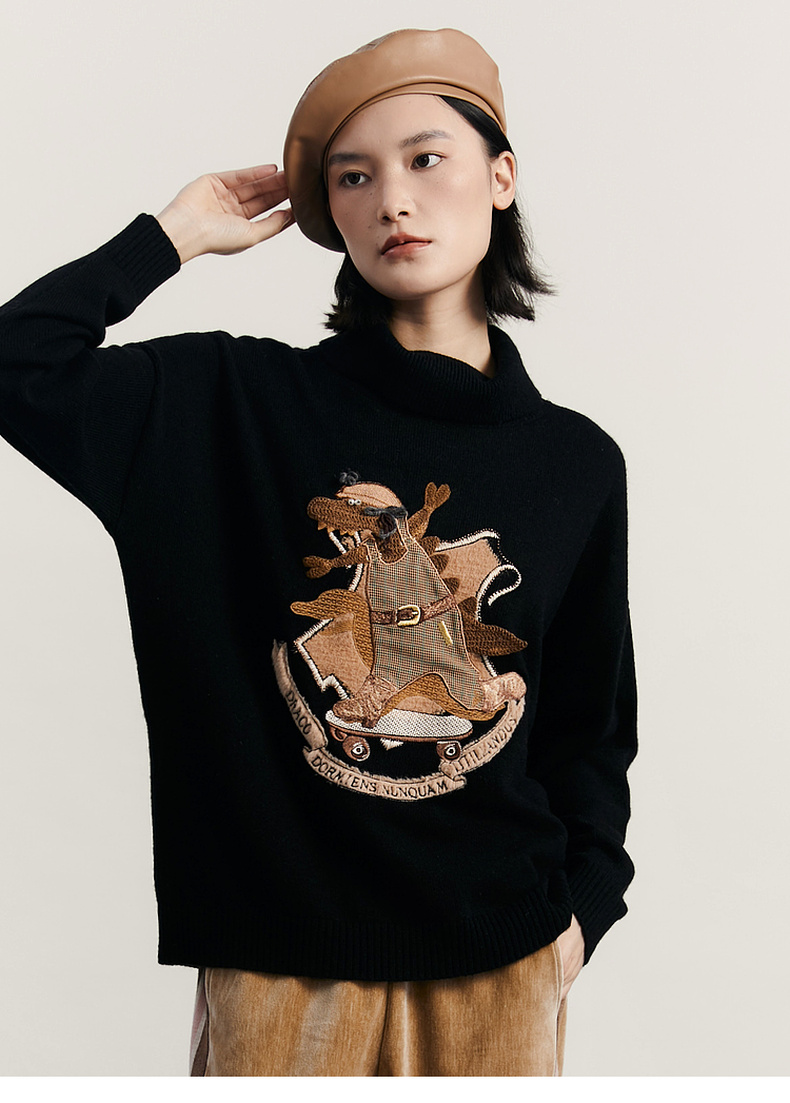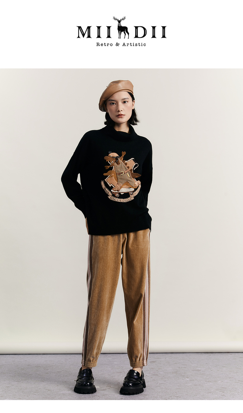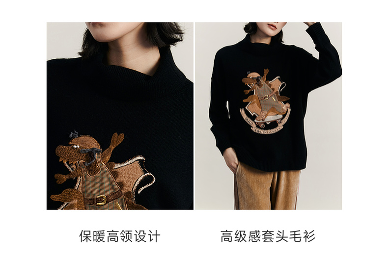 谜底高领针织衫女2023冬新品复古文艺绣花套头宽松毛衣234MZ1877