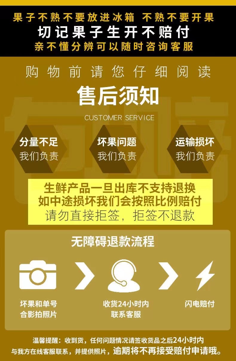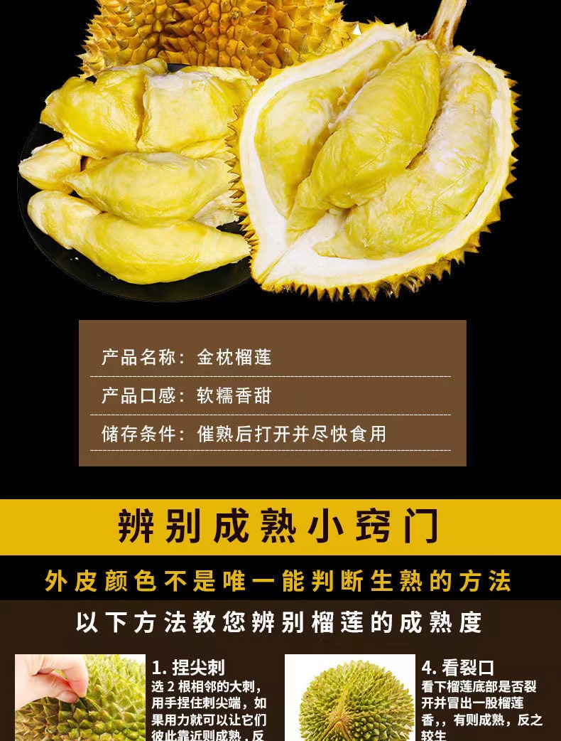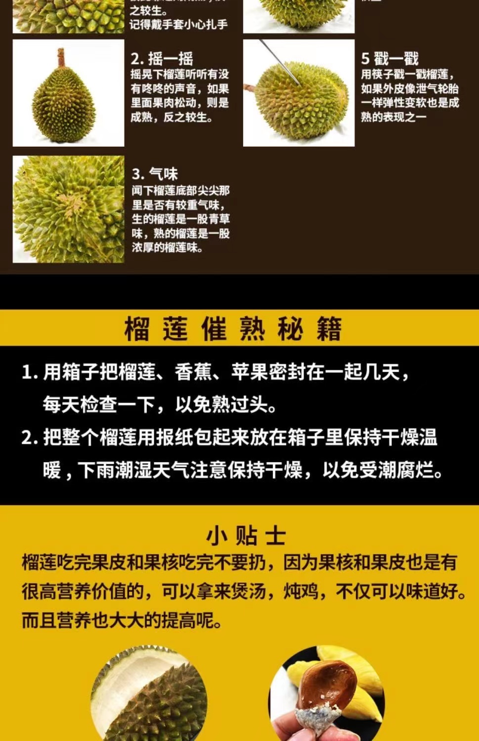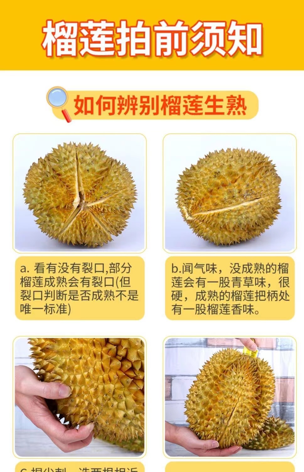 温馨提示:不满意包退,下单成功的小伙伴,当天取货,12小时之内完成取货,不然系统自动退款!下单须知:榴莲是一级金枕头,保证有3防左右肉如果出现生果我们无理由售后包换包退,榴莲3斤起售超出部分按照特价补差价!提货地址玛瑙湖小区赞鲜生超市,客服电话:15334881025