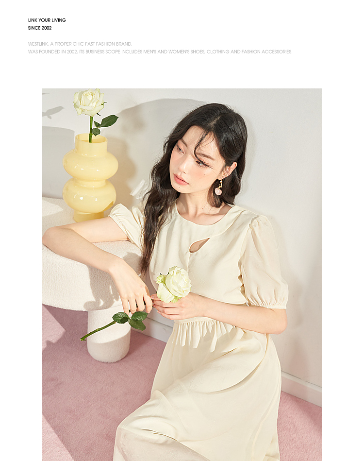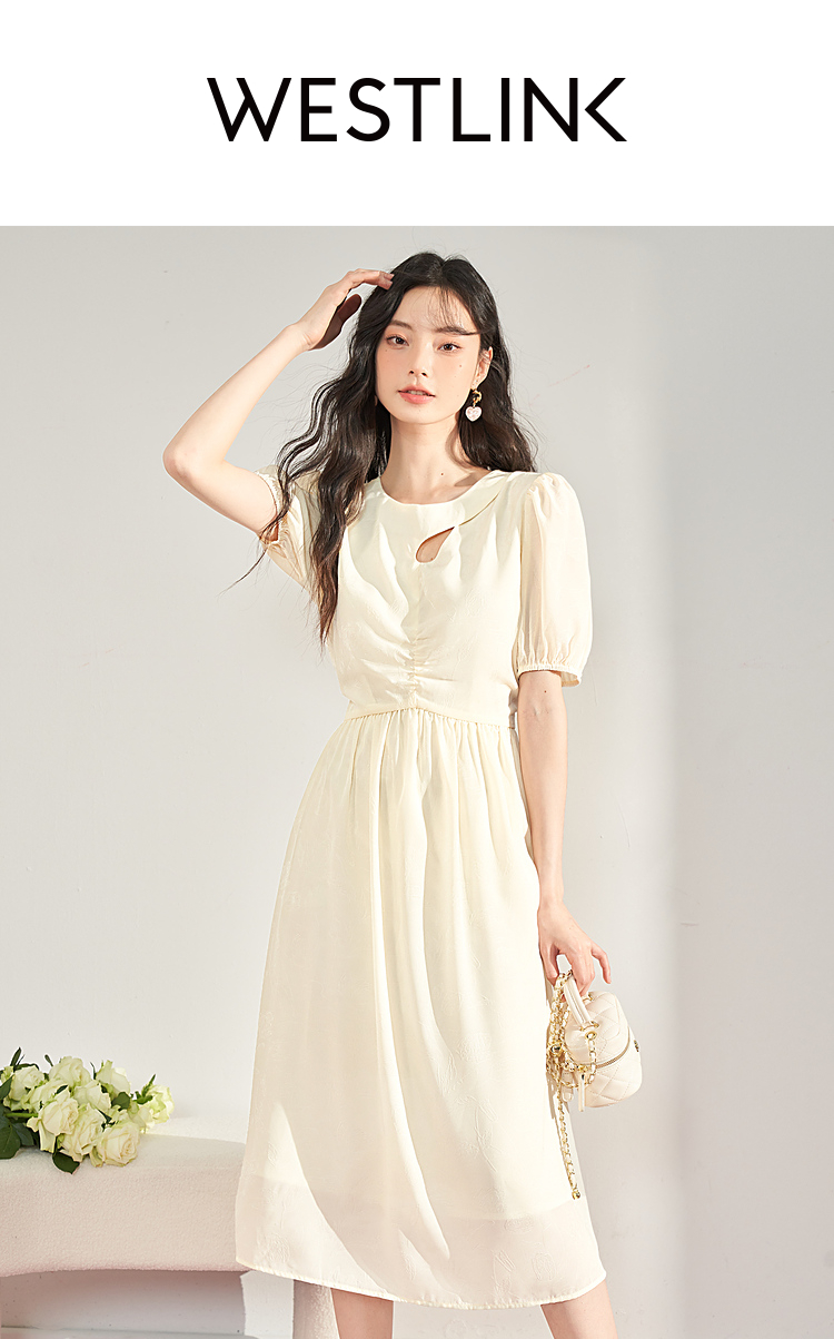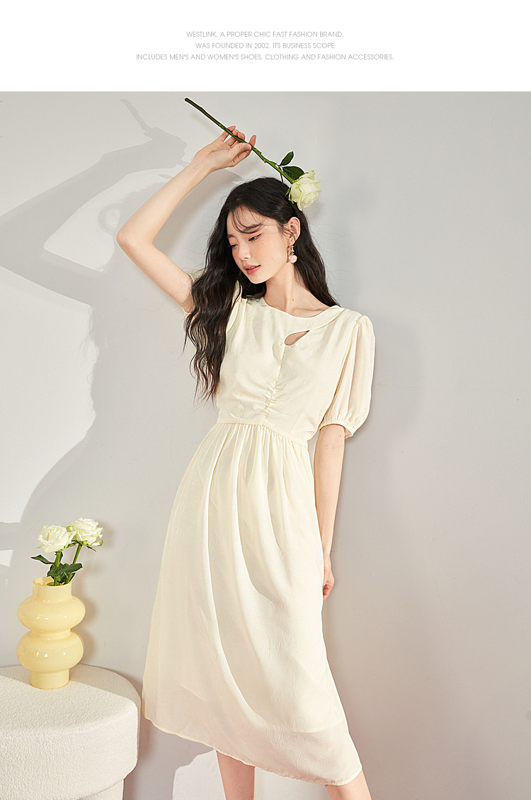 镂空泡泡袖连衣裙女夏季新品收腰抽褶浪漫小伞裙子女夏V0930749