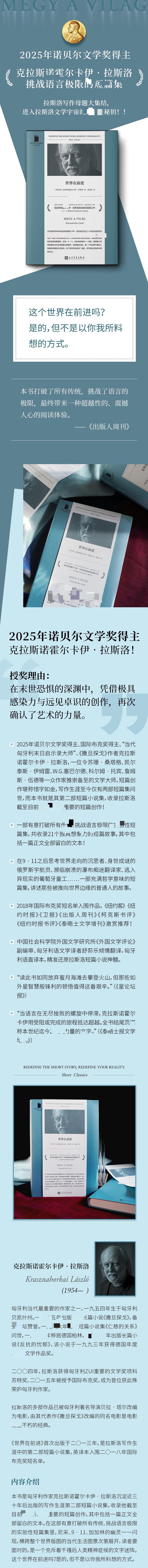 这个世界在前进吗?是的,但不是以你我所料想的方式。 国际布克奖得主、“当代匈牙利末日启示录大师”、《撒旦探戈》作者克拉斯诺霍尔卡伊·拉斯洛,一位令苏珊·桑塔格、凯尔泰斯·伊姆雷、W.G.塞巴尔德、科尔姆·托宾、詹姆斯·伍德等一众作家推崇备至的文学大师,短篇创作堪称惜字如金,写作生涯至今仅有两部短篇集问世,而本书就是其第二部短篇小说集,收录拉斯洛截至目前、最重要的短篇创作! 一部有意打破所有传统、挑战语言极限的实验性短篇集,共收录21个极具想象力的短篇故事,其中包括一篇正文全部留白的文本! 在9·11之后思考世界走向的沉思者、身世成谜的俄罗斯宇航员、濒临崩溃的瀑布痴迷翻译家、逃入异现实的葡萄牙童工一部充满哲学意味的短篇集,讲述那些被推向世界边缘的普通人的故事。 2018年国际布克奖短名单入围作品,《纽约客》《纽约时报》《卫报》《出版人周刊》《柯克斯书评》《纽约时报书评》《泰晤士文学增刊》激赏推荐! 中国社会科学院外国文学研究所《外国文学评论》副编审、匈牙利语文学译者舒荪乐倾情翻译,匈牙利语直译本,精准还原拉斯洛短篇小说神髓。 “融合果戈里、布尔加科夫、贝克特与伯恩哈德的精髓,创造出既具挑衅性又十足动人的独特叙事。21个故事中绵长的句子揭示:人类思想与言语永不停止,只会暂停。”(《泰晤士文学增刊》) “读此书如同放弃蜜月海滩去攀登火山,但那些如外星智慧般锋利的顿悟值得这番艰辛。”(《星论坛报》) “当语言在无尽挫败的螺旋中停滞,克拉斯诺霍尔卡伊用受阻或完成的旅程抵达超越。全书最终页堪称本世纪迄今力量的文字。”(《泰晤士报文学增刊》)