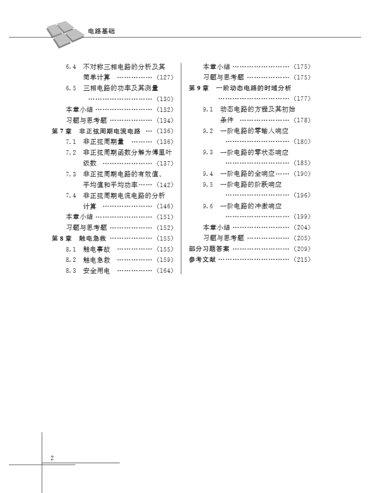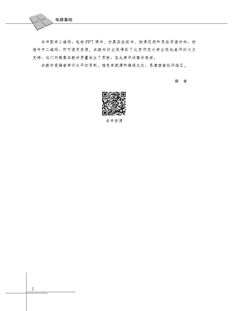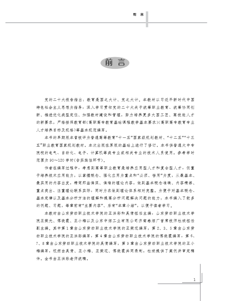本书系统地介绍了电路理论的基本概念、基本理论和基本分析方法。全书共九章,主要内容有:电路的基本概念和基本定律、线性电阻电路、电路定理、正弦电流电路、耦合电感和谐振电路、三相电路、非正弦周期电流电路、二端口网络和动态电路的过渡过程时域分析。本书系统完整,例题丰富,适应面较宽。本书配有思政相关材料,以及微课视频,扫码可以观看。本书适合于作电气、自动化、电子、计算机等类专业的普通高职高专电路基础课程教材,也可以供相关专业的技术人员参考。