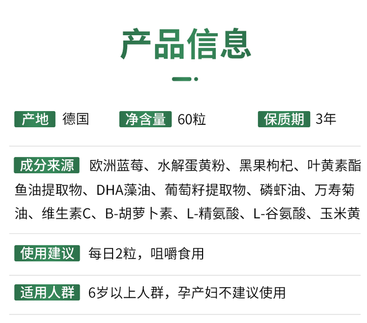 | 【品名】德国原装进口 BERKOW伯科蓝莓叶黄素酯软糖 60颗/盒 【规格】60颗*1盒;60颗*2盒 【产地】德国 【保质期】3年 【发货包装】独立包装瓶 【发货地】河南郑州 【发货快递】圆通,中通,申通,韵达随机发 【不发货区域】港澳台 【补邮费地区】甘肃、青海、内蒙、宁夏+6元 ,新疆、西藏+15元 【发货时效】48-72小时,周末节假日顺延 |