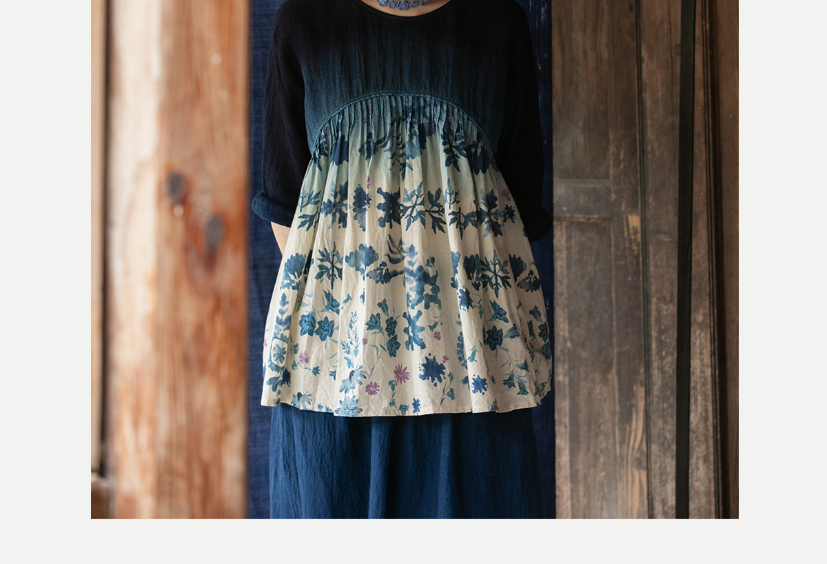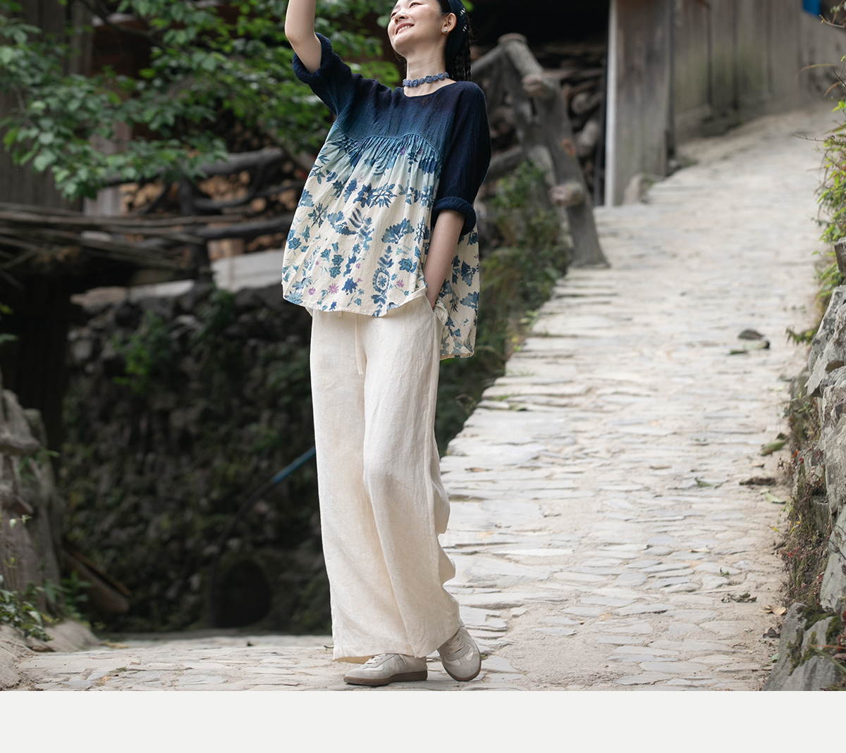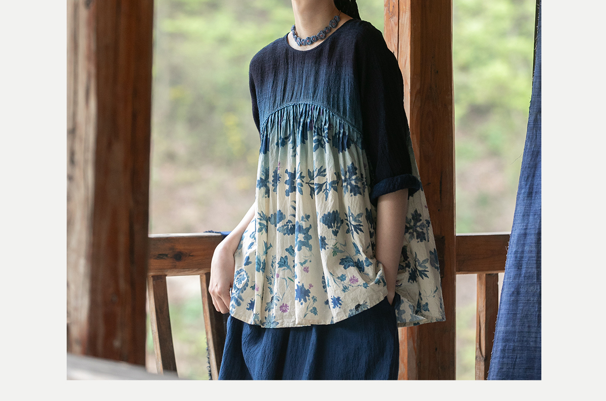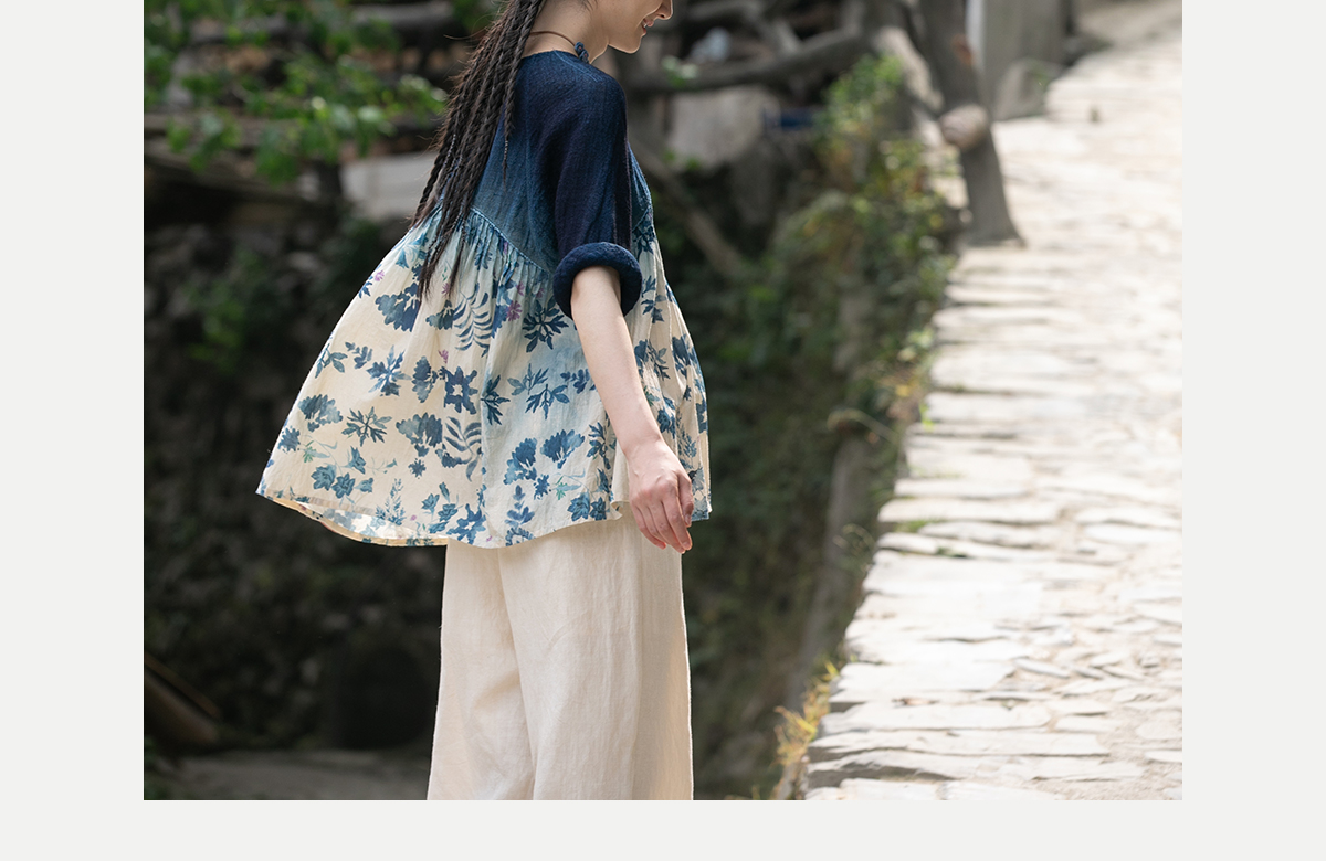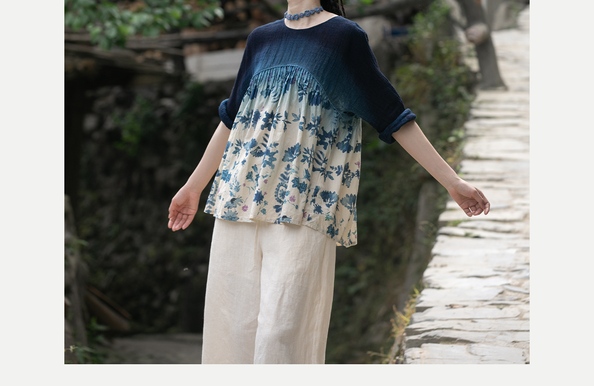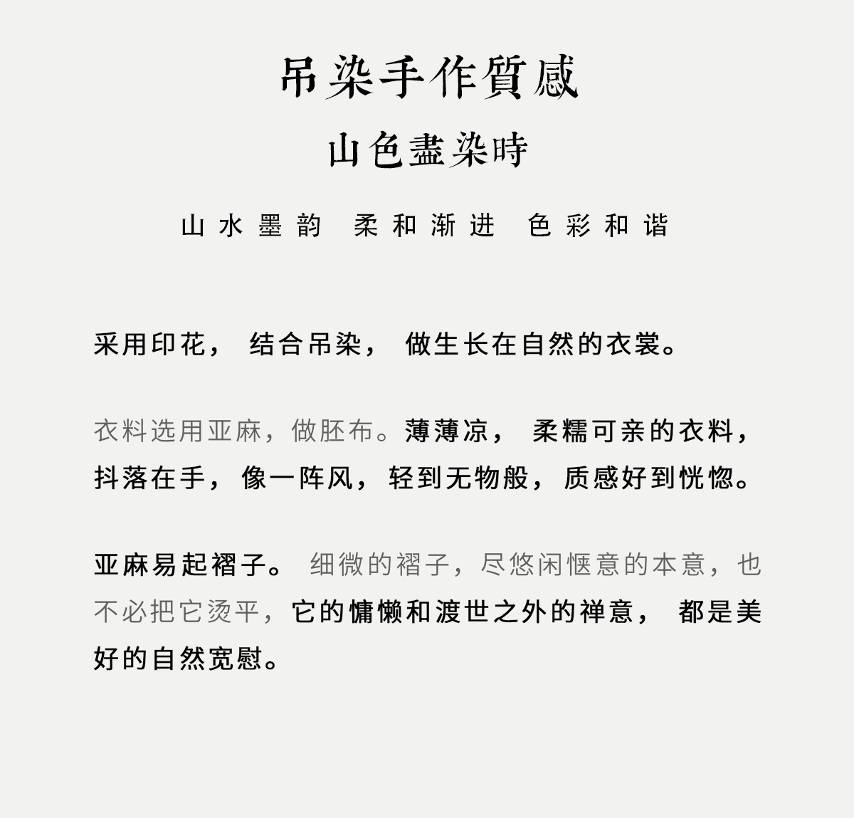 牧衣游原创 吊染蓝染印花亚麻套头衫渐变质朴复古文艺上衣 山水青