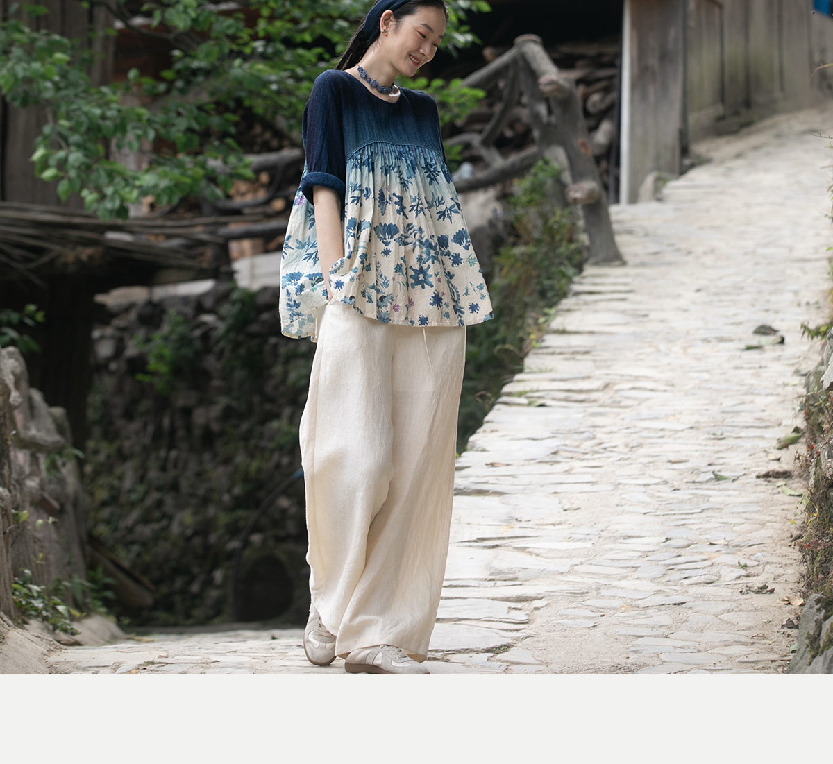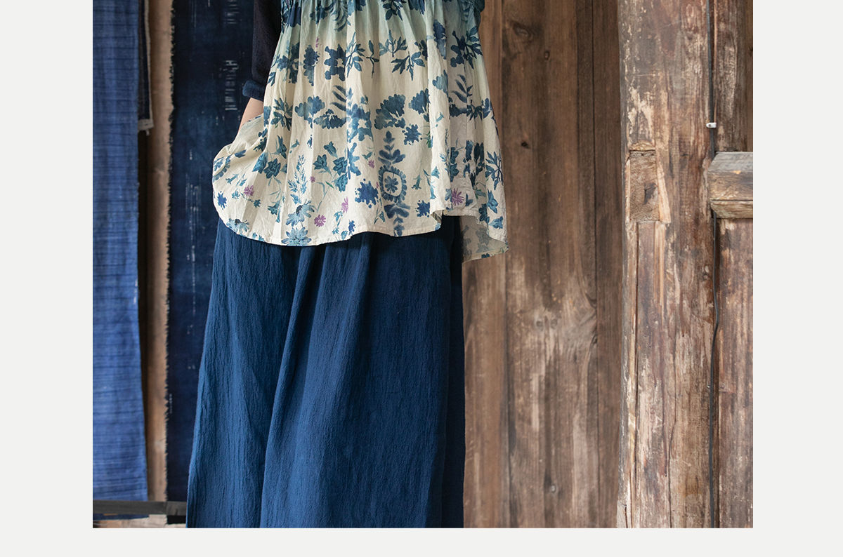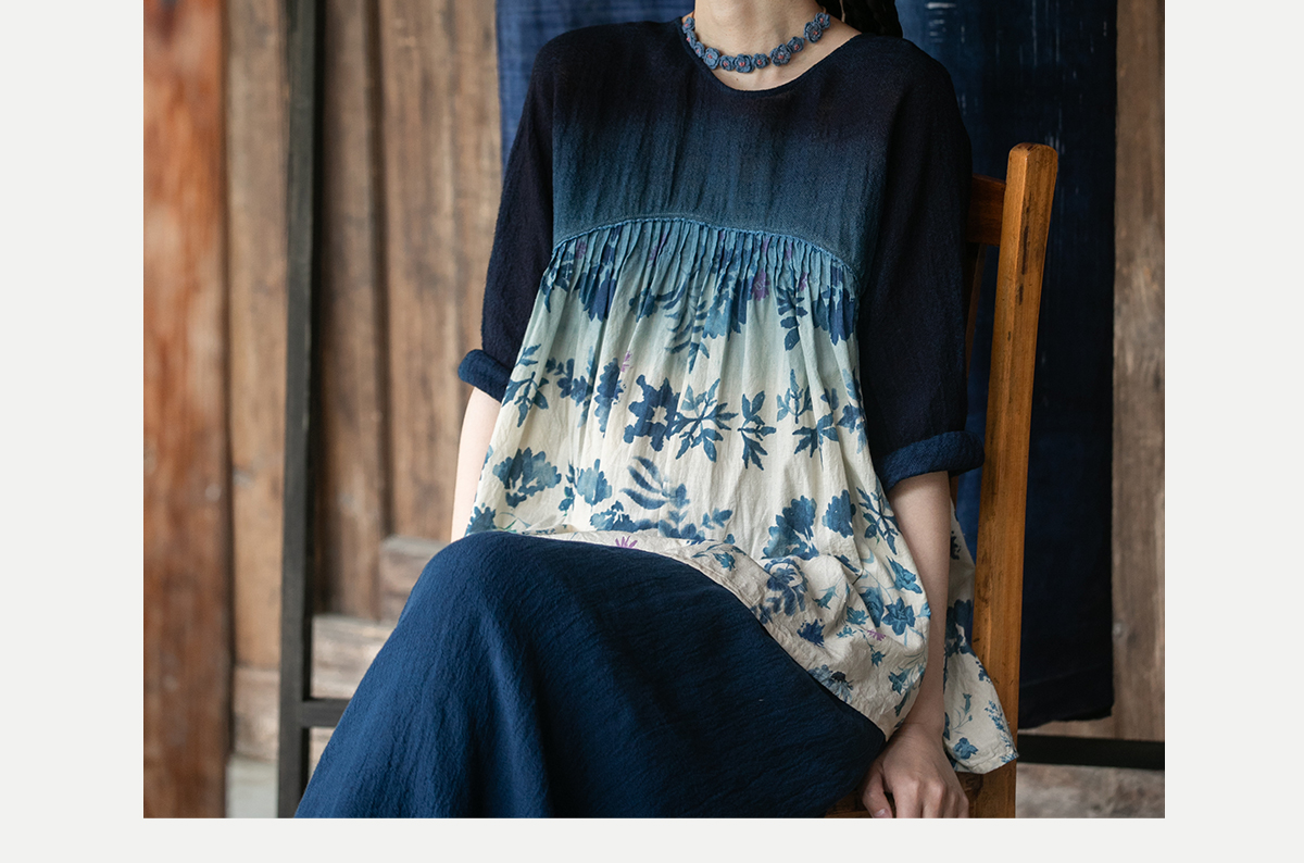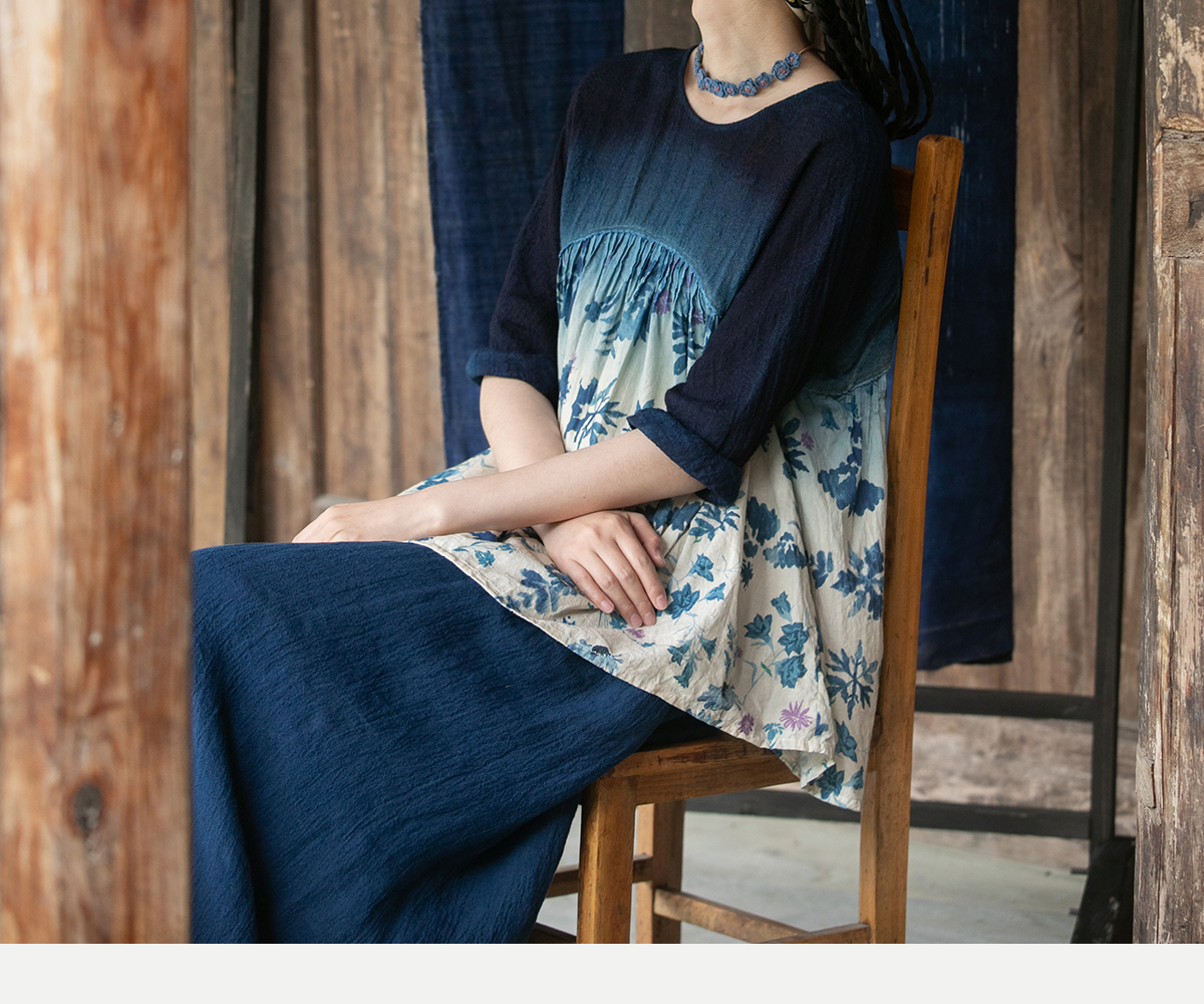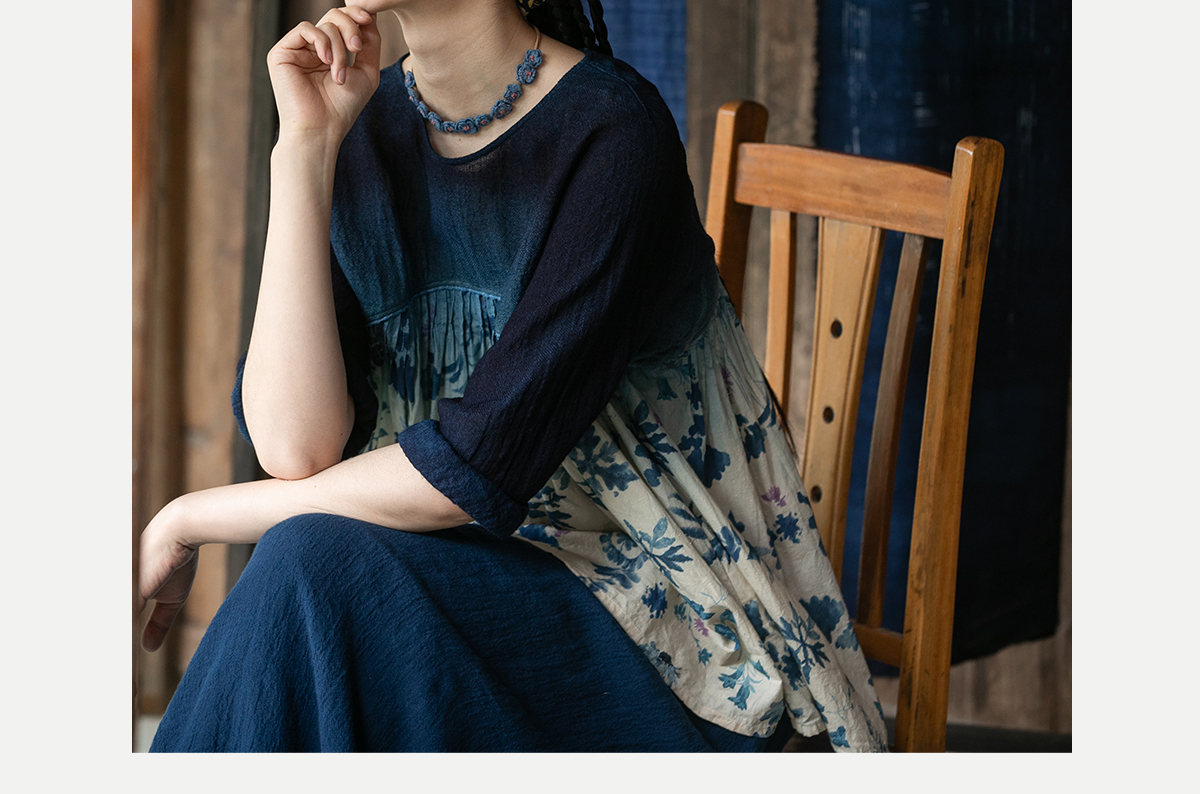 牧衣游原创 吊染蓝染印花亚麻套头衫渐变质朴复古文艺上衣 山水青